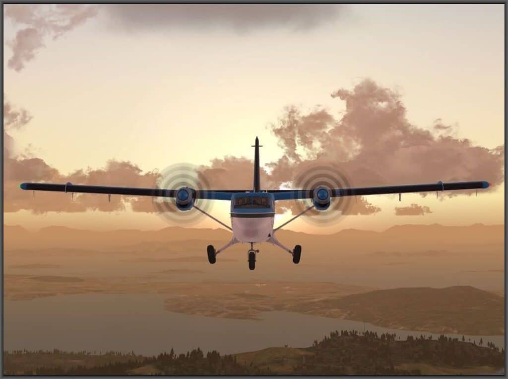 Auch einen sogenannten Beta Range Bereich gibt es. In diesem befindet man sich, wenn die Twin Otter am Boden rollt. Der Anstellwinkel des Propellers ist dann sehr gering. Ist der Anstellwinkel gleich Null, dann erzeugt der Propeller überhaupt keine Schubkraft mehr. Auch ein negativer Anstellwinkel ist im Beta Range Bereich möglich. Er wird dazu benötigt die Twin Otter rückwärts rollen zu lassen, was ebenfalls simuliert wird. Man zieht dazu einfach den Schubhebel in den Reverse Bereich. Dies aber bitte langsam, da sich sonst die Twin Otter wie ein Hengst aufstellt! Die Twin Otter ist zwar vor einem Tailstrike geschützt, da sie einen Hecksporn (Tailbumper) besitzt, der das Flugzeug vor Beschädigungen am Heck schützt. Trotzdem sollte das Entstehen einer solchen Situation tunlichst vermieden werden. Denn wenn das Flugzeug nach vorne auf das Bugrad zurückfällt, dann kann nicht ausgeschlossen werden, dass hierbei die hydraulische Bugradfederung beschädigt wird. Und dies, trotz des robusten Fahrwerks der Twin Otter. Den größten Anstellwinkel hat der Propeller, wenn er in Segelstellung gebracht wird. Dies ist zum Beispiel dann wichtig, wenn eine Turbine beim Start ausfällt. Ist dies der Fall, dann erzeugt der Propeller plötzlich keinen Schub mehr, sondern wirkt, aufgrund des flachen Anstellwinkels der Propellerblätter, ganz im Gegenteil wie eine gewaltige Bremse. Das muss unbedingt vermieden werden, indem die Blätter automatisch in die Segelflugstellung (Feathering) gebracht werden. Dieses Ereignis, das man keinem Piloten in der realen Welt wünschen möchte, wird von der Simulation recht gut nachgestellt. Die Auswirkungen eines Propellerstillstands auf das Flugverhalten und die erforderlichen Gegenmaßnahmen können hier ausführlich ausprobiert werden.