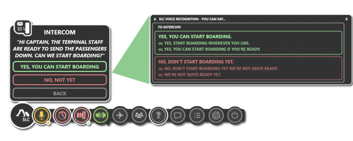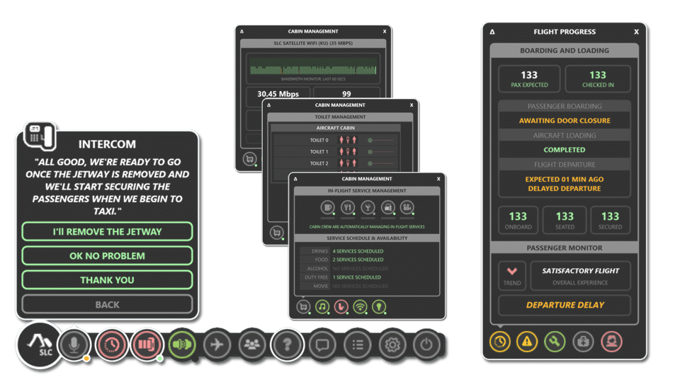 - Realistische In-Flight-Ansagen über Intercom, Lautsprechersystem und Bodenfunk.