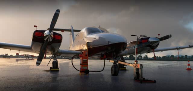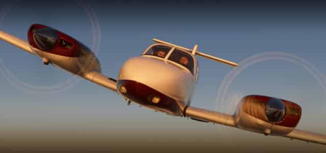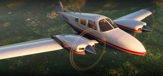 Das Flugzeug verfügt über zwei gegenläufige Lycoming O-360-E1A6 Motoren, die ihm eine bemerkenswerte Stabilität verleihen. Das Modell von Carenado ist mit traditionellen Instrumenten ausgestattet und bietet eine hochwertige visuelle Darstellung. Sowohl das Äußere als auch das Cockpit sind detailliert gestaltet und überzeugen mit realistischen Texturen. Die Geräusche des Flugzeugs, wie der Klang der Motoren und das Ein- und Ausfahren des Fahrwerks, sind ebenfalls gut umgesetzt. Das Flugzeug lässt sich unter normalen Flugbedingungen leicht steuern, bietet jedoch auch Herausforderungen durch Wettereffekte wie Turbulenzen und starke Seitenwinde.