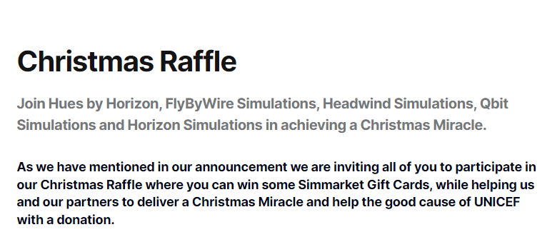 Die Spendenaktion wird mit der Zusammenarbeit von FlyByWire, Horizon, Headwind und Qbit organisiert. Mit etwas Glück kann man beim Spenden ein Geschenkgutschein mit verschiedenen Beträgen für den Simmarket Shop gewinnen. Alle „Spielregeln“ sind auf der Webseite der Spendenaktion gelistet, welche hier zu finden ist.