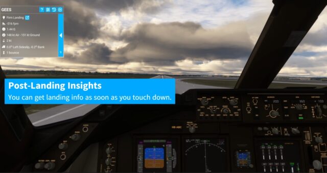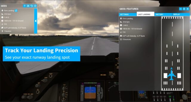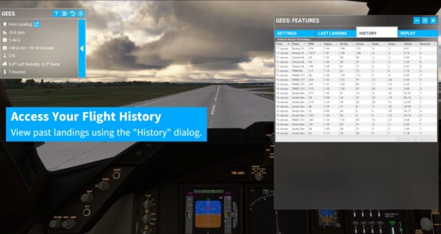 Mit GEES können Benutzer wichtige Parameter ihrer Landungen auswerten, darunter die Landegeschwindigkeit, G-Kräfte, die Anzahl der Aufsetzer sowie die Genauigkeit der Landeposition. Das Addon liefert auch Daten über Windgeschwindigkeit und -richtung zum Zeitpunkt der Landung, was besonders für die Analyse von Landungen unter schwierigen Wetterbedingungen nützlich ist.
