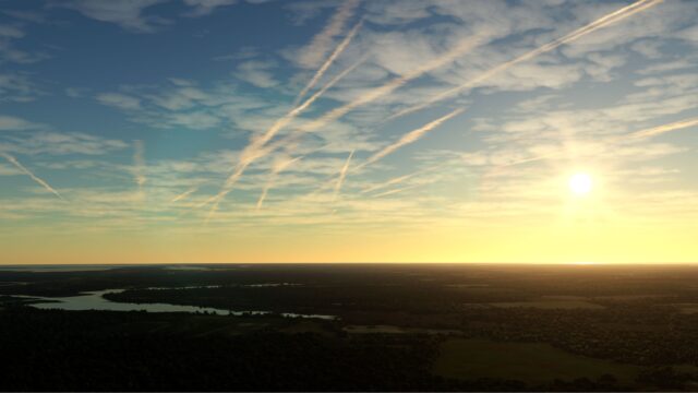 Mit den ‚Extended Contrails‘ transformiert SimFX den Himmel, indem es bestehende Kondensstreifen erweitert und so ausgedehnte, dauerhafte Linien am Horizont schafft. Diese Technologie passt sich den Wetterbedingungen an, um jedes Trail natürlich authentisch erscheinen zu lassen.
