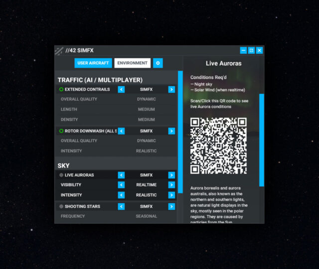 SimFX ist eine umfassende „Visual Effects Utility“, die eine Vielzahl von immersiven Szenarien abdeckt. Von den Entwicklern, die bereits den Goldstandard für VFX in FSX und Prepar3D gesetzt haben, bringt SimFX diese Expertise nun zu MSFS. Jedes Partikel auf dem Bildschirm wird authentisch durch Umgebungsvariablen und Formeln gesteuert. Die Effekte sind dynamisch und erscheinen nur unter den richtigen Bedingungen, um magische Momente am virtuellen Himmel zu schaffen.