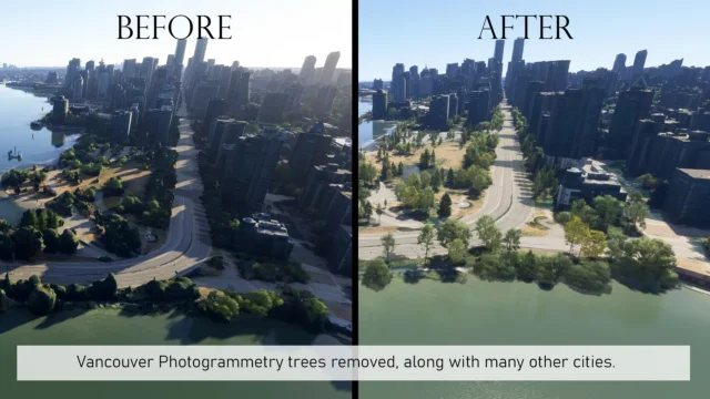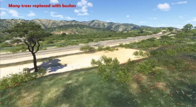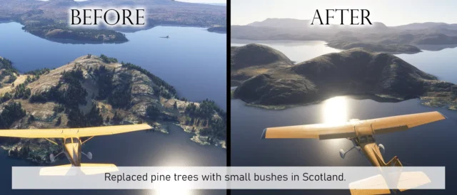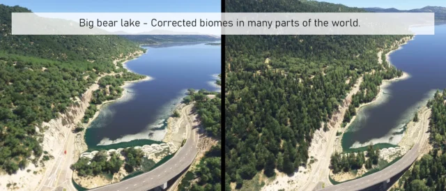 Das Add-on ersetzt generische oder photogrammetrische Platzhalterbäume durch regionaltypische Vegetation. So werden beispielsweise Palmen entlang der Pazifikküste hinzugefügt. Zudem korrigiert es übersättigte Farben und passt Biome an, um spezifische Landschaften wie Bananenplantagen oder Küstendünen akkurat darzustellen. Es behebt auch saisonale Ungenauigkeiten in der südlichen Hemisphäre.