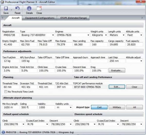 Wenn man es ganz genau will, bedürfen die hinterlegten Profile verschiedener Flugzeugmodelle übrigens einer detaillierten Anpassung bei den Gewichten und teilweise auch den Verbräuchen. Im Forum finden sich hierzu einige lesenswerte Anmerkungen. Das liegt beileibe aber nicht an schlampiger Programmierung, sondern im Realitätsanspruch des Programmes und verschiedener Add-on-Hersteller wie PMDG. Praktisch kein Airliner gleicht dem anderen! Bei allen professionellen Planungsprogrammen der Industrie hat tatsächlich jeder Flieger „sein“ Profil. Manche 747 sind eben durstiger wie andere, dafür fliegen sie aber etwas langsamer… Diese Fummelei habe ich mir persönlich aber noch gespart. Es geht auch gut ohne. Erwähnt gehört es trotzdem, denn hier wird das „Fliegen nach Zahlen“ Wirklichkeit.