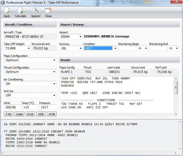 Dann machst Du Deinen Plan, und gehst am Ende im PFPX auf den Button Take-off – schwupps, schon öffnet sich ein Fenster, wie man es von TOPCAT kennt – also alles schön eingeben bzw. checken. Wenn Du jetzt noch calculate drückst, kriegst Du Deine Konfiguration geliefert.