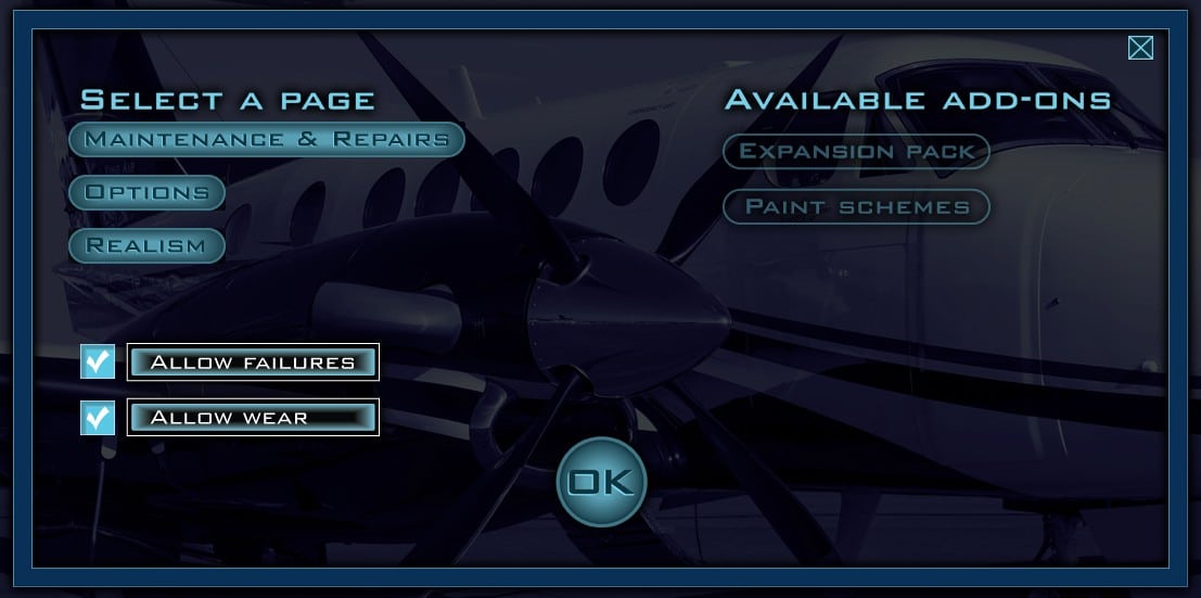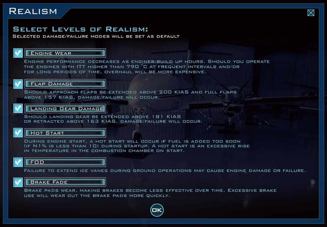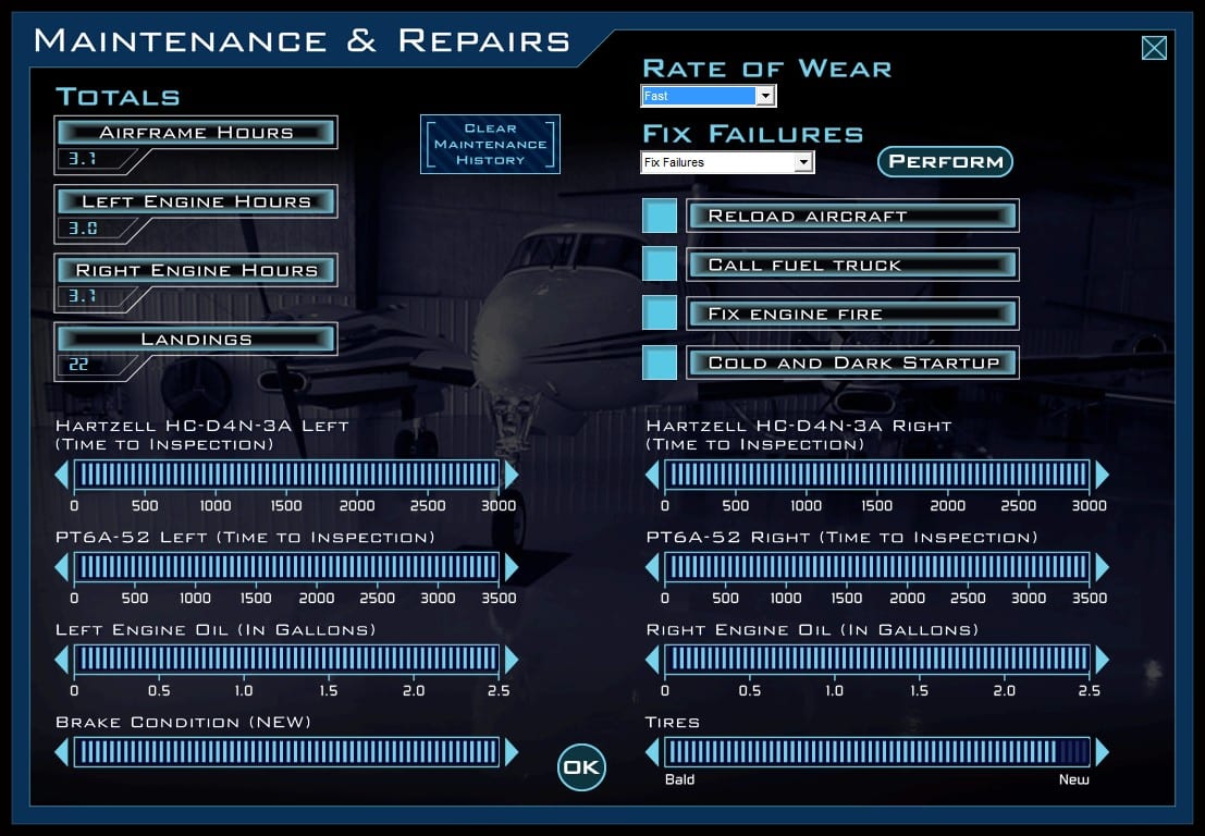 Die Modellierung des Turbinenantriebs unterscheidet sich zwar vom FSX-Default-Modell. Die Tiefe der Majestic Dash 8 Q400 wird jedoch bei weitem nicht erreicht. Es ergibt sich eine etwas „holprige“ Bedienung, gerade in der ß-Range und des Reversers. Trotzdem kann eine Fehlbedienung eklatante Folgen haben (‚hot start‘); auch ein in-flight-relight ist realistisch machbar. Mit geladener Maschine wird via FSX-Menü ein Tool – das Maintenance Module – aufgerufen. Hier können weit über den FSX hinaus Verschleiß und Fehleranfälligkeit von Triebwerken, Klappen und anderen Systemen bestimmt werden.