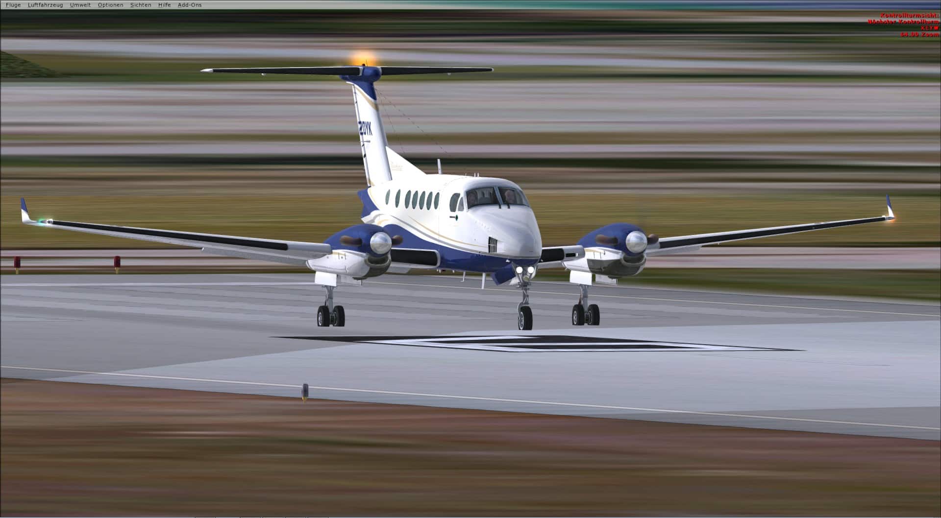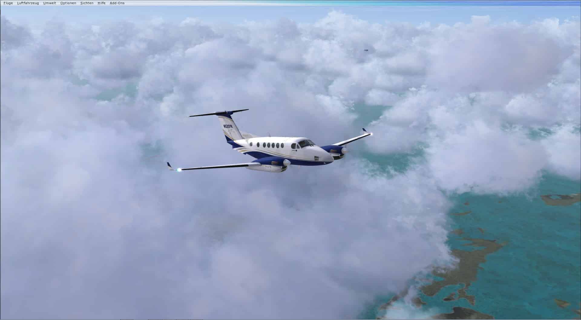 Die Flugeigenschaften einer Twin sind für mich recht glaubhaft abgebildet. Ein Triebwerksausfall bei v1 lässt einen wirklich schwitzen! Die Maschine lässt sich manuell grosso modo gut fliegen, wobei der Stubenpilot hier in einem janusköpfigen Flugzeug unterwegs ist: manchmal fühlt sich die Maschine an wie ein übermotorisierter zickiger GA-Turbinen-Zweimot, manchmal ist sie gemächlich und träge wie ein Airliner. Ob das der Realität entspricht, weiß ich natürlich nicht. Aber ganz so gutmütig und leicht zu fliegen, wie die King Air verschiedentlich beschrieben wird, hat Flight1 sie nicht programmiert.
