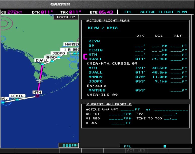 unterwegs auf FL180, 20 nm vor dem TOD: Anflugplanung (hier: KMIA CURSO2.MTH ILS 09)