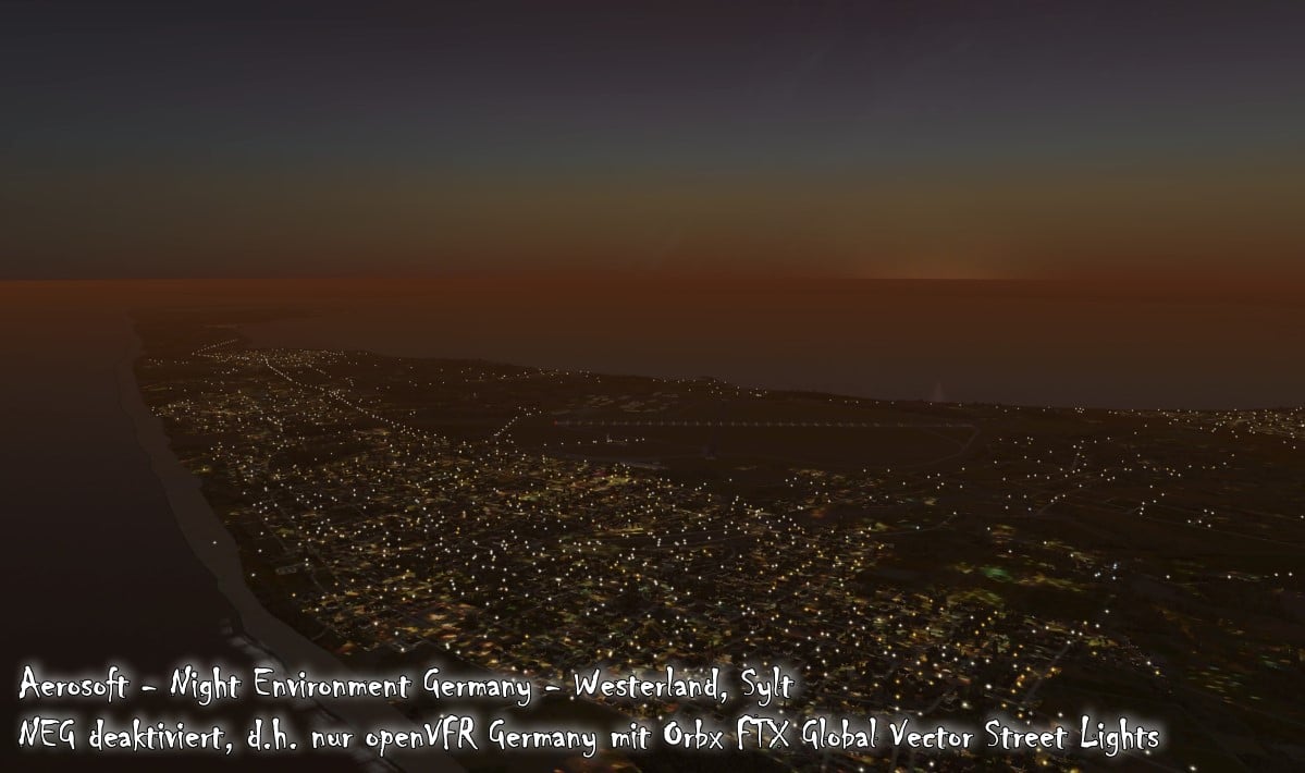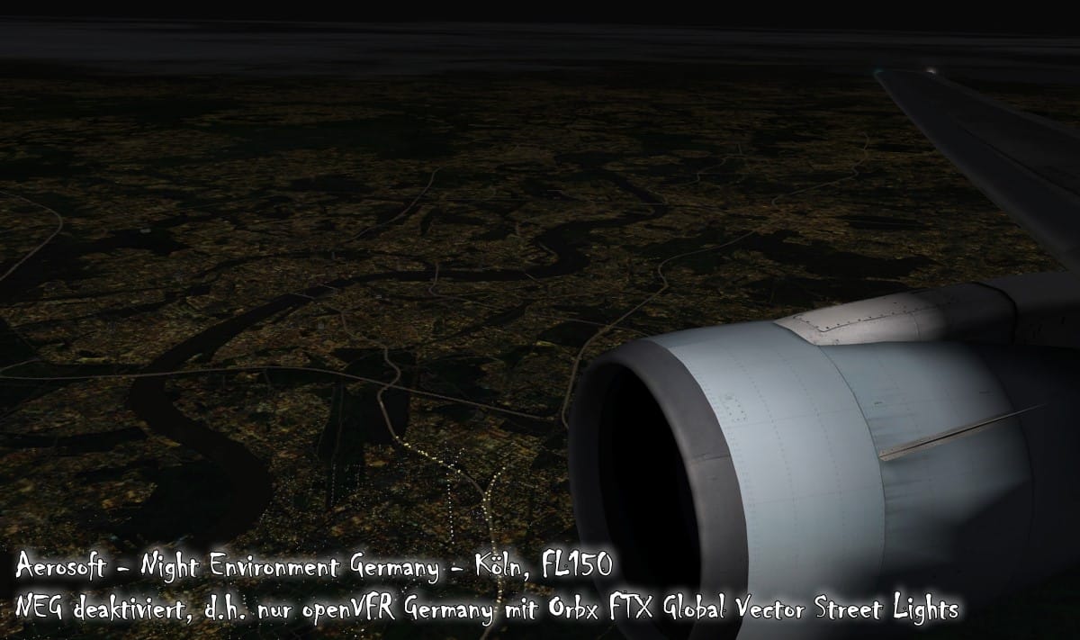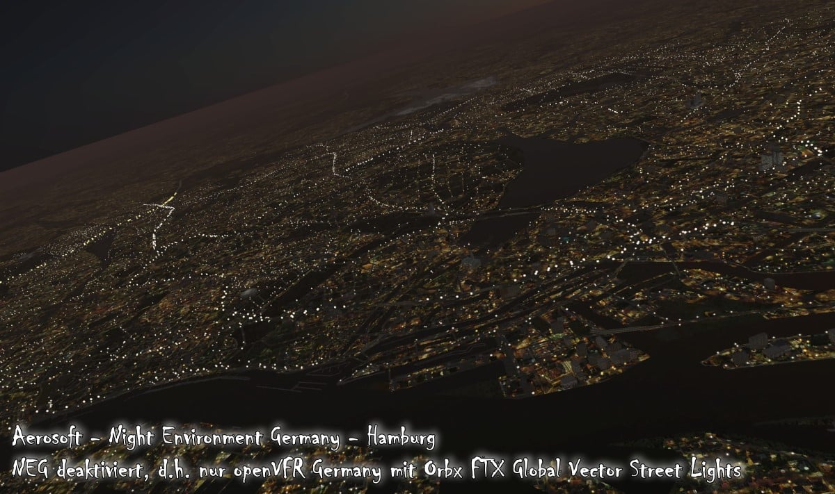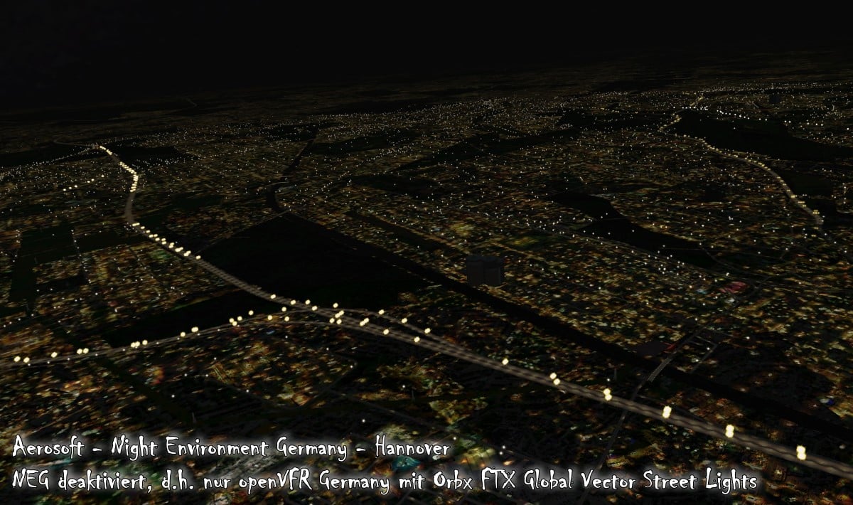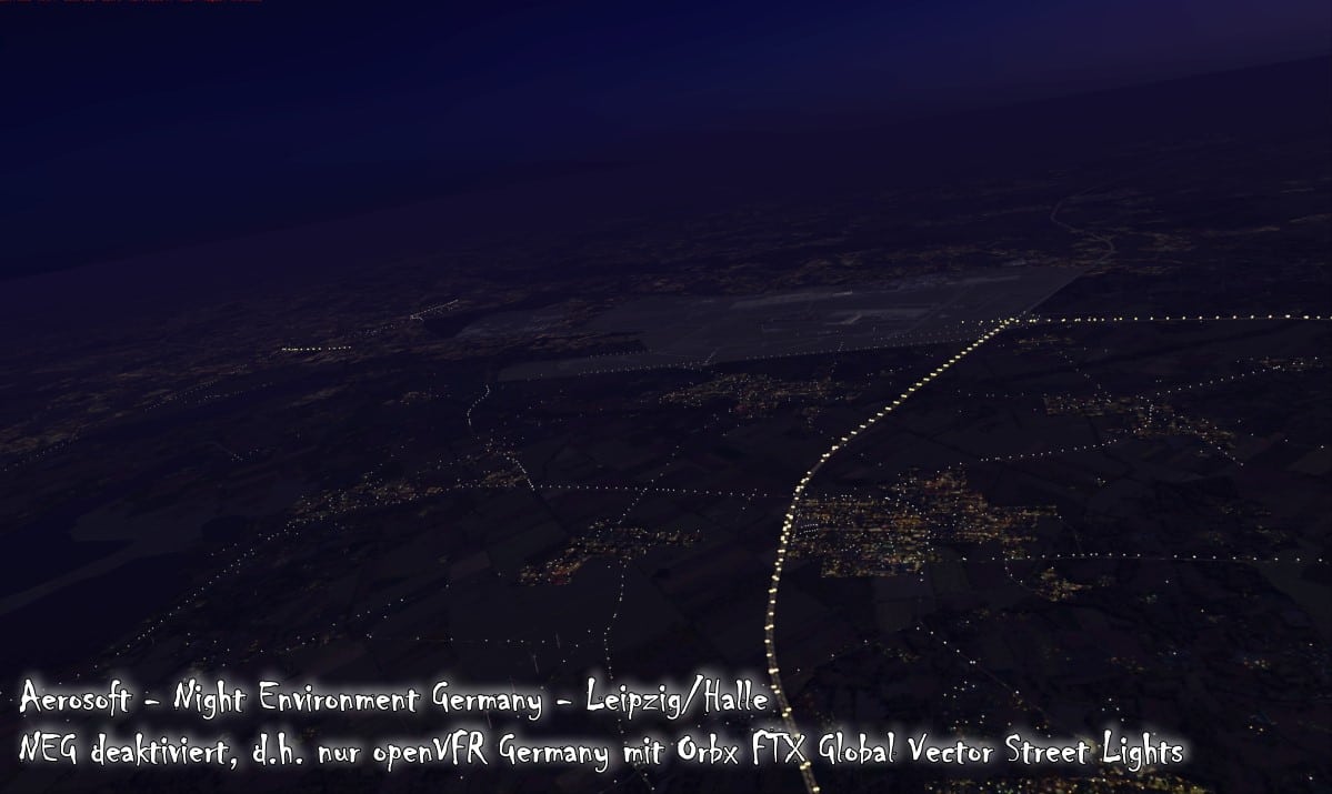 da Luftbildszenerien georefenziert sind und auch Night Environment georeferenziert ist, wirst Du auf der Luftbildszenerie die Lichtpunkte an der richtigen Stelle finden (siehe meine Screenshots mit VFR Germany 3). Wenn Du zusätzlich auch noch eine Vektorszenerie aktiv hast, wie bspw. Orbx Global Vector, dann fügen sich die Lichtpunkte von Orbx und von Night Environment gemeinsam in die Szenerie ein. Da auch eine Vektorszenerie georeferenziert ist, geschieht dies an der richtigen Stelle.