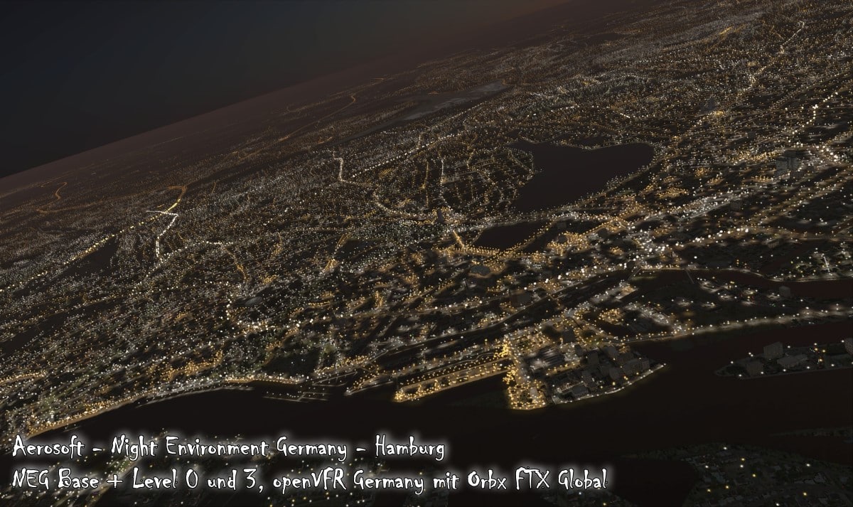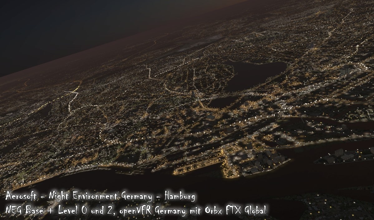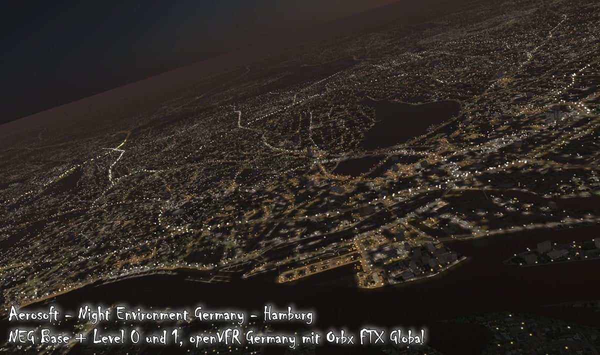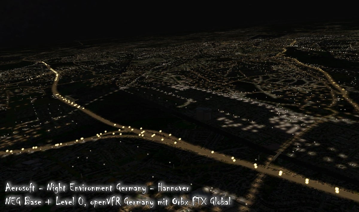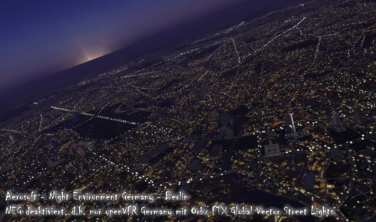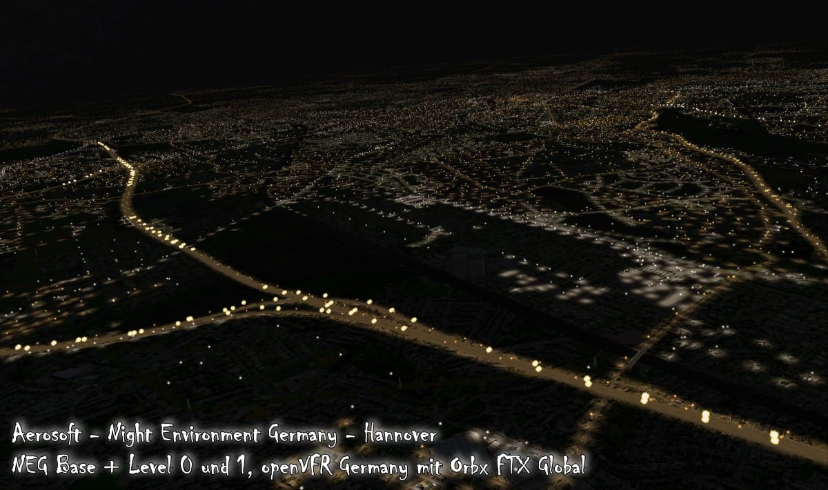 da Luftbildszenerien georefenziert sind und auch Night Environment georeferenziert ist, wirst Du auf der Luftbildszenerie die Lichtpunkte an der richtigen Stelle finden (siehe meine Screenshots mit VFR Germany 3). Wenn Du zusätzlich auch noch eine Vektorszenerie aktiv hast, wie bspw. Orbx Global Vector, dann fügen sich die Lichtpunkte von Orbx und von Night Environment gemeinsam in die Szenerie ein. Da auch eine Vektorszenerie georeferenziert ist, geschieht dies an der richtigen Stelle.