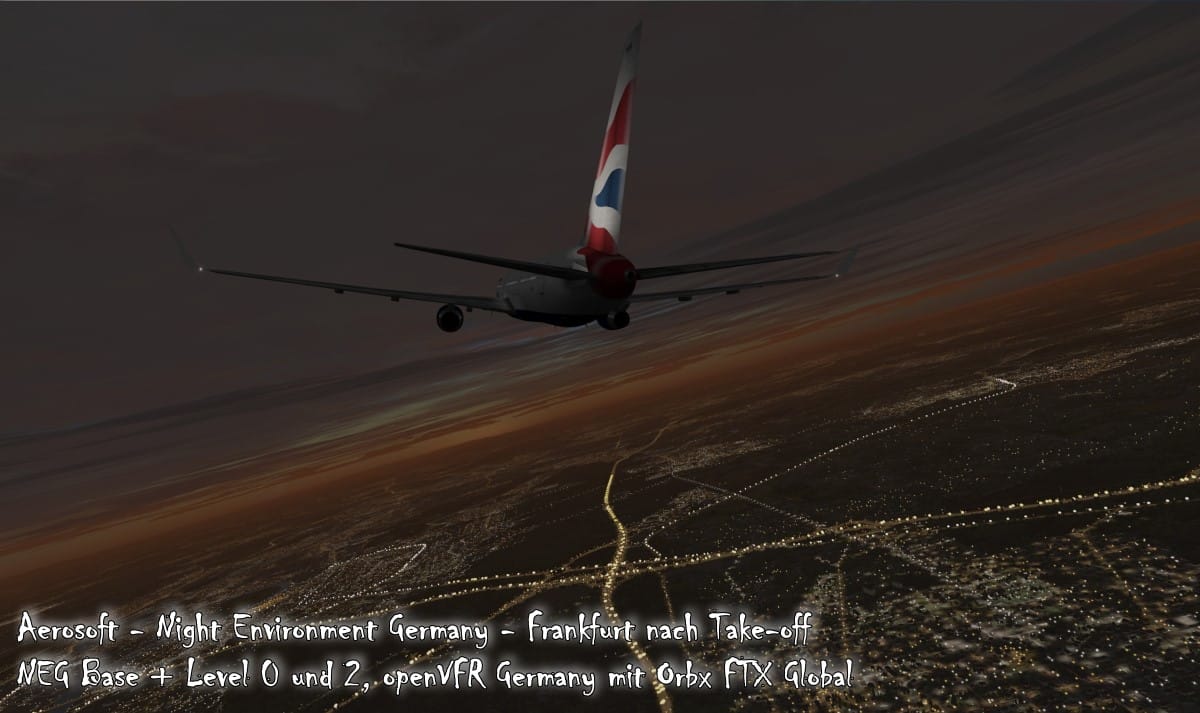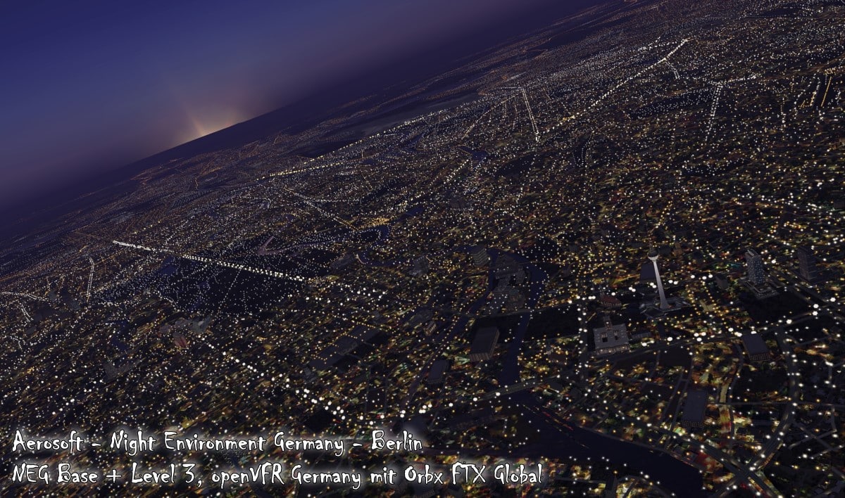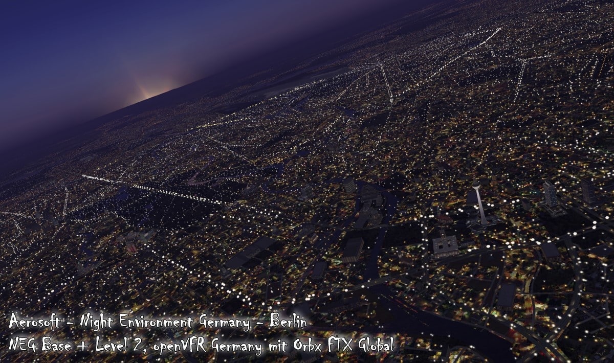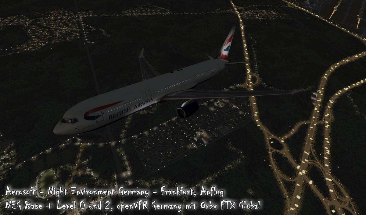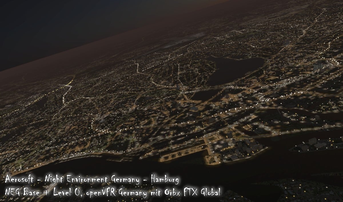 da Luftbildszenerien georefenziert sind und auch Night Environment georeferenziert ist, wirst Du auf der Luftbildszenerie die Lichtpunkte an der richtigen Stelle finden (siehe meine Screenshots mit VFR Germany 3). Wenn Du zusätzlich auch noch eine Vektorszenerie aktiv hast, wie bspw. Orbx Global Vector, dann fügen sich die Lichtpunkte von Orbx und von Night Environment gemeinsam in die Szenerie ein. Da auch eine Vektorszenerie georeferenziert ist, geschieht dies an der richtigen Stelle.