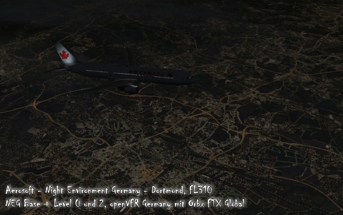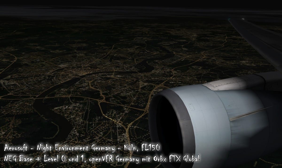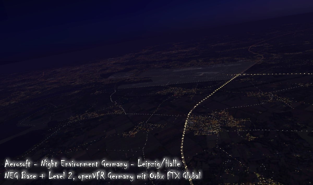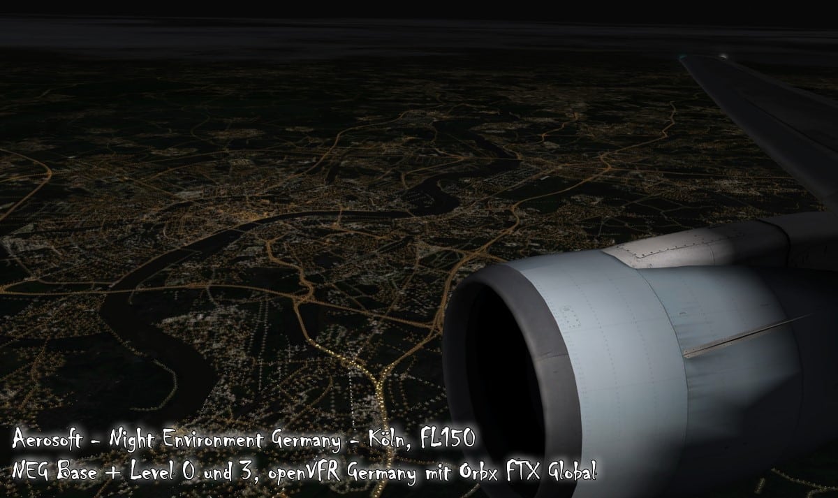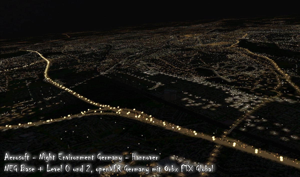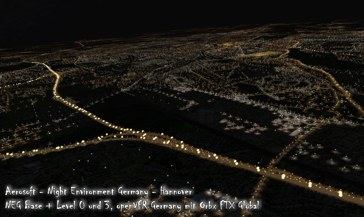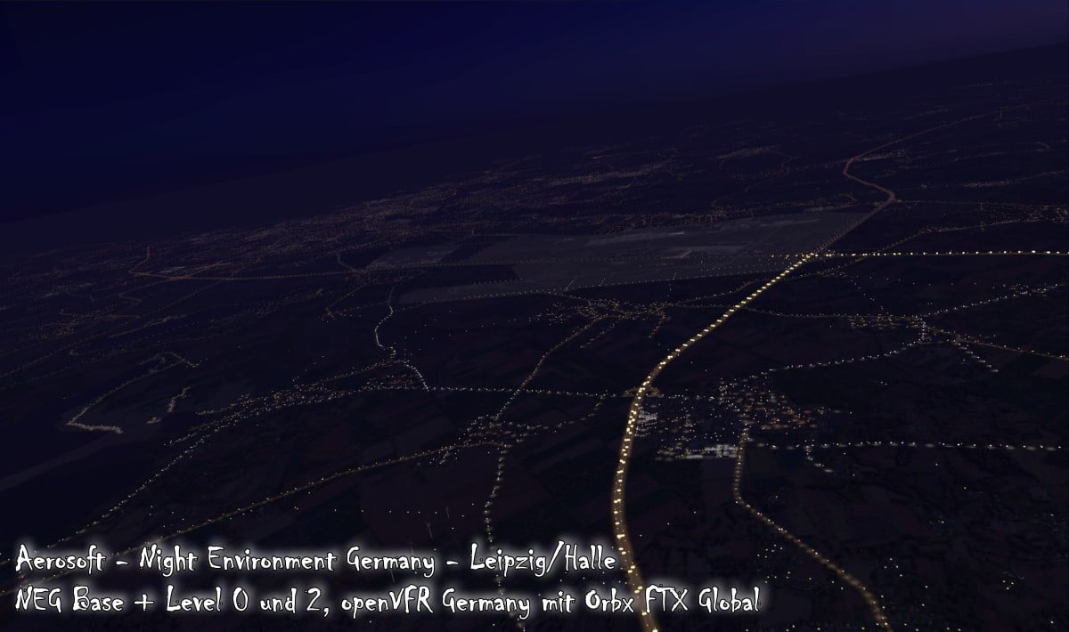 Wer gerne im Dunkeln fliegt, kennt das Problem: Die Nachttexturen sind meistens unrealistisch. Insbesondere, wenn man über Europa fliegt, da die Länder dann völlig unterschiedlich aus der Luft aussehen. Manche Länder beleuchten die Straßen vorzugsweise mit orangen Straßenlaternen, andere Länder hingegen bevorzugen eine rein-weiße Straßenbeleuchtung. Mischformen, wie hierzulande, gibt es auch noch. Hinzu kommt die Gretchenfrage, wo überhaupt Straßenlaternen vorzufinden sind: In bewohntem Gebiet und im Industriegebiet. Das ist klar – aber wie sieht es mit Landstraßen und Autobahnen aus? In denen BeNeLux-Ländern ist man großzügig und beleuchtet auch die Autobahnen. In Frankreich gibt es viele Autobahnen mit Straßenlaternen, wenn auch nicht alle. Und in Deutschland sehen wir höchstens auf Stadtautobahnen Straßenbeleuchtung. Klar, dass ein Addon, wenn es schon länderspezifisch ist, diesen Gegebenheiten Rechnung tragen sollte. Leider ist das bei Germany Night Environment nicht der Fall! Es stellt sich aber die Frage, inwiefern das schlimm ist! Klare Antwort: Es tut ein bißchen weh, aber die Verbesserung, die das Addon bringt, ist wunderbar. Wir sollten uns vor Augen halten, das wir in den vergangenen Jahren sehr verwöhnt worden sind, was die Szeneriedarstellung bei Tag angeht. Was jedoch die Nacht angeht, gibt es nur wenigen Addons – und die begnügen sich allesamt auf einen Austausch der Texturen. Das hat zur Folge, dass die Nachttexturen oft nur bis in eine mittlere Entfernung von der Flugzeugposition dargestellt werden. Doch genau das ist Blödsinn, denn in klaren Nächten kann man aus großen Höhen oft weit über 200 Kilometer weit blicken! Und es kommt hinzu, dass die Default- oder Austauschtexturen nur sehr schwach leuchten. Wer aber schon einmal nachts über dichtbesiedeltes Gebiet, wie bspw. das Ruhrgebiet, geflogen ist, weiss, dass der Boden beinahe „glüht“ – auch noch in großer Entfernung! Genug der lange Vorrede: Designer Chris Bell hat für Night Environment Germany (und seine Schwesterprodukte) ein ganz neues Konzept entwickelt, das aus realistischeren Austauschtexturen und individuellen Lichtpunkten besteht. Letztere sind übrigens georeferenziert; Datengrundlage hierfür sind reale Straßenverläufe. Das wiederum hat den Vorteil, dass die Produktreihe sich wunderbar mit anderen Addons ergänzt, die unter anderem realistische Straßenverläufe beinhalten. Als Beispiele seien hier openVFR Germany, Ultimate Terrain Europe X, Orbx FTX Global Vector angeführt, um einmal die populärsten Addons zu nennen. Die Lichtpunkte von Night Environment Germany sortieren sich dann in die eventuell bereits bestehende 3D-Straßenbeleuchtung aus diesen Addons ein. Manche Addons bieten übrigens die Möglichkeit, die eigene 3D-Straßenbeleuchtung zu deaktivieren, falls einem die Überschneidung weh tun sollte. Natürlich hat der ganze Lichterglanz auch einen erheblichen Nachteil: Die Performance leidet unter den unzähligen neuen Lichtpunkten ganz erheblich! Deswegen bietet Night Environment Germany die Möglichkeit, die Intensität der Lichtpunkte in drei Stufen anzupassen. Es gibt keinen Richtwert, den ich für ideal halten würde – Flugzeuge mit geringem Komplexitätsgrad lassen mehr Rechenpower und Speicherressourcen für Night Environment Germany übrig, während komplexe Addons à la PMDG dies kaum tun. Deswegen ist eine Anpassung je nach verwendeten Fluggerät sinnvoll. Ob Ihr lieber die Nachtaustauschtexturen von Night Environment Germany als Grundlage für die Lichtpunkte oder lieber andere Austauschtexturen verwenden wollt, ist natürlich Geschmackssache und Euch überlassen. Dementsprechend ist die Auswahl in der Szeneriebibliothek folgendermaßen zu verstehen: