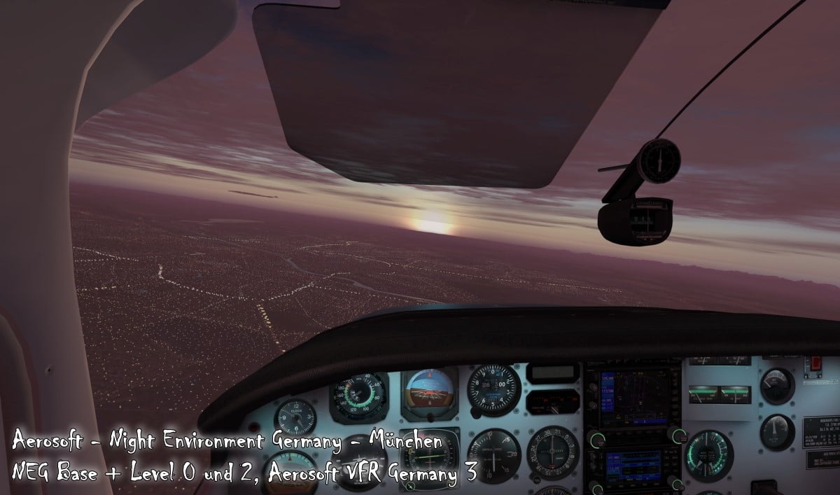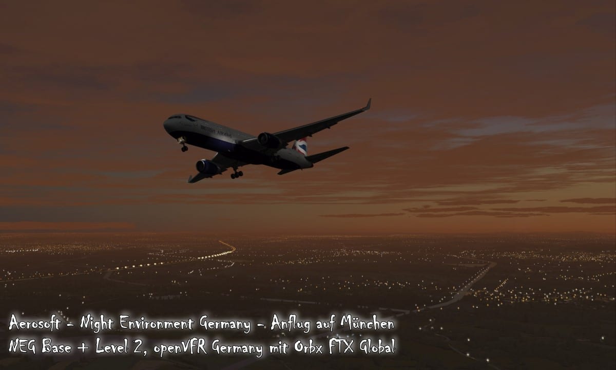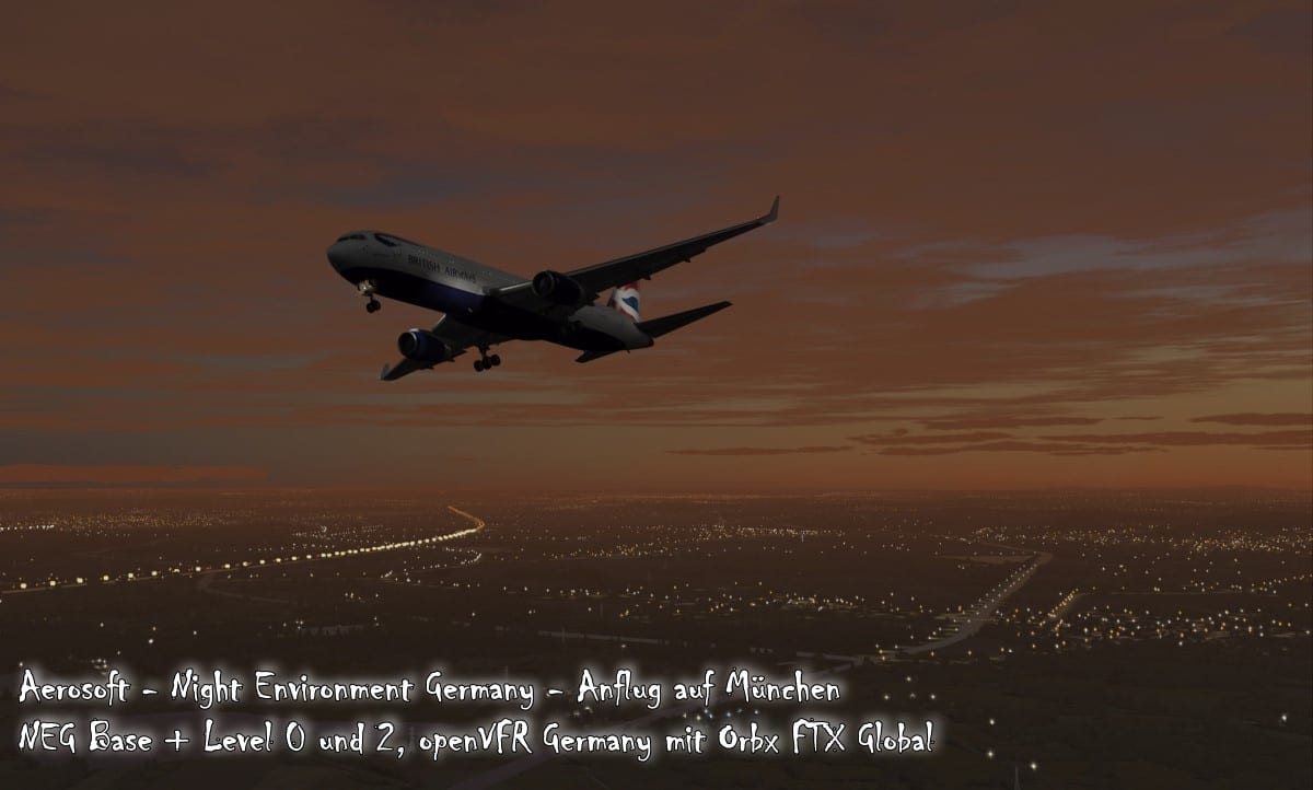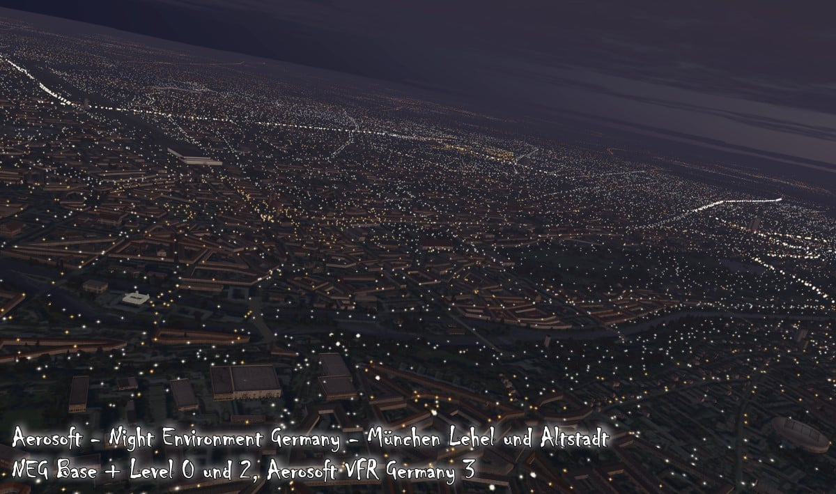 München, verschiedene Testszenarien Abschließend noch ein paar Worte zur Performance: Zwischen „wunderbar“ und „völlig unfliegbar“ ist alles drin! Wenn Ihr nachts mit komplexem Dickblech unterwegs seid, sind konservative Einstellungen empfehlenswert („Level 1“, je nach Geschmack in Verbindung mit den Austauschtextuen von „Level 0“). Denkt immer daran: Die Lichtpunkte sind performance-hungrig, sehen aber auch verdammt gut aus! Seid Ihr hingegen nachts in geringen Flughöhen VFR unterwegs, beispielsweise mit einem Hubschrauber, darf es je nach Rechenpower auch auf „Level 2“ gehen. „Level 3“ setzt wirklich sehr performante Hardware voraus. Denkt in diesem Zusammenhang nicht nur an die Bildwiederholrate, sondern auch an den zur Verfügung stehenden Speicher: Komplexes Addon + AI Traffic + hohe Wolken- oder Bodentexturen + Night Environment Germany = OOM!