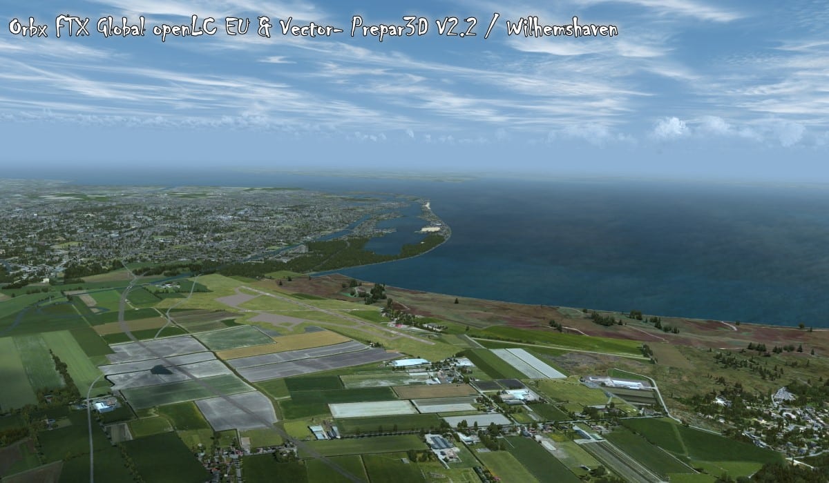 Der Flugplatz von Wilhelmshaven: Ihr könnt deutlich sehen, dass Orbx eine gute Mischung aus fotorealistischen Texturen und handgemalten Texturen hinbekommen hat. Natürlich entsprechen die Fototexturen in diesem Falle nicht exakt den wirklichen Begebenheiten, sie sind ja „nur“ Teil der Landklassen. Aber: Das Industriegebiet mit kleinen Lagerhallen, den Feldern und dem Wäldchen in den Verlängerungen der Pisten stimmen!