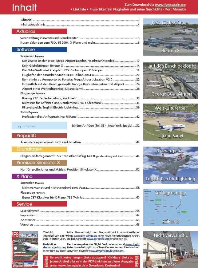 …schaut Euch die Review des Mega Airports London-Heathrow Xtended an, denn der Zweite kann durchaus der Erste sein, kommt mit nach Bergen X, der leider kein Gipfelstürmer ist, lasst Euch von Mike Strasser in die mit openLC Europe komplett gewordene Orbx-Welt entführen, besucht den „Flughafen der dänischen Stadt: Tallinn 2014 X“ und klopft mit dem George Bush Intercontinental Airport ordentlich auf den Busch. Last but not least könnt Ihr mit dem FS MAGAZIN zum Flughafen Lijiang Sanyi in die chinesische Provinz Yunnan reisen.