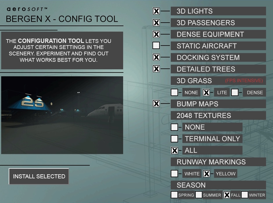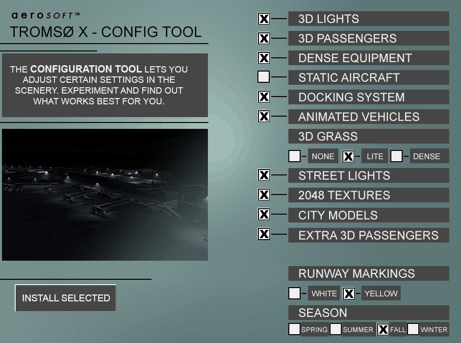 Nach erfolgreicher Installation kann über ein jeweiliges Config-Tool noch Feintuning an den Szenerien betrieben werden. So ist beispielsweise eine höhere Textur-Auflösung (2048 x 2048) möglich, ebenso das Einbinden statischer Flugzeuge. Ferner können Details wie 3D-Gras, -Beleuchtung und -Passagiere ein- bzw. ausgeschaltet werden. Ebenso kann die in Norwegen typische gelbe Runway-Markierung aktiviert werden.