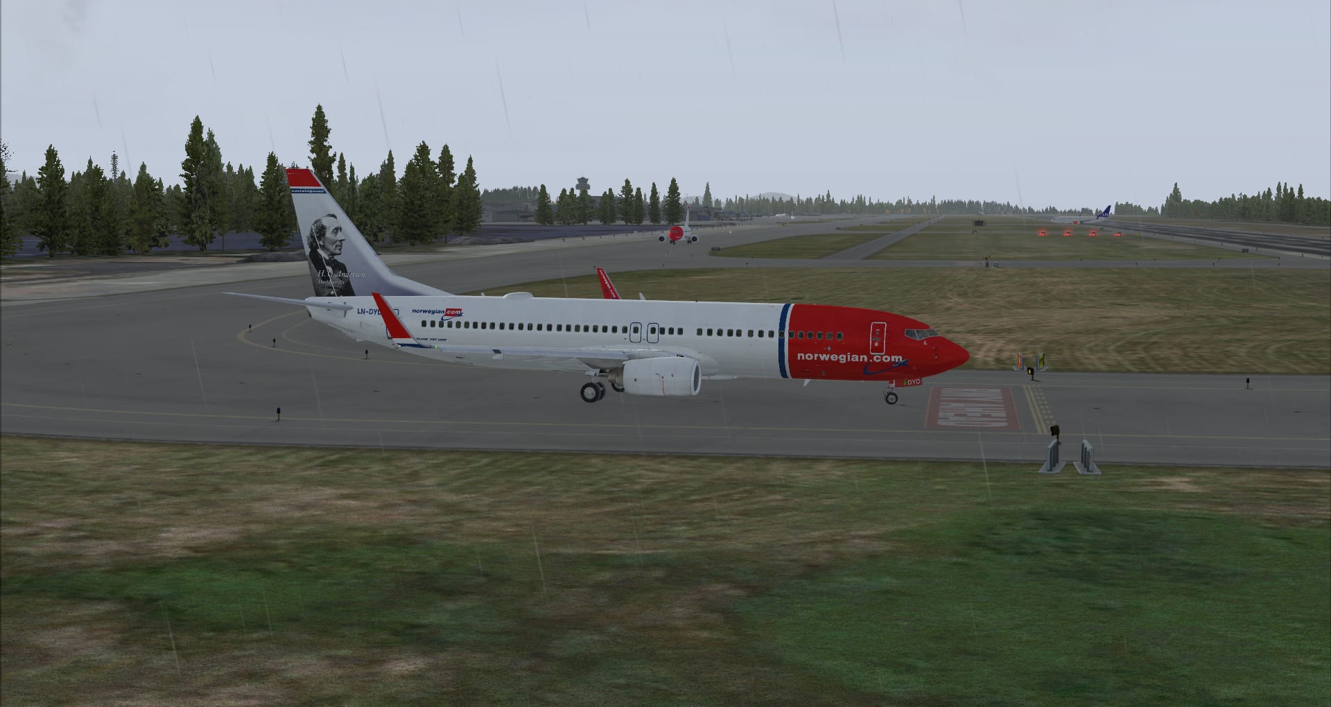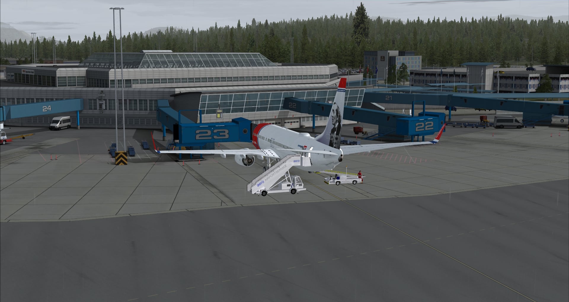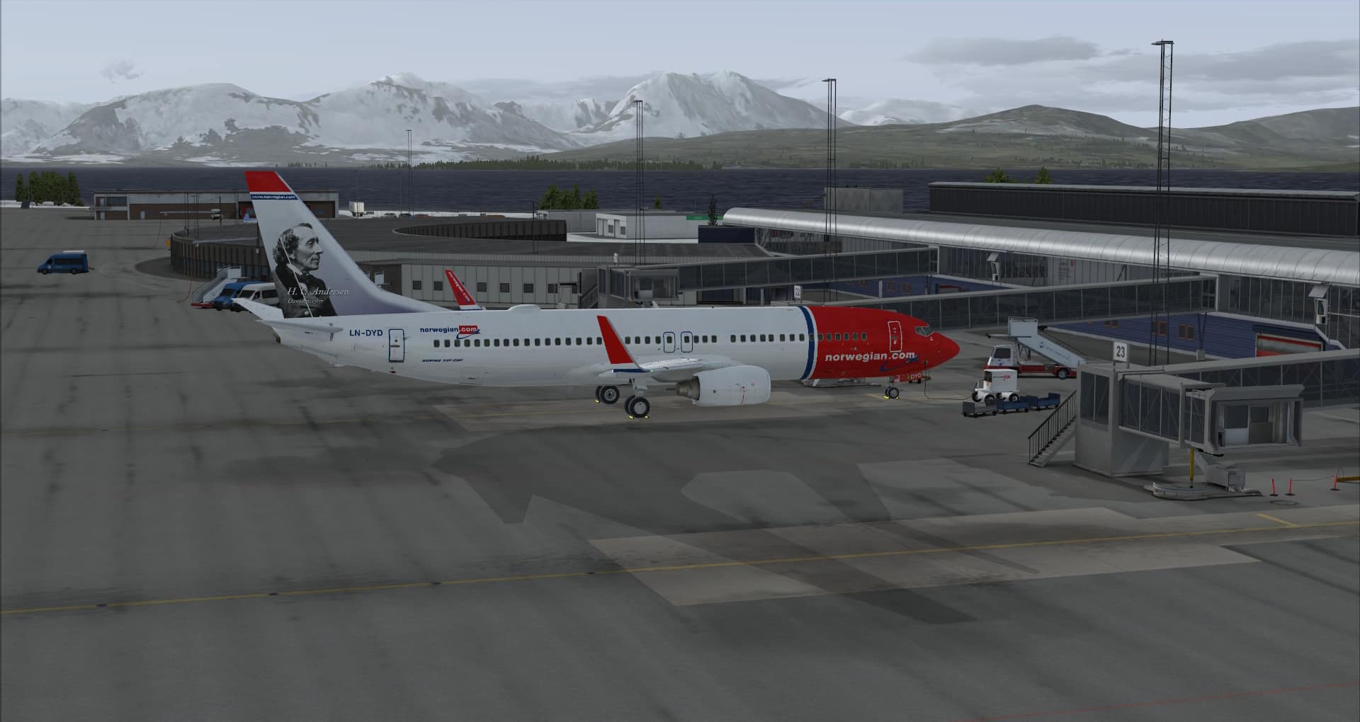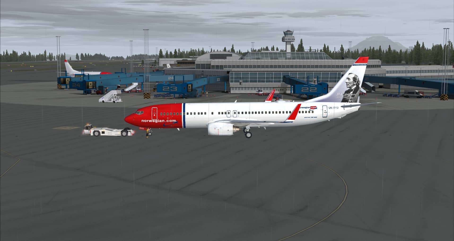 Mein Flug von Bergen nach Tromsø beginnt am Gate 23 an einem regnerischen Tag im Oktober. Dass es regnet wundert nicht wirklich, denn Bergen gilt als die regenreichste „Großstadt“ Europas mit 248 Regentagen im Jahr (Quelle: wikipedia). Als Carrier habe ich die Low-Cost-Linie Norwegian Air Shuttle gewählt. Für die PMDG 737 NGX gibt es übrigens von Christian Mohr erstklassige Freeware-Repaints der gesamten Flotte als Download (https://www.dropbox.com/sh/xdffq0m27bk7pmb/AAA9fNOxct2b51GNAogzagoJa)