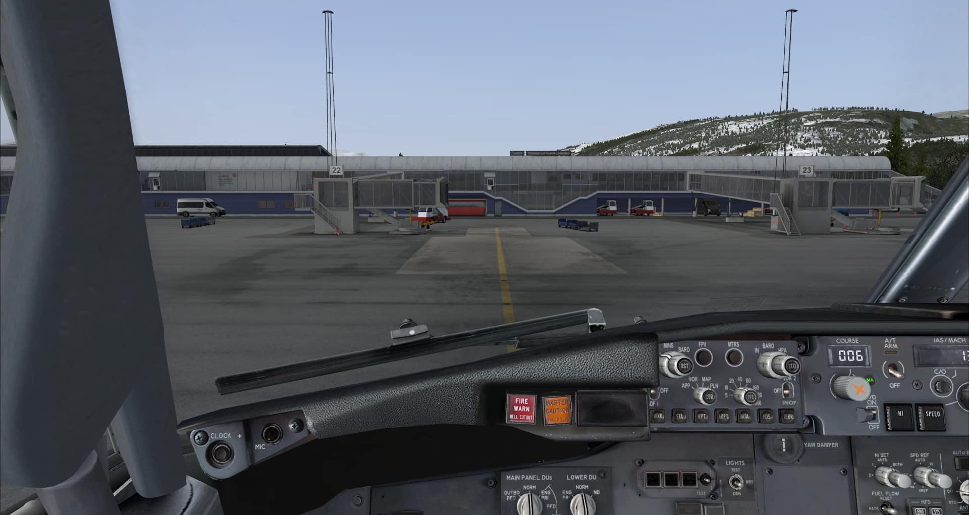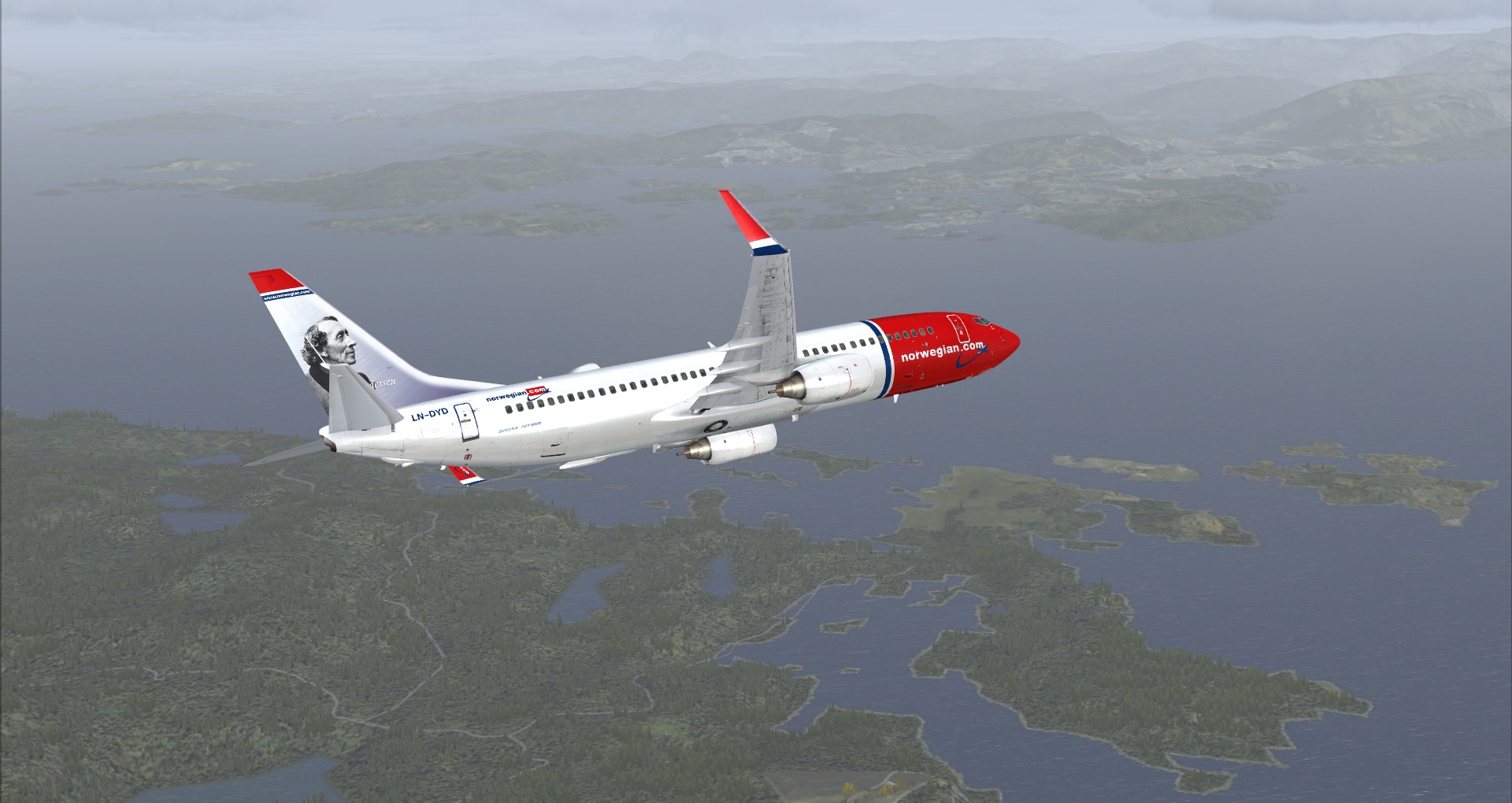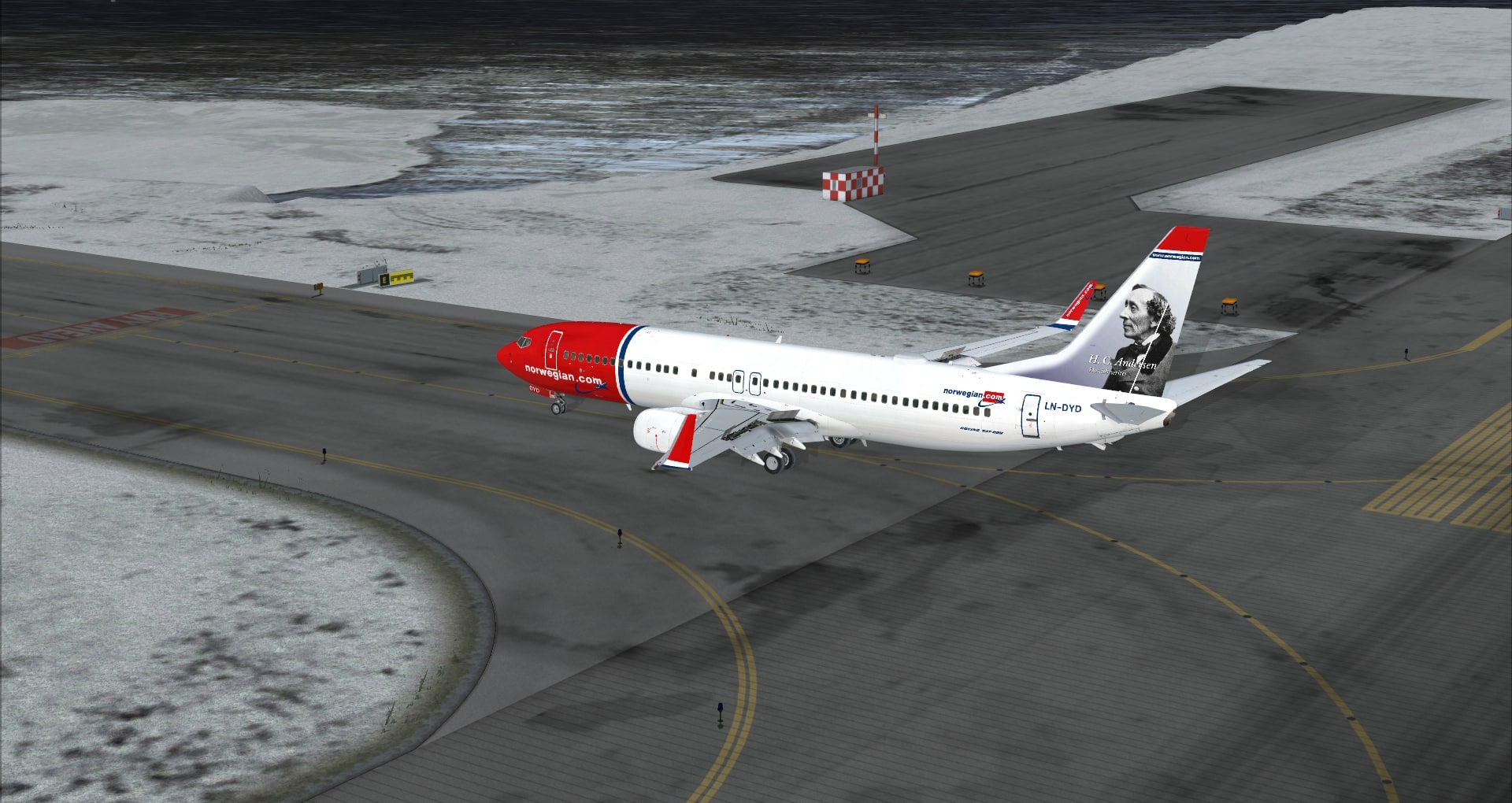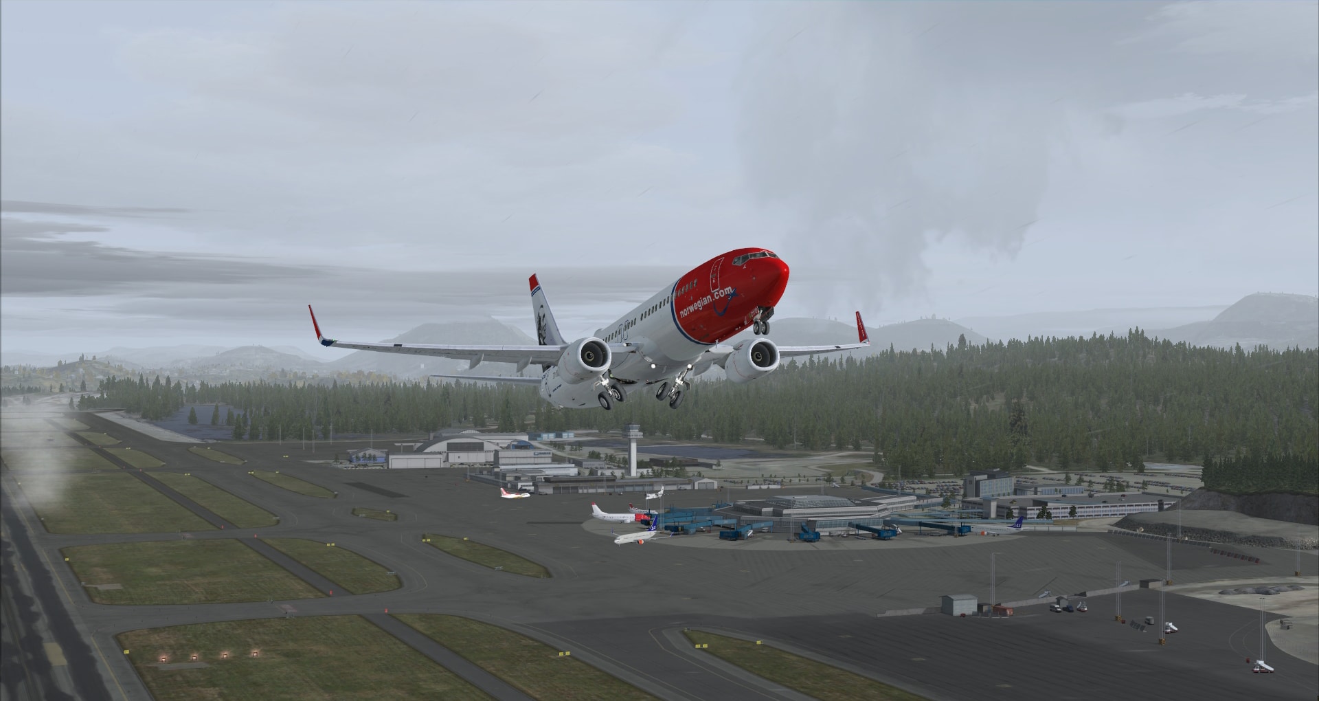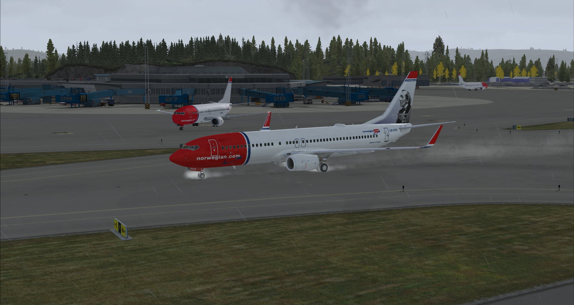 Mein Flug von Bergen nach Tromsø beginnt am Gate 23 an einem regnerischen Tag im Oktober. Dass es regnet wundert nicht wirklich, denn Bergen gilt als die regenreichste „Großstadt“ Europas mit 248 Regentagen im Jahr (Quelle: wikipedia). Als Carrier habe ich die Low-Cost-Linie Norwegian Air Shuttle gewählt. Für die PMDG 737 NGX gibt es übrigens von Christian Mohr erstklassige Freeware-Repaints der gesamten Flotte als Download (https://www.dropbox.com/sh/xdffq0m27bk7pmb/AAA9fNOxct2b51GNAogzagoJa)