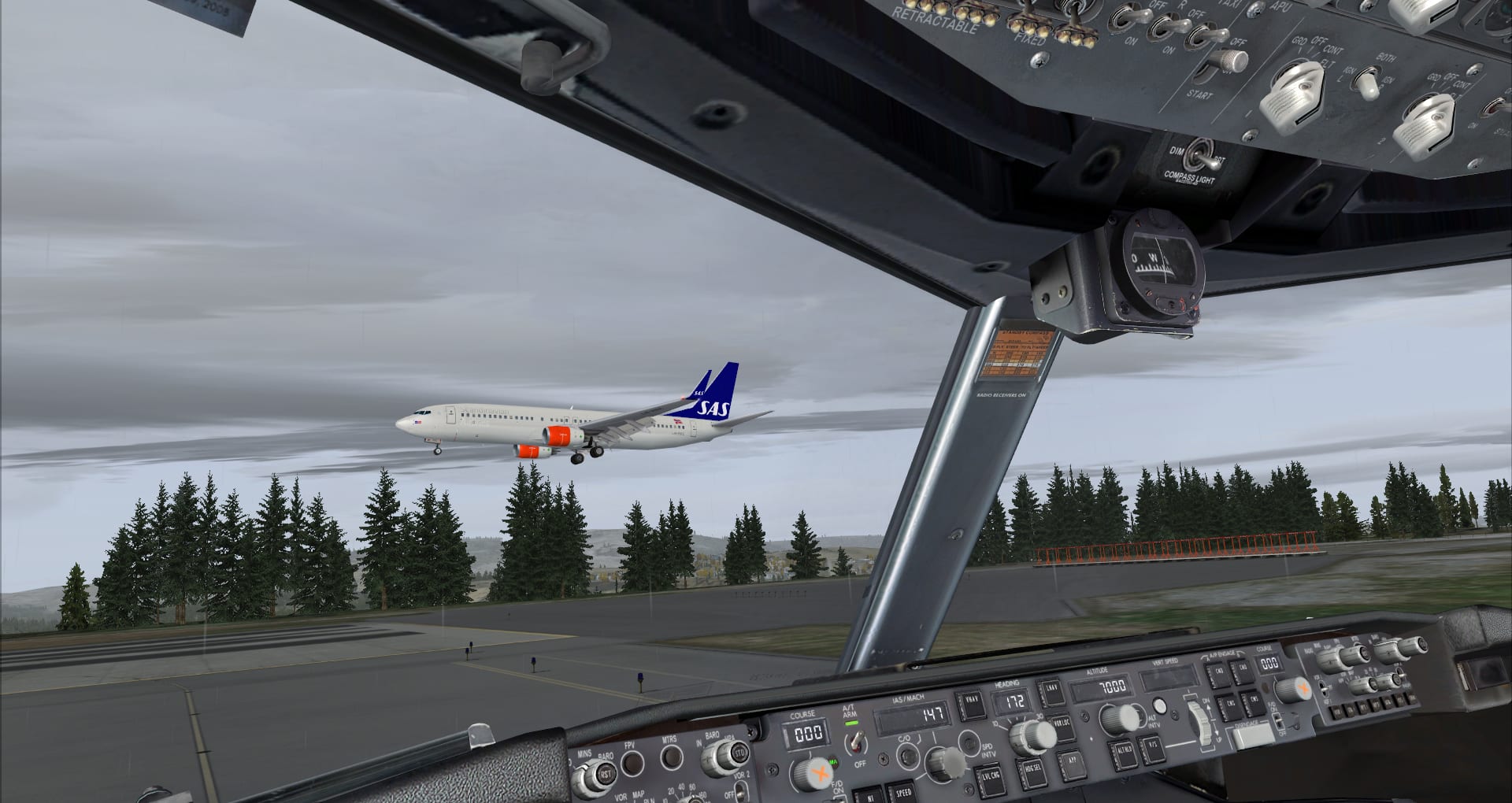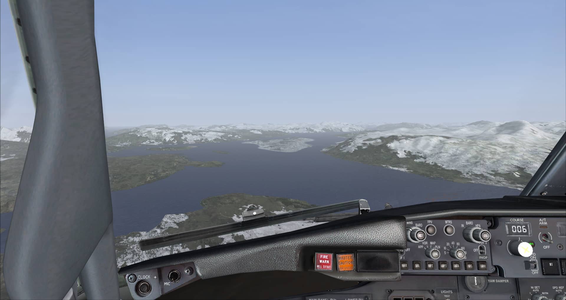 Da Bergen nur über eine einzige Runway (17/35) mit 2550 Metern Länge verfügt, bleibt am Holding Point ein kurzer Augenblick zum Verweilen, da zunächst noch eine SAS-Maschine zur Landung ansteht. Nachdem diese die Piste verlassen hat, steht dem Start nach Tromsø buchstäblich nichts mehr im Wege. Nach dem Takeoff geht es in einer großen Linkskurve auf Nordkurs. Hier kann man vom Sitz des Kapitäns noch einen abschließenden Blick auf Bergen werfen, bis die Boeing 737-800 endgültig in den Wolken verschwindet.