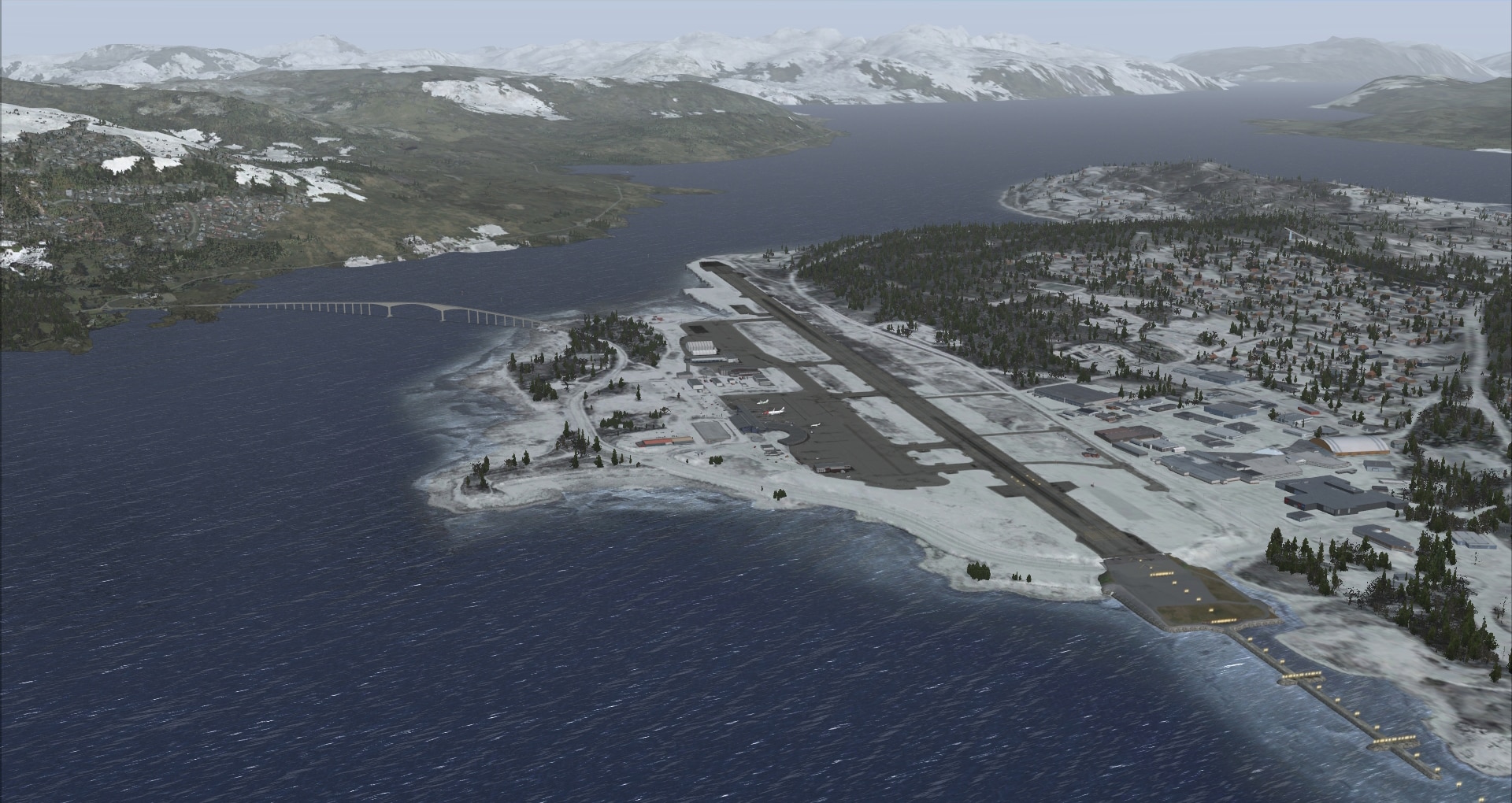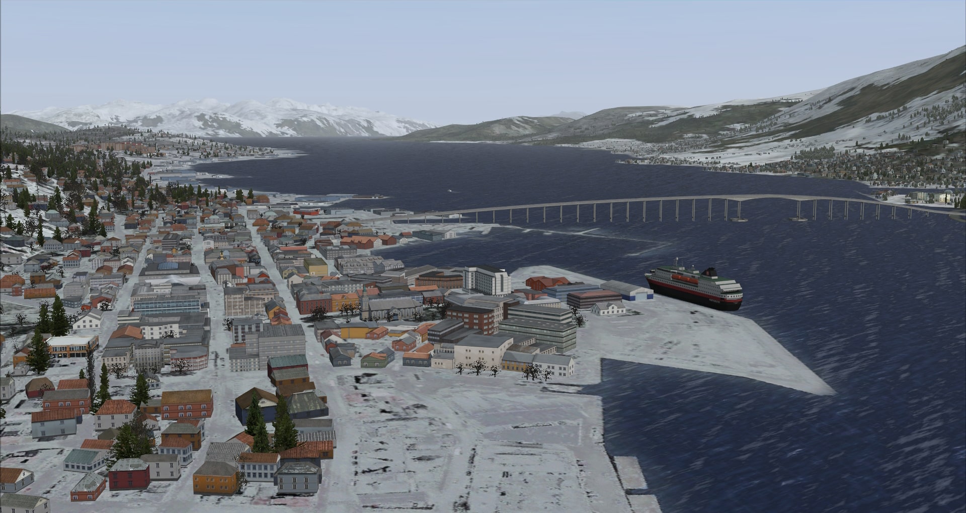 Da es hier aufgrund der örtlichen Gegebenheiten für Jo Erlend Sund bei der Flughafengestaltung nicht allzu viel zu tun gab, hat er sich daran gemacht, zusätzlich große Teile der Insel Tromsøya nachzubilden. So lassen sich bei einem Streifzug über die Insel mühelos die Hafenanlage, die Universität und die Skischanzen wiederfinden. Zusammen mit dem Fotountergrund ergibt das ein stimmungsvolles Abbild.