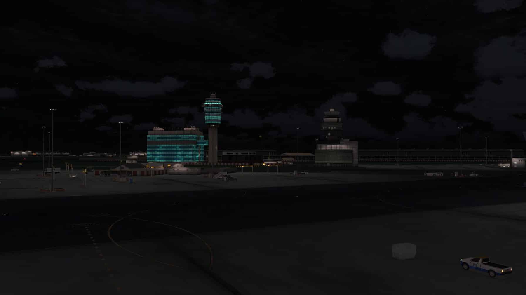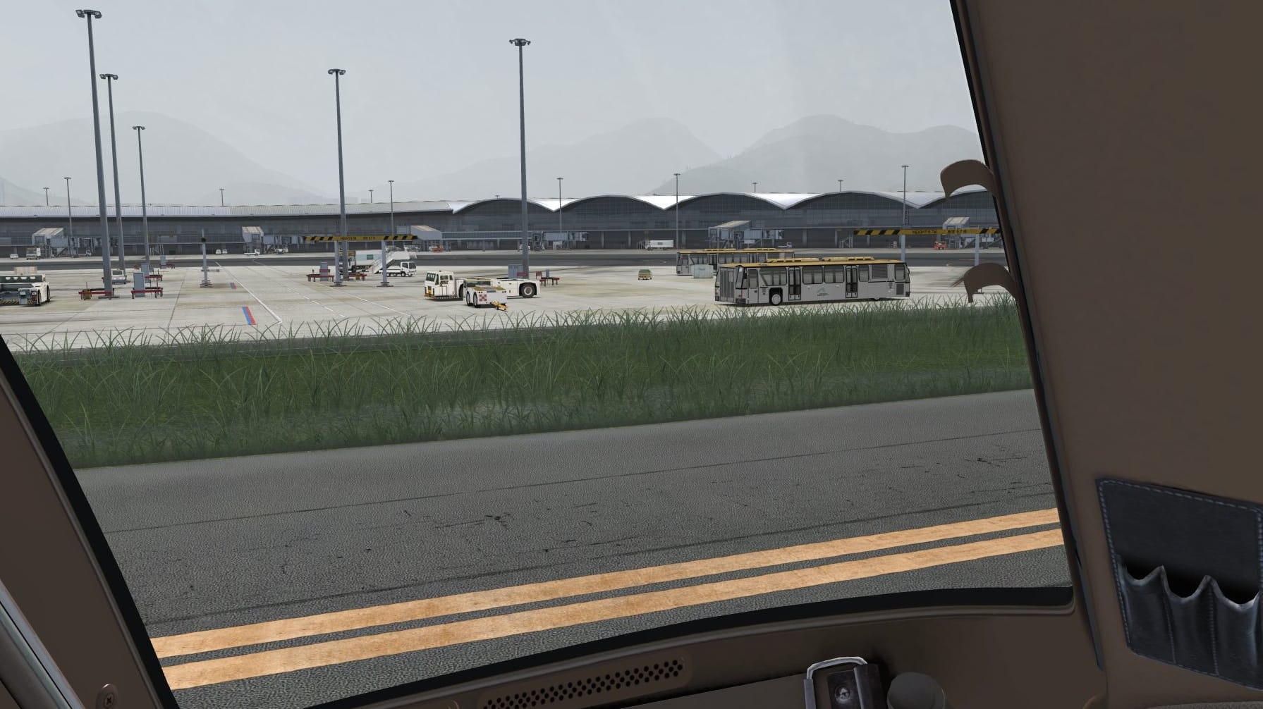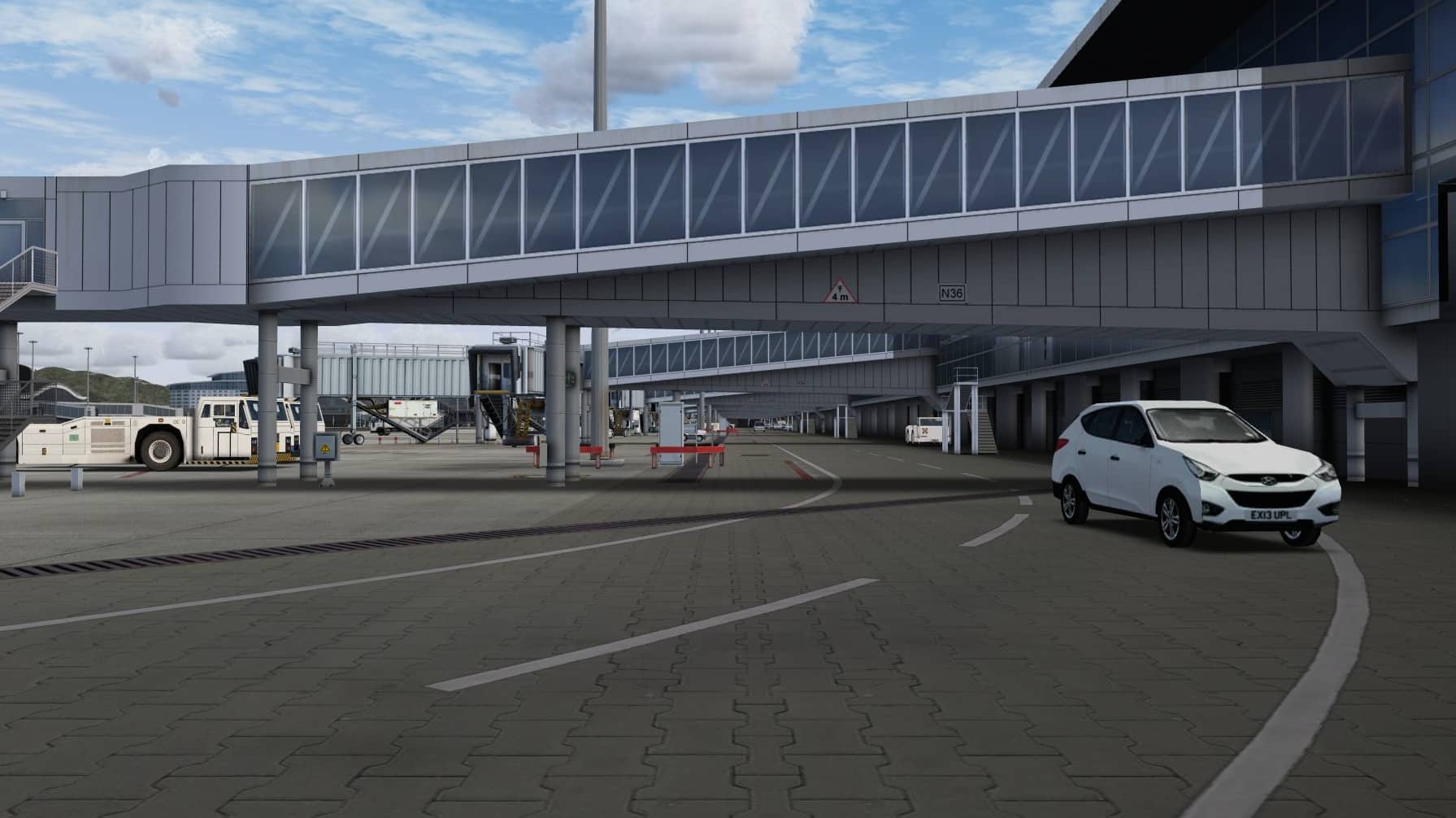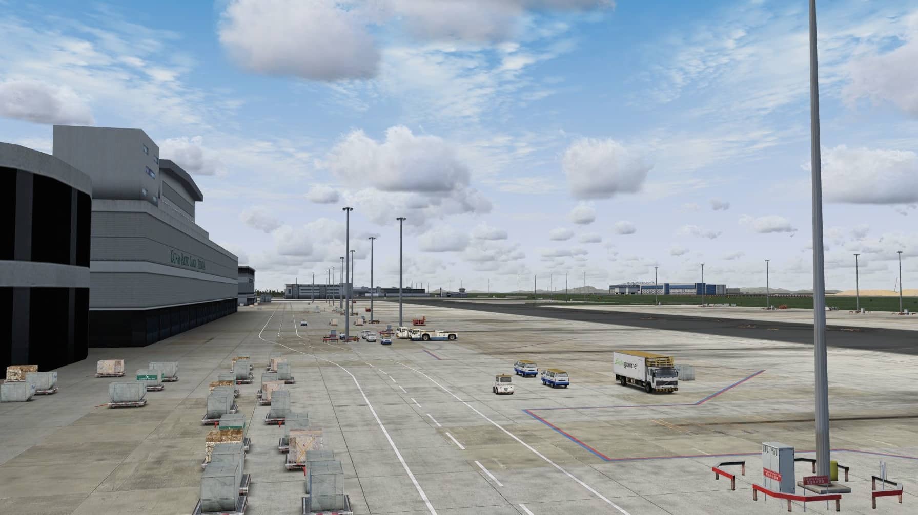 Die Airside ist recht detailliert und mit allerlei Dingen ausgestattet: Frachtcontainer, diverse Treppen, Schlepper, Busse. Leider bewegen nur wenige der Fahrzeuge. Wenn nicht genug AI-Traffic anwesend ist, wirkt das Vorfeld sehr steril. Andere können das (z.B. mit AES lite) deutlich besser. Statische Flugzeuge für die Leute, die zuwenig Rechenleistung für AI-Traffic haben, gibt es leider auch nicht.