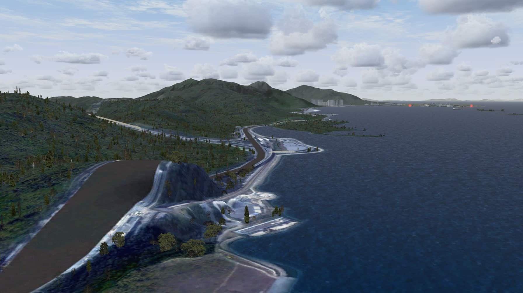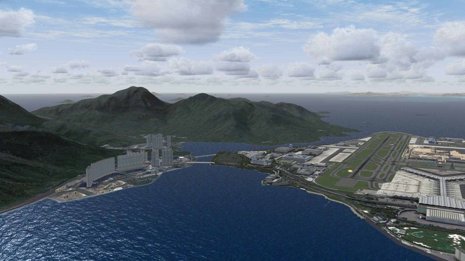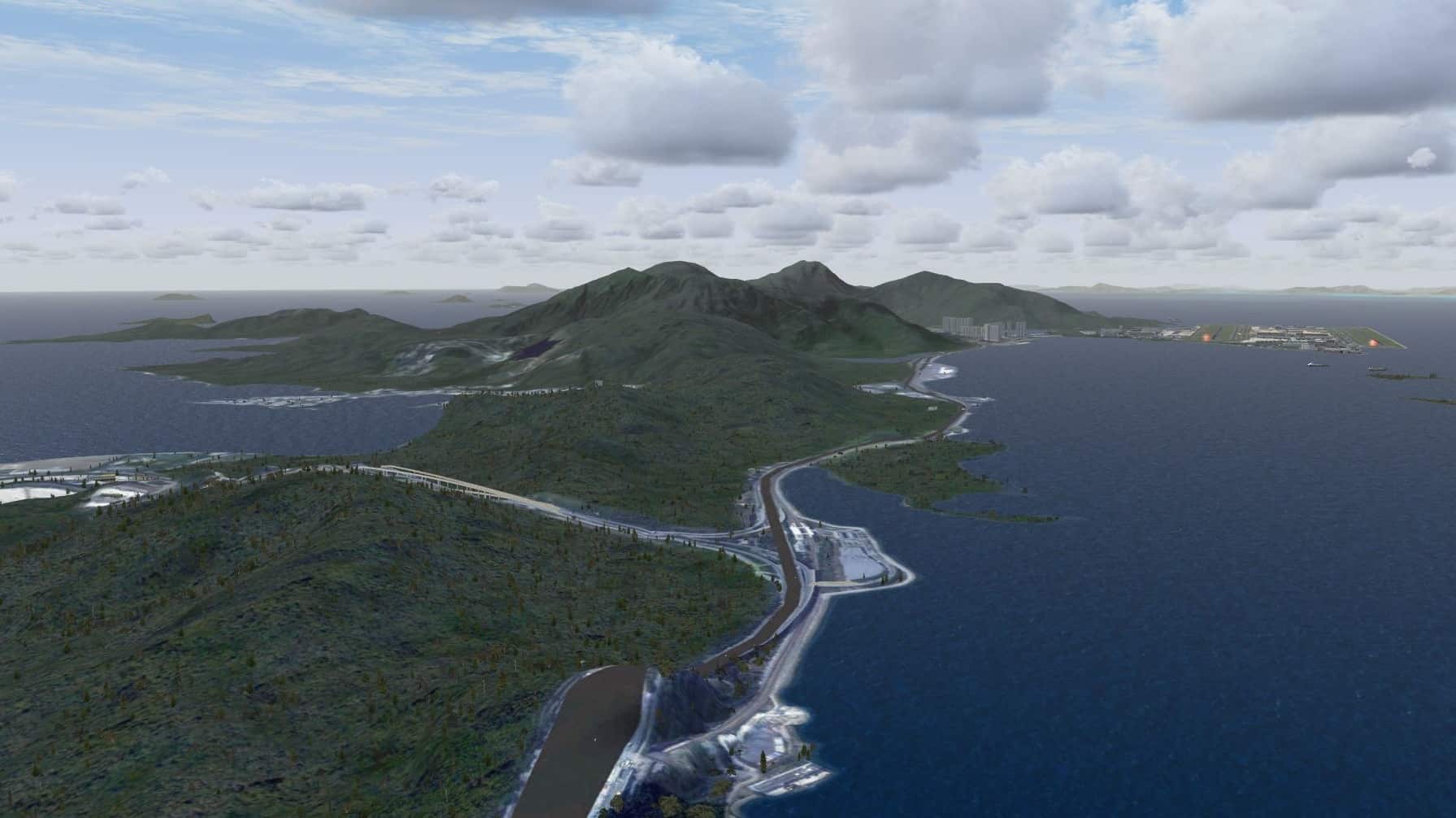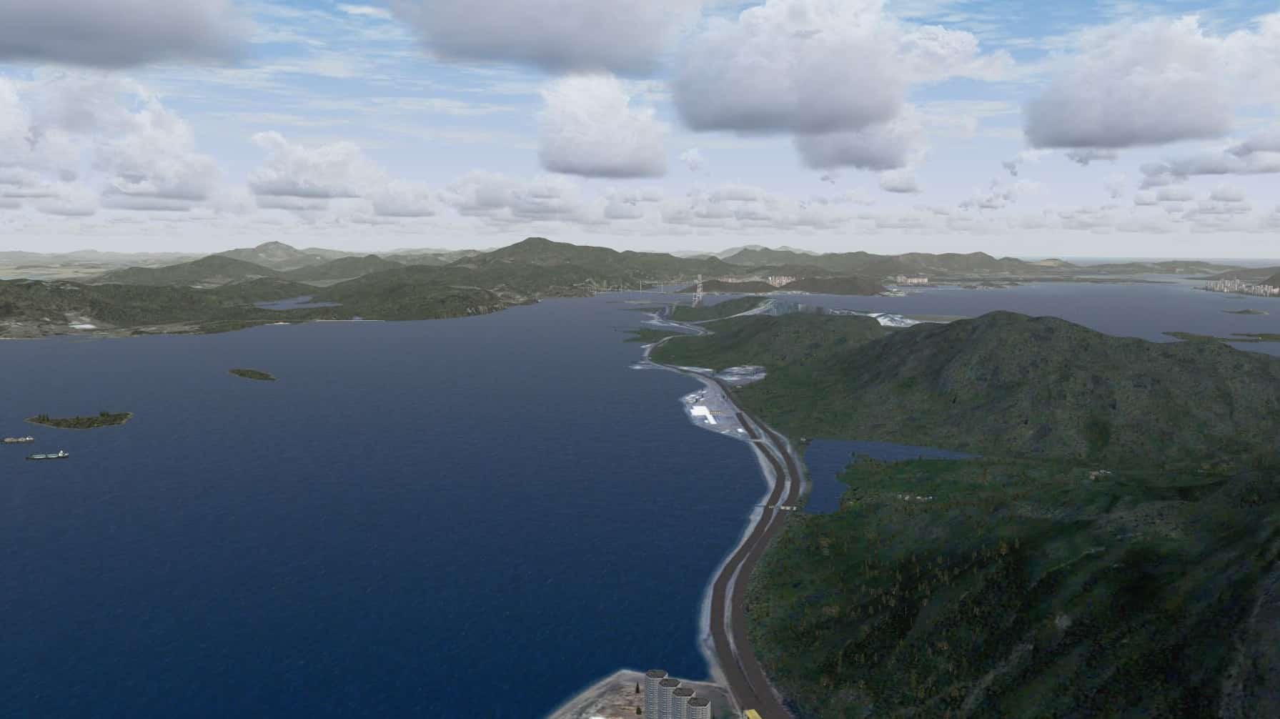 Die Schnellstraße zwischen VHHH und Central ist beeindruckend zu sehen und zieht sich entlang der Küste von Chek Lap Kok über diverse Brücken bis nach Downtown, und entlang dieser Schnellstraße verläuft der Anflug auf die 25L. Dieser Bereich ist grundsätzlich schön dargestellt, aber es gibt eine Terrain-Anomalie, die etwas eigenartig aussieht.