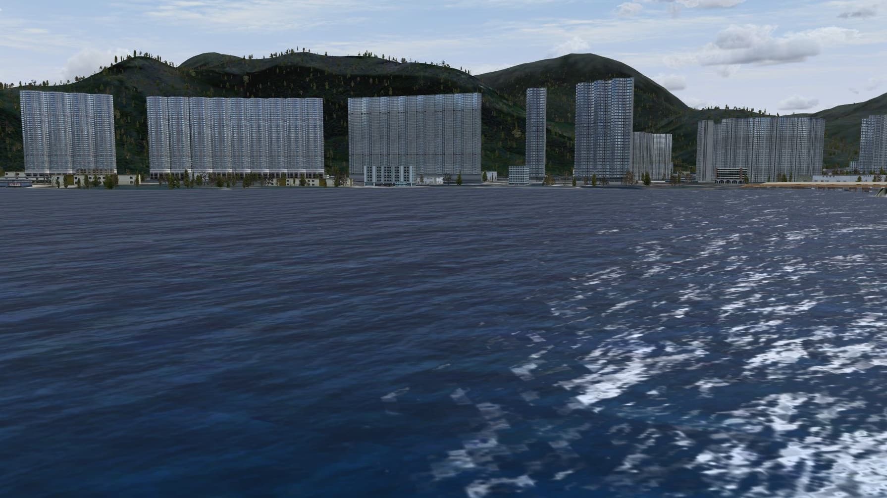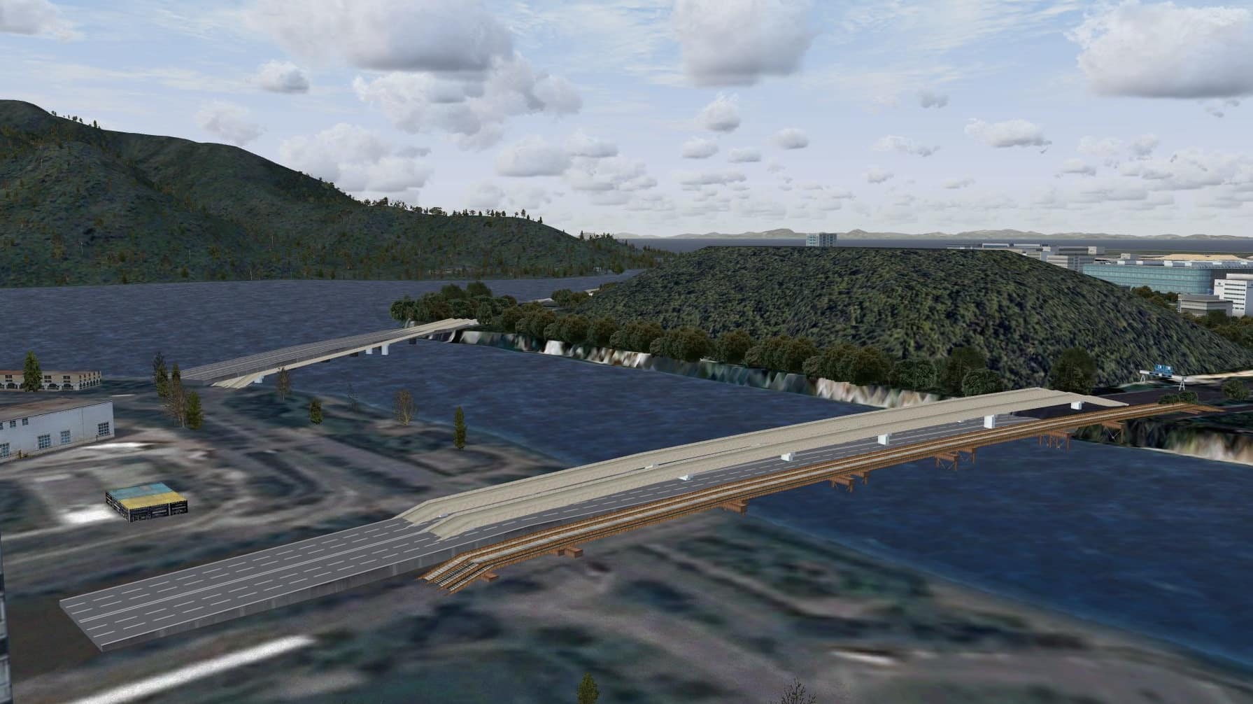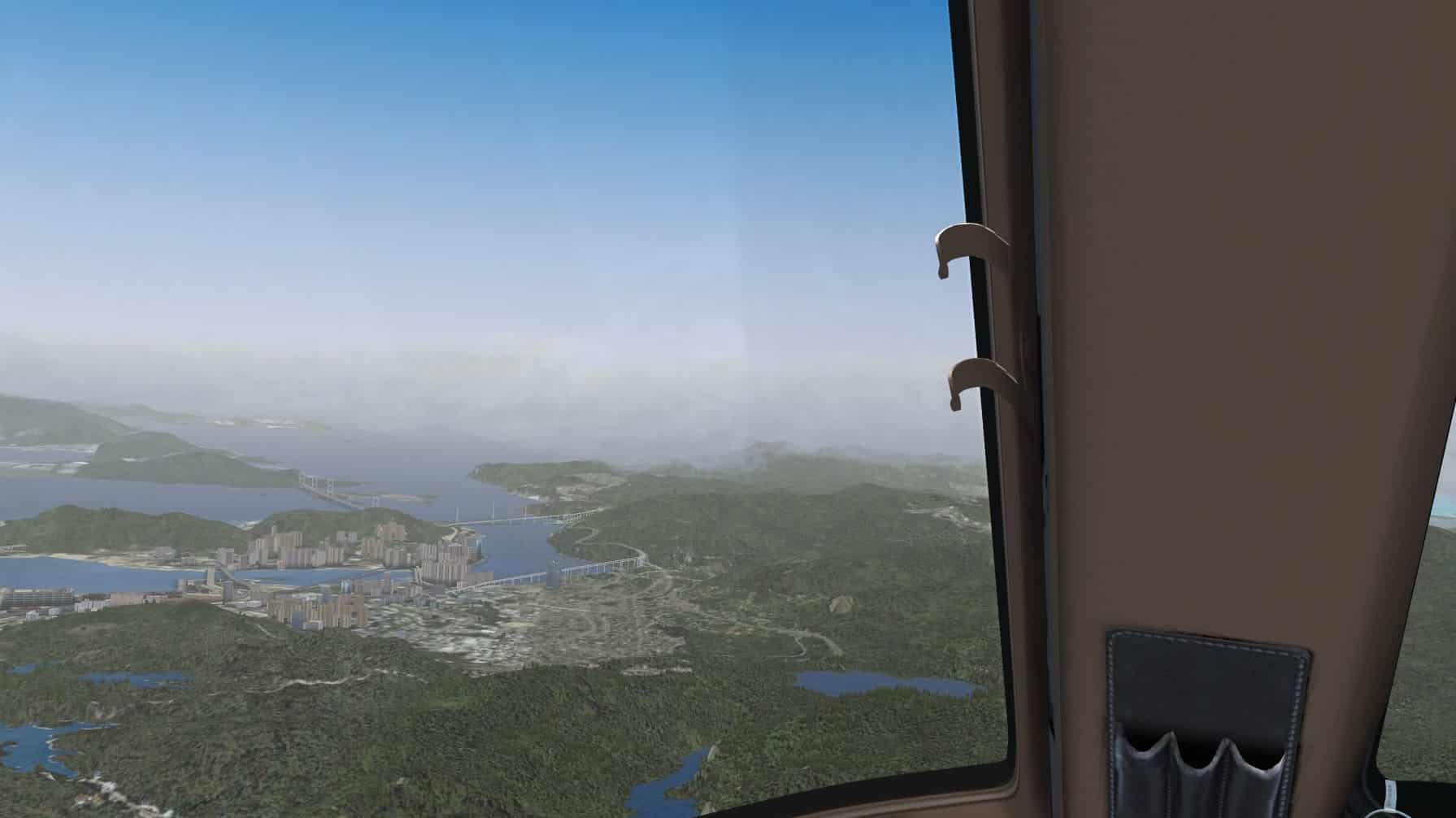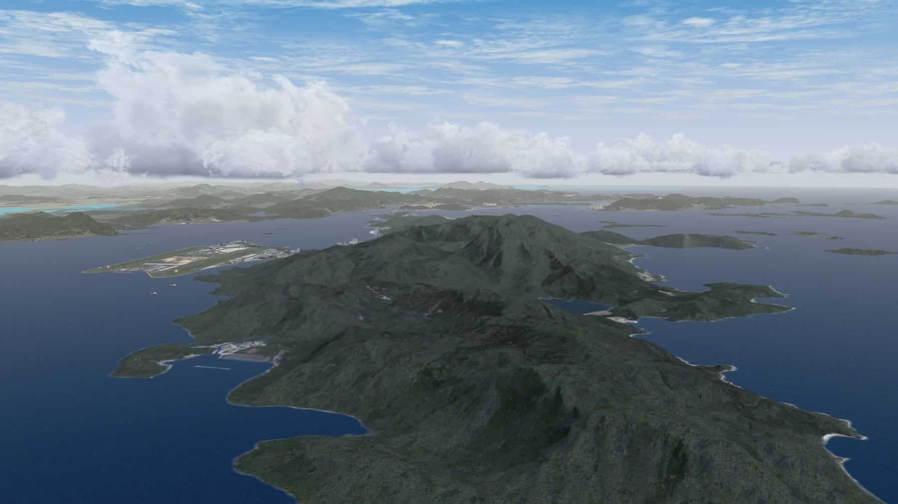 Die Schnellstraße zwischen VHHH und Central ist beeindruckend zu sehen und zieht sich entlang der Küste von Chek Lap Kok über diverse Brücken bis nach Downtown, und entlang dieser Schnellstraße verläuft der Anflug auf die 25L. Dieser Bereich ist grundsätzlich schön dargestellt, aber es gibt eine Terrain-Anomalie, die etwas eigenartig aussieht.