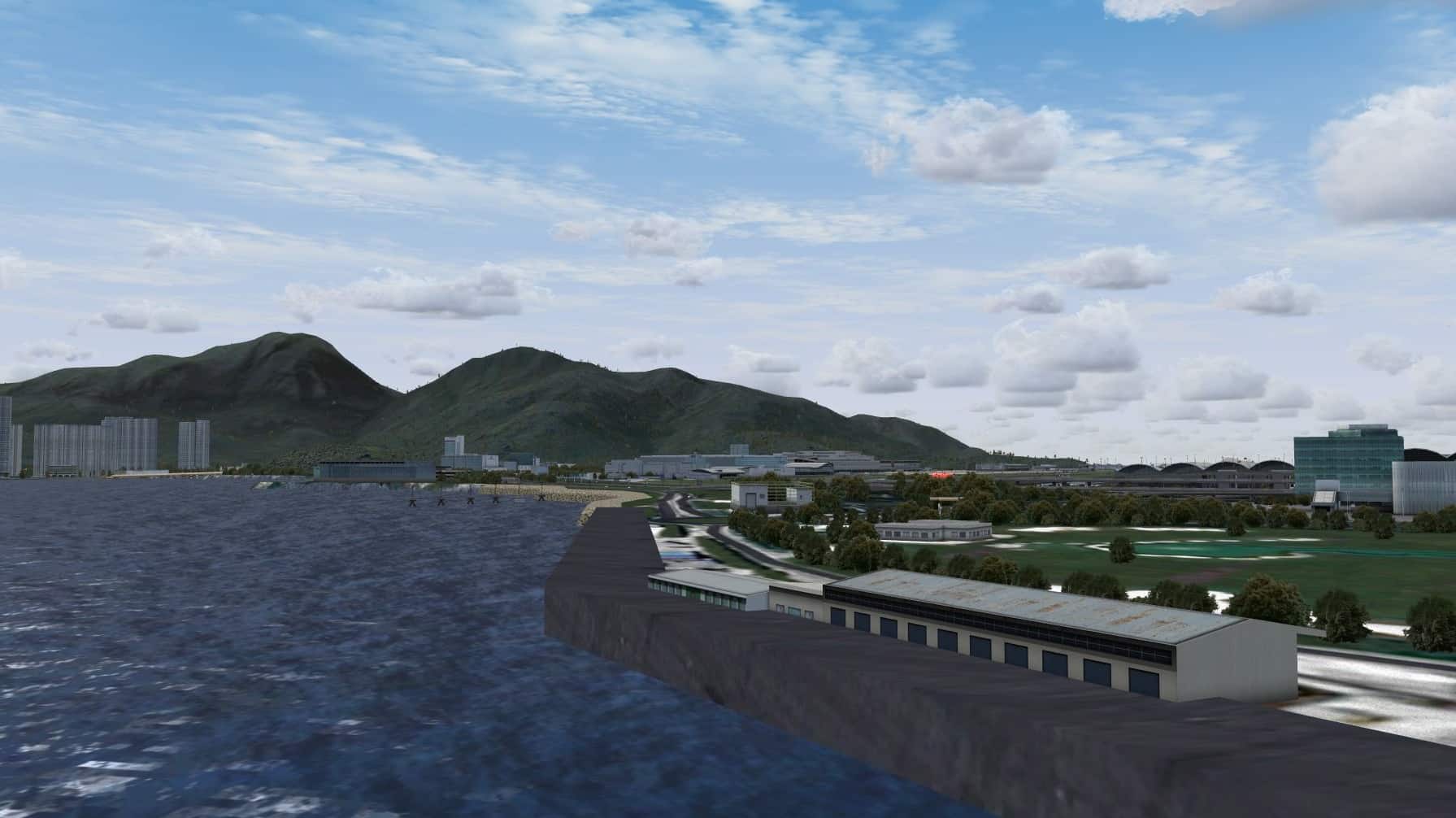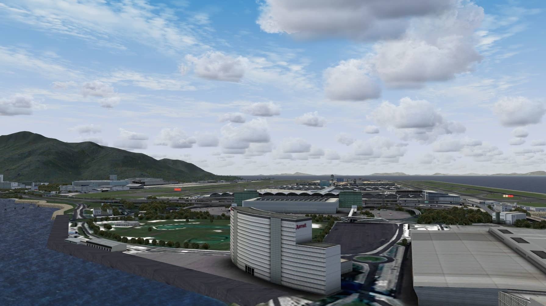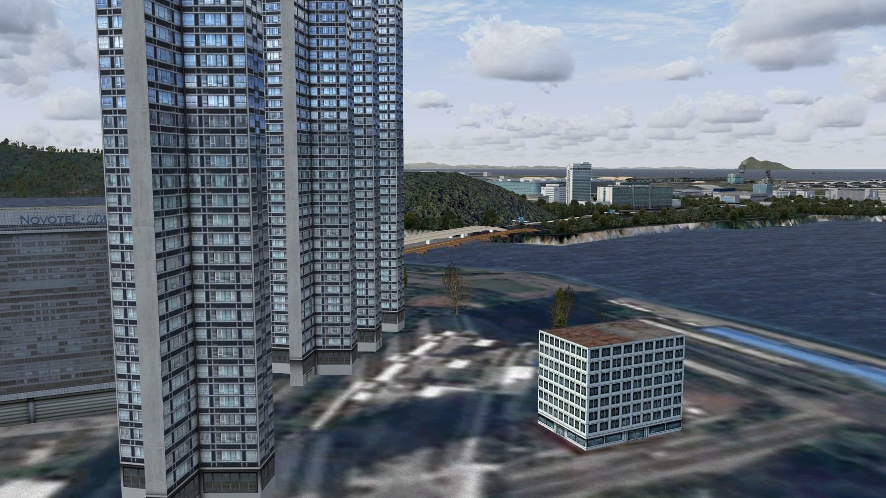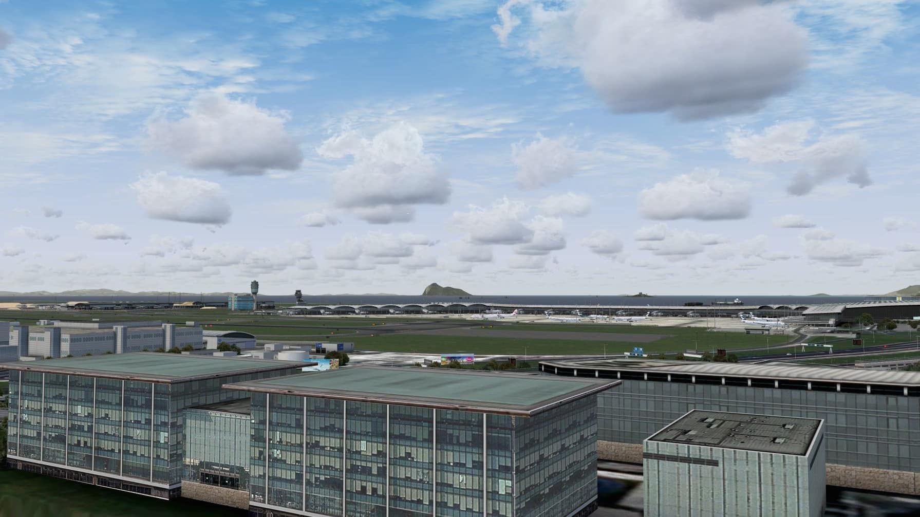 Die Instel Chek Lap Kok war ja im Default-FSX doch sehr spärlich dargestellt. Auch FTX Global Vector und natürlich FlyTampa’s Kai Tak ändern daran nicht wirklich viel. Taxi2Gate liefert aber zumindest eine beeindruckende Hochhauskulisse im Übergangsbereich zwischen Chek Lap Kok und Flughafeninsel mit. Die Texturen der gesamten Insel sind angepasst, was sich aber leider auch auf die Dichte der Bäume auswirkt – die sinkt nämlich im Vergleich zu FTX Global.