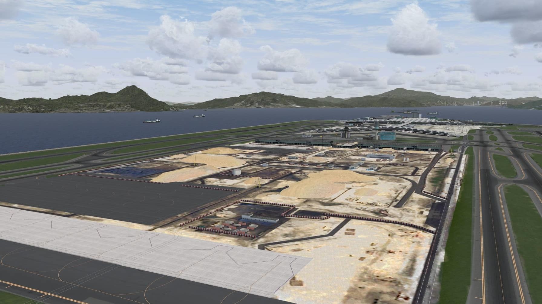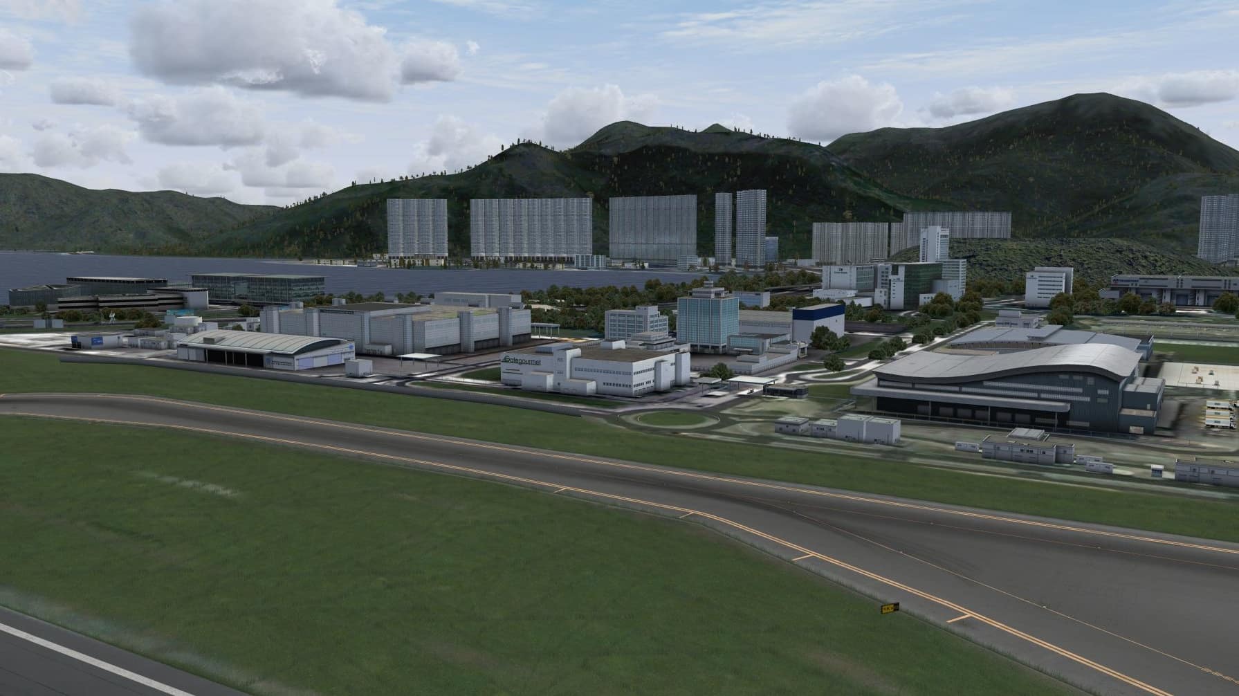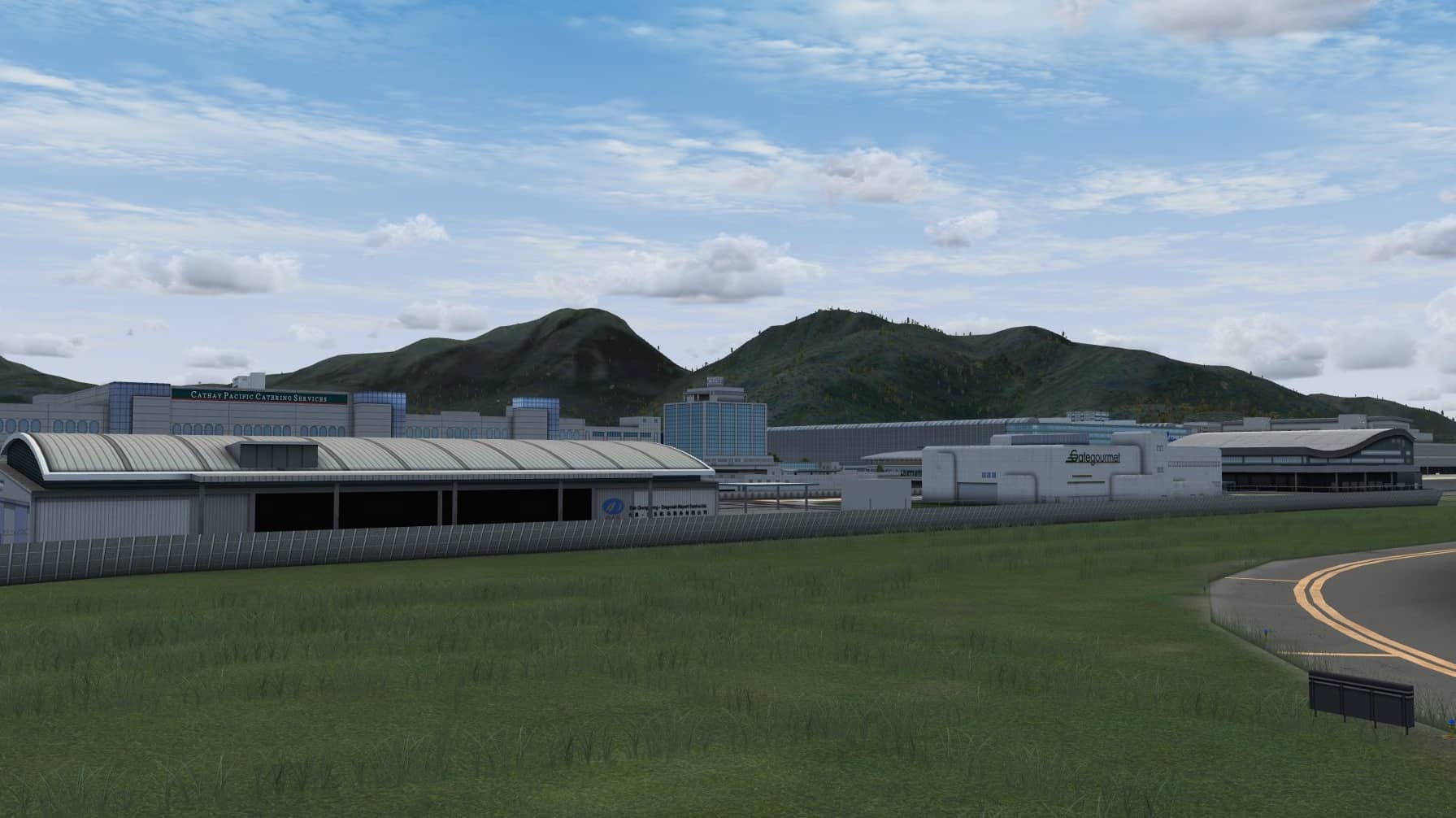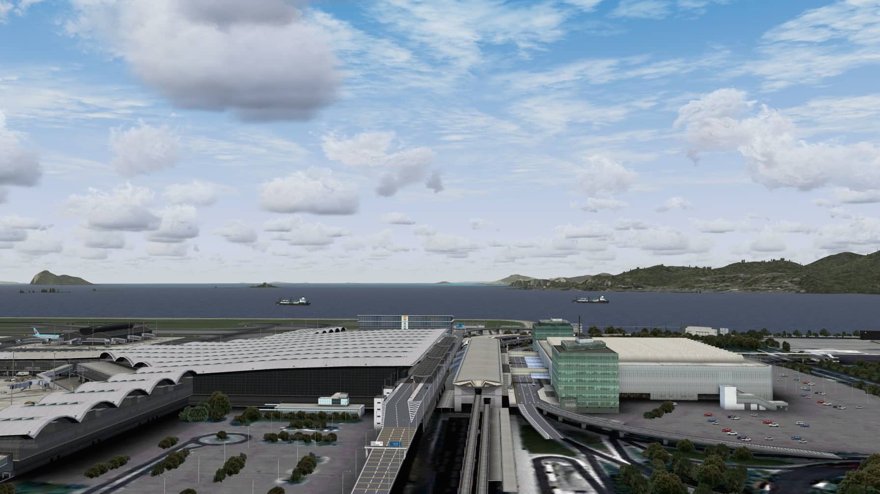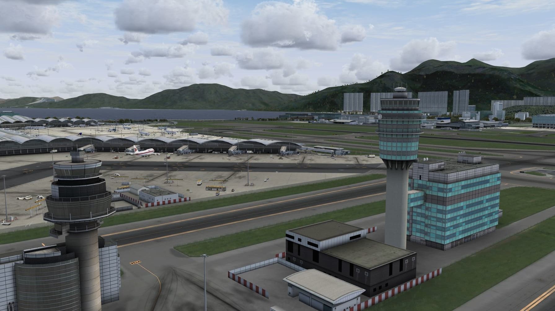 Die Instel Chek Lap Kok war ja im Default-FSX doch sehr spärlich dargestellt. Auch FTX Global Vector und natürlich FlyTampa’s Kai Tak ändern daran nicht wirklich viel. Taxi2Gate liefert aber zumindest eine beeindruckende Hochhauskulisse im Übergangsbereich zwischen Chek Lap Kok und Flughafeninsel mit. Die Texturen der gesamten Insel sind angepasst, was sich aber leider auch auf die Dichte der Bäume auswirkt – die sinkt nämlich im Vergleich zu FTX Global.