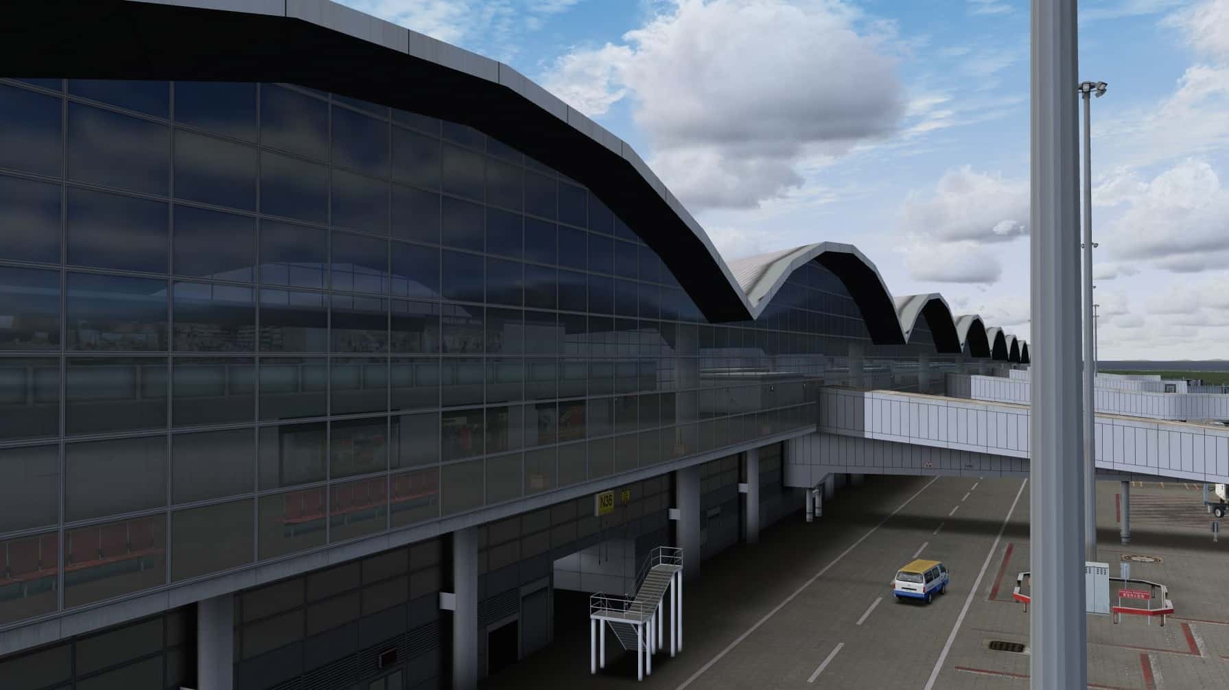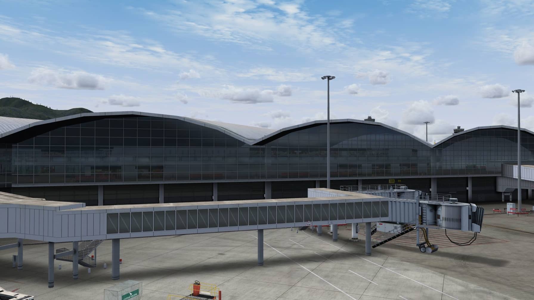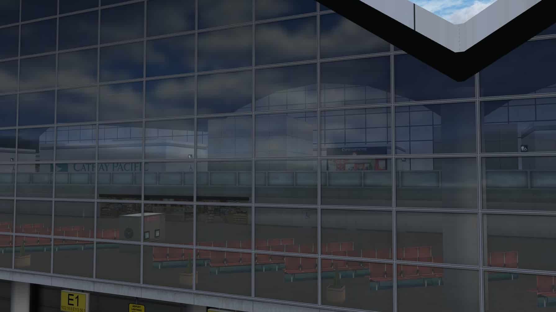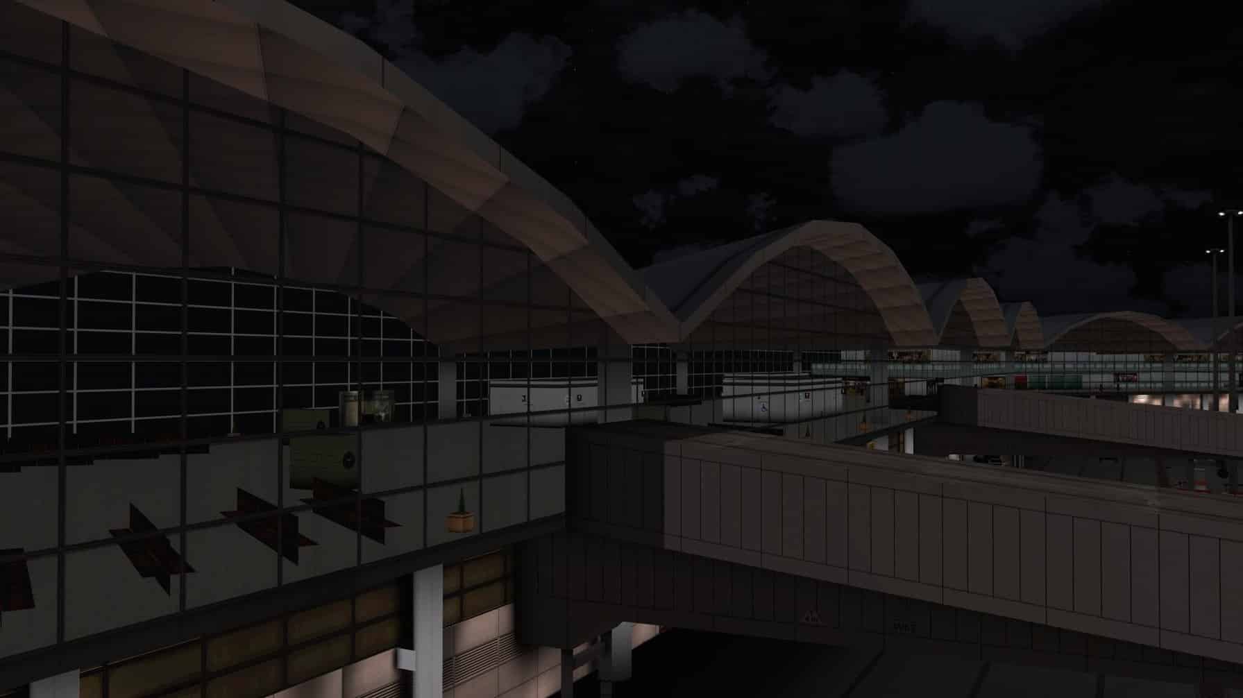 Die Terminalgebäude sind gut getroffen. Das große Terminal hat weite Glasfronten, hinter denen die Inneneinrichtung modelliert ist. Jetways sind manchmal absurd lang. Es gibt zusätzlich ein kleines Satellitenterminal, den Northern Satellite Concourse NSC mit 10 zusätzlichen Parkpositionen.