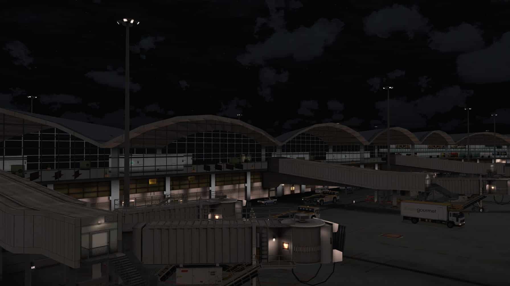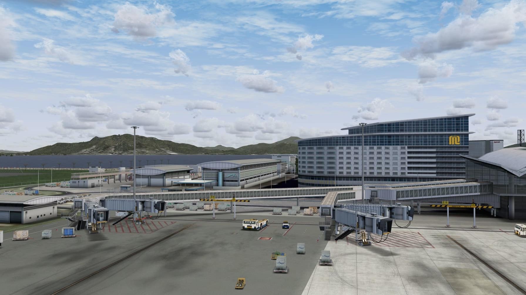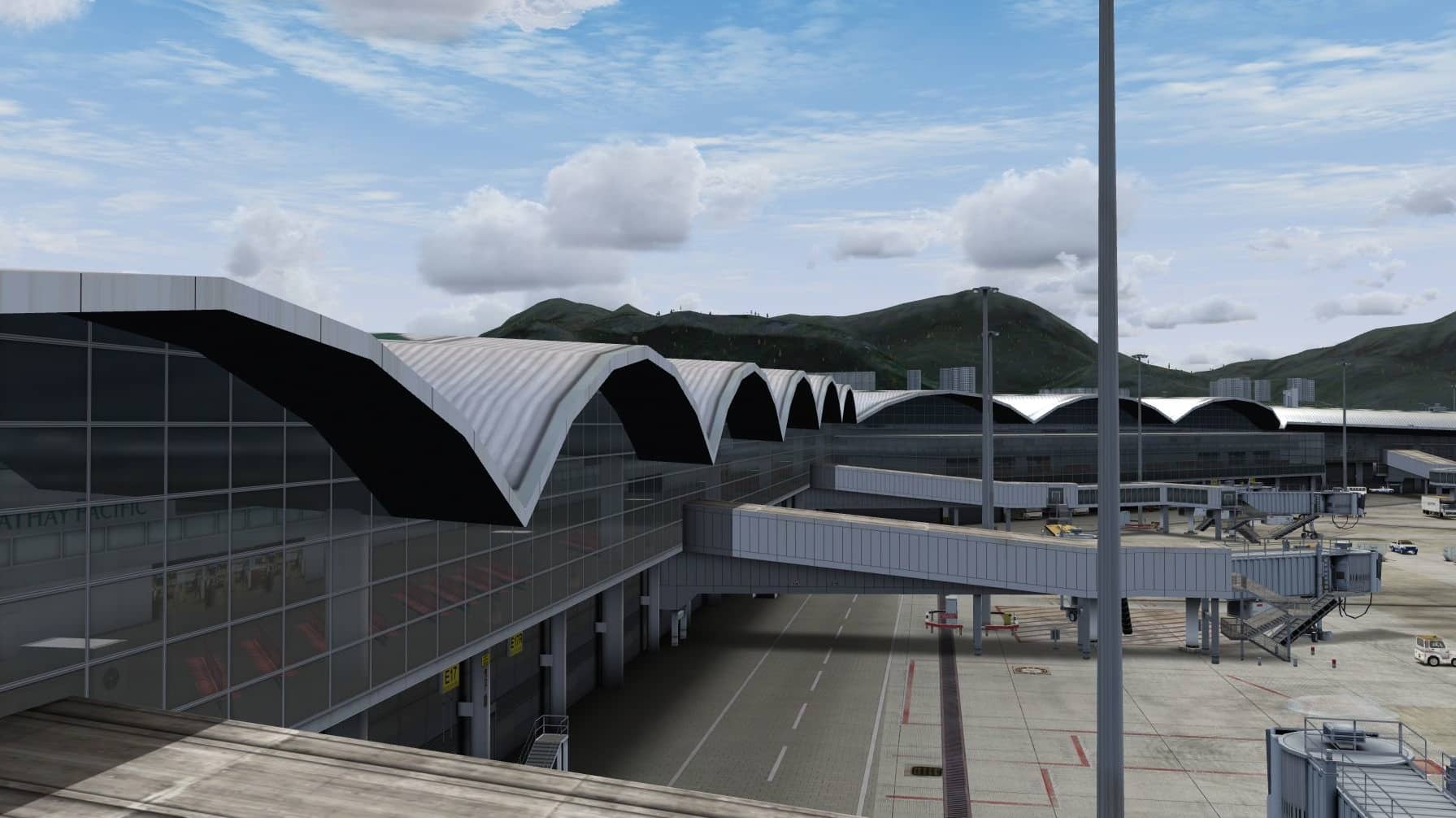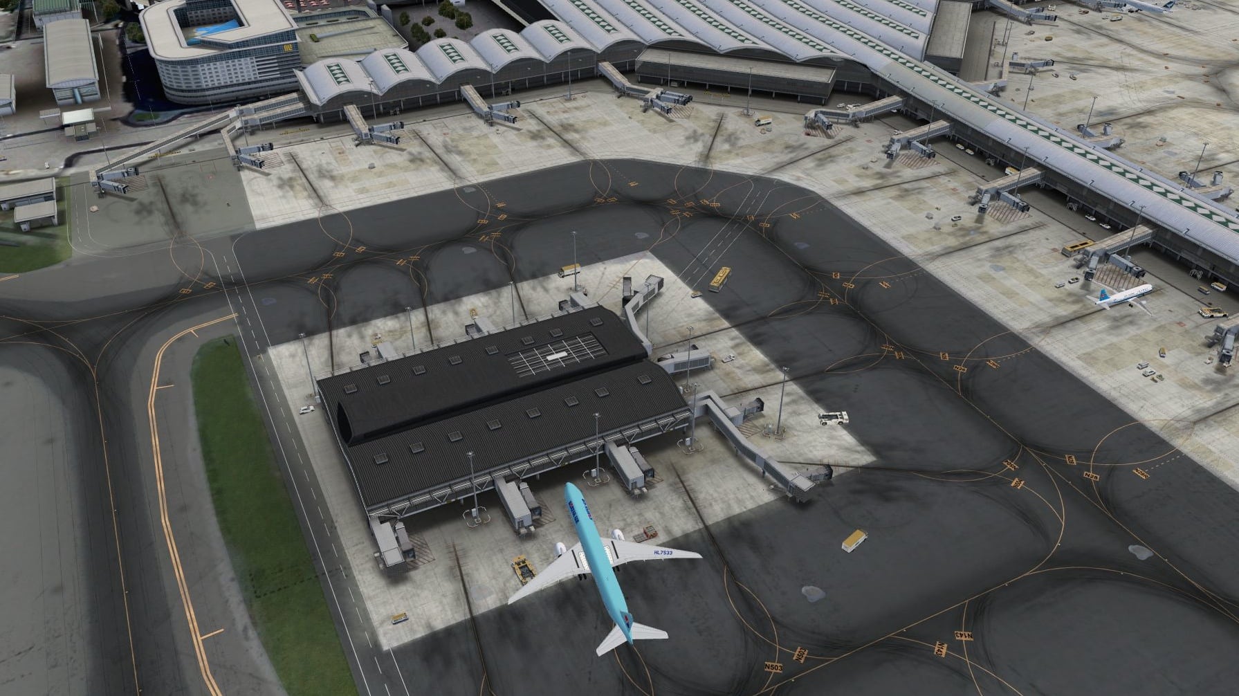 Die Terminalgebäude sind gut getroffen. Das große Terminal hat weite Glasfronten, hinter denen die Inneneinrichtung modelliert ist. Jetways sind manchmal absurd lang. Es gibt zusätzlich ein kleines Satellitenterminal, den Northern Satellite Concourse NSC mit 10 zusätzlichen Parkpositionen.