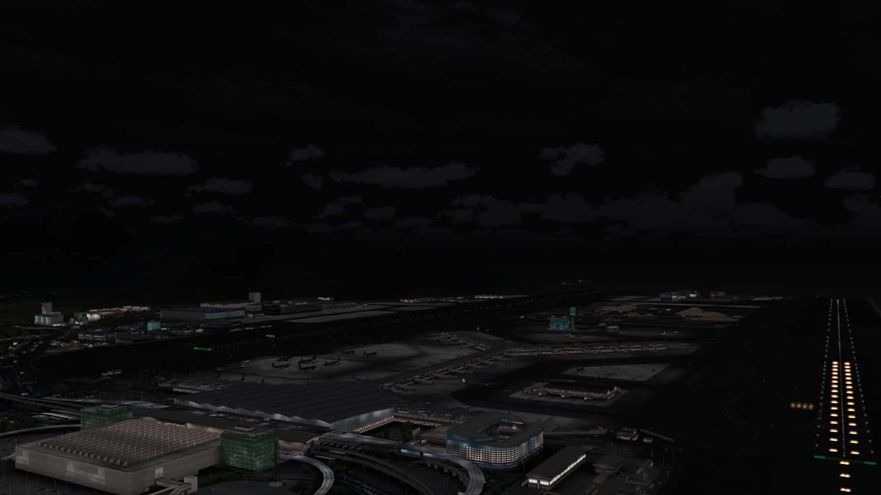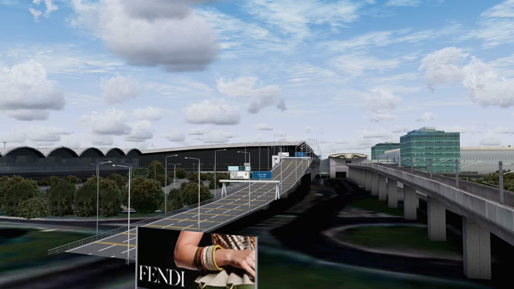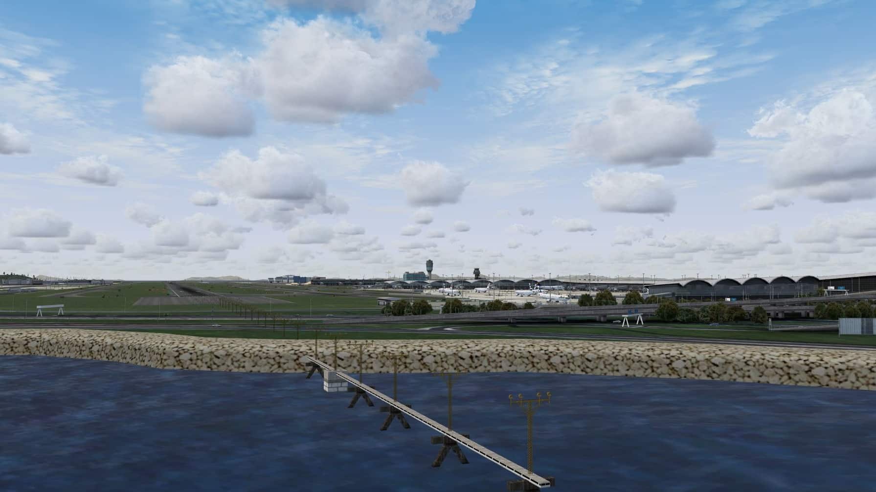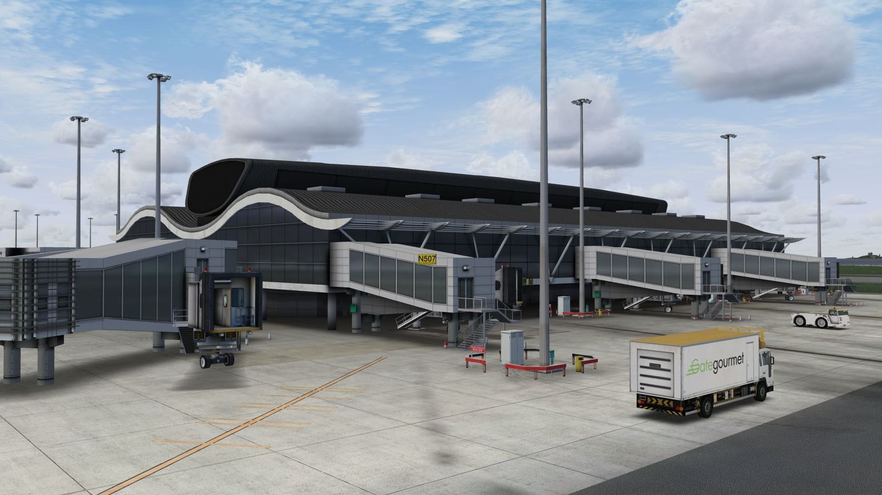 Die Terminalgebäude sind gut getroffen. Das große Terminal hat weite Glasfronten, hinter denen die Inneneinrichtung modelliert ist. Jetways sind manchmal absurd lang. Es gibt zusätzlich ein kleines Satellitenterminal, den Northern Satellite Concourse NSC mit 10 zusätzlichen Parkpositionen.