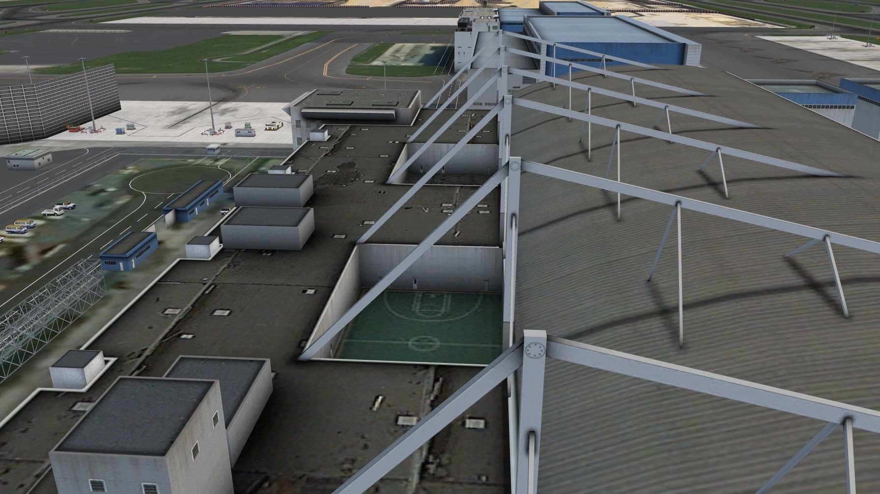 Der Werftbereich ist umfassend dargestellt. Gerade hier finden sich filigrane Strukturen, die schön dargestellt sind. Und ja, auch bei den einschlägigen Satellitenbildprovidern finden sich die Sportplätze im Dachgeschoss des großen Hangars!