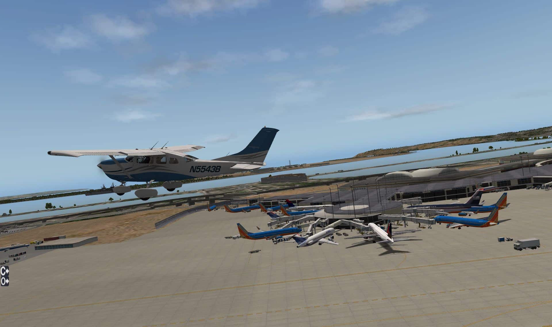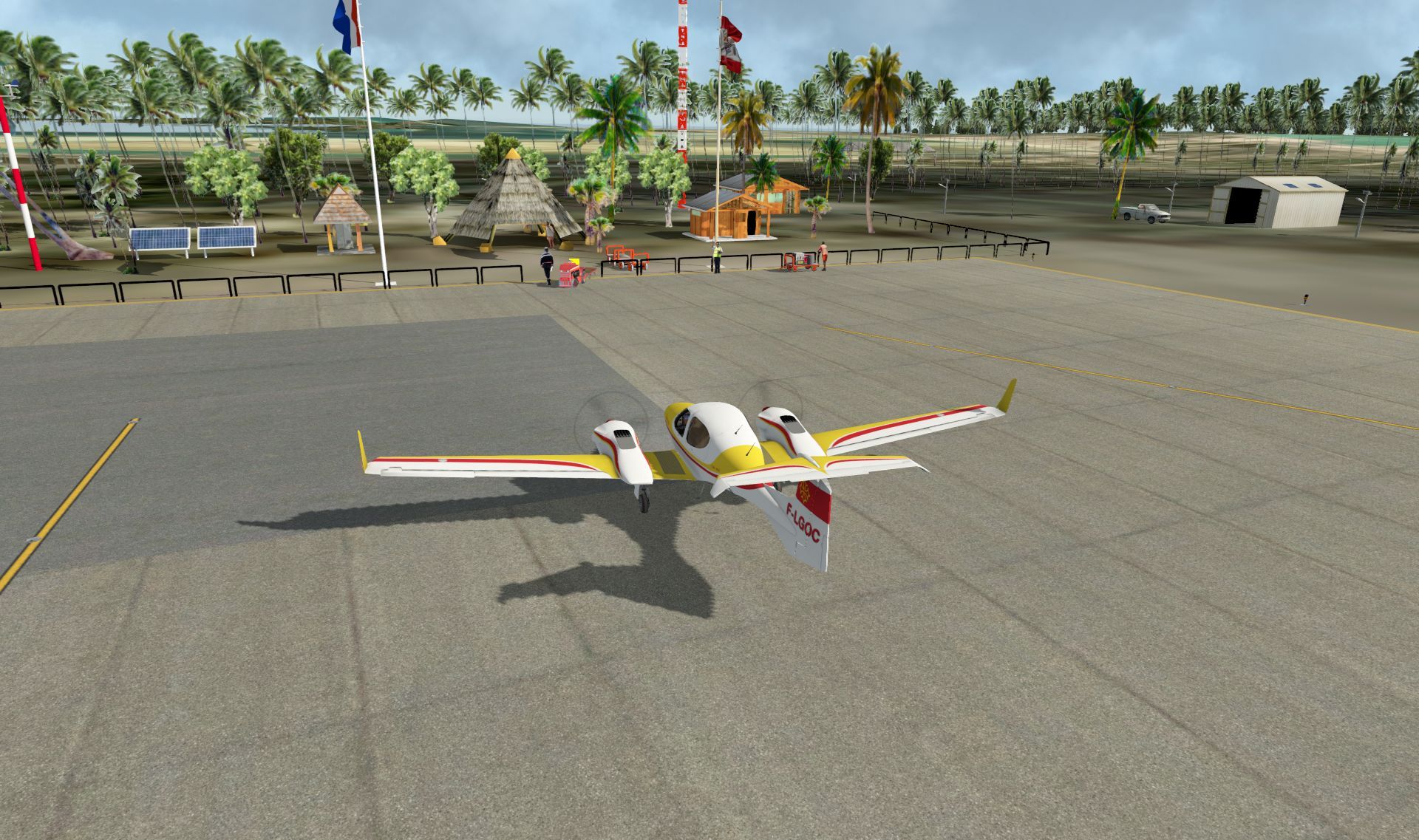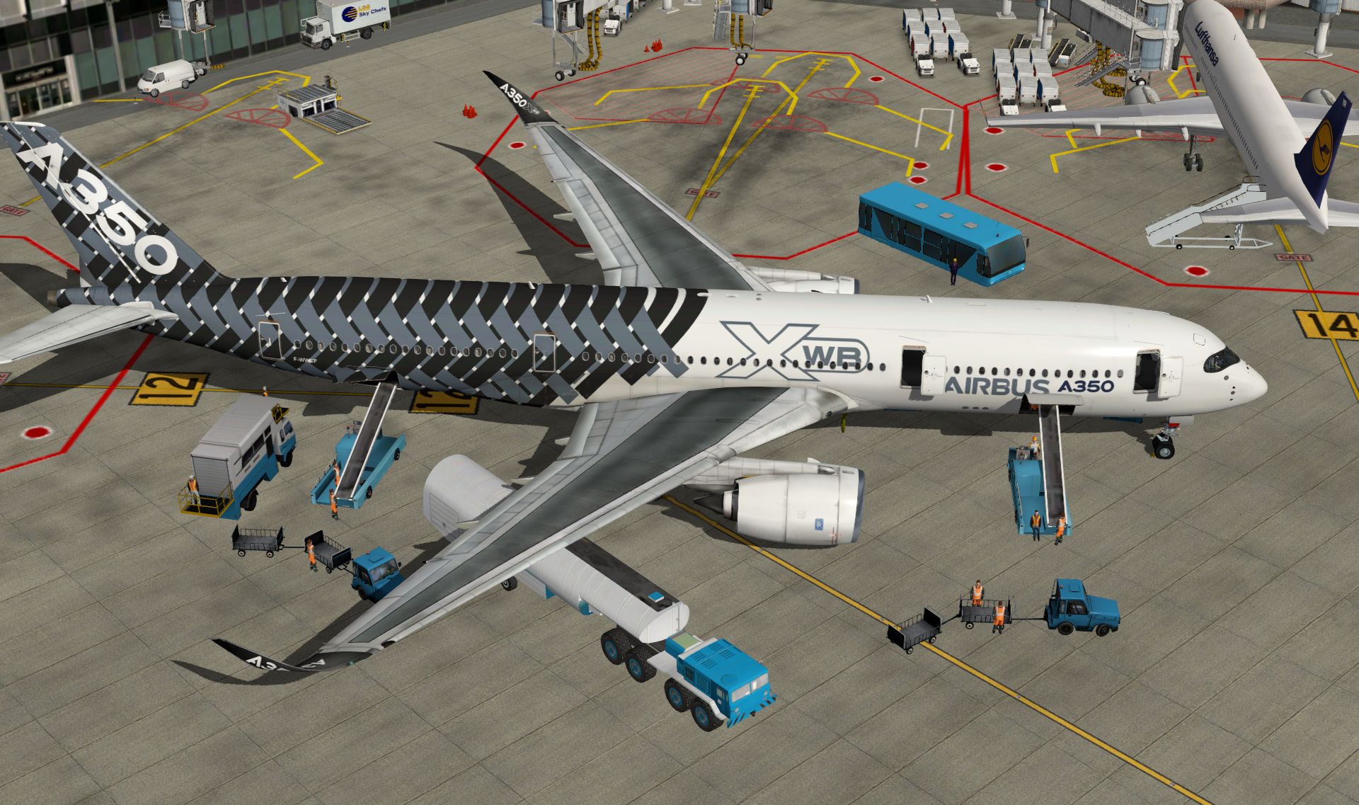 Es fehlt außerdem auf den großen Flughäfen ein Äquivalent zu AES oder GSX. Statt dessen bringt fast jeder große Airliner seine eigenen Servicefahrzeuge mit, die mehr oder minder schlecht funktionieren. Außerdem gibt es ein Groundtraffic Plug-in mit dem Bodenfahrzeuge nach Fahrplan auf festgelegten Routen fahren, oder auch ein Plug-in für die Fahrgastbrücken.