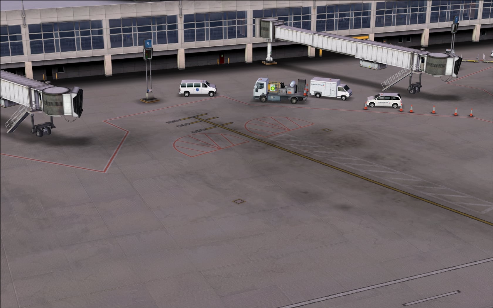 Die Airside des Terminals ist mit zahlreichen Fahrzeugen, Pylonen und weiteren Gegenständen geschmückt. Erfreulicherweise ist hier kein standardisiertes Muster zu erkennen, was jede einzelne Parkposition sehr individuell aussehen lässt. Pumpwagen, Cateringtrucks und Vans wurden filigran abgebildet und auch die Fluggastbrücken sind mit Feingefühl modelliert worden.
