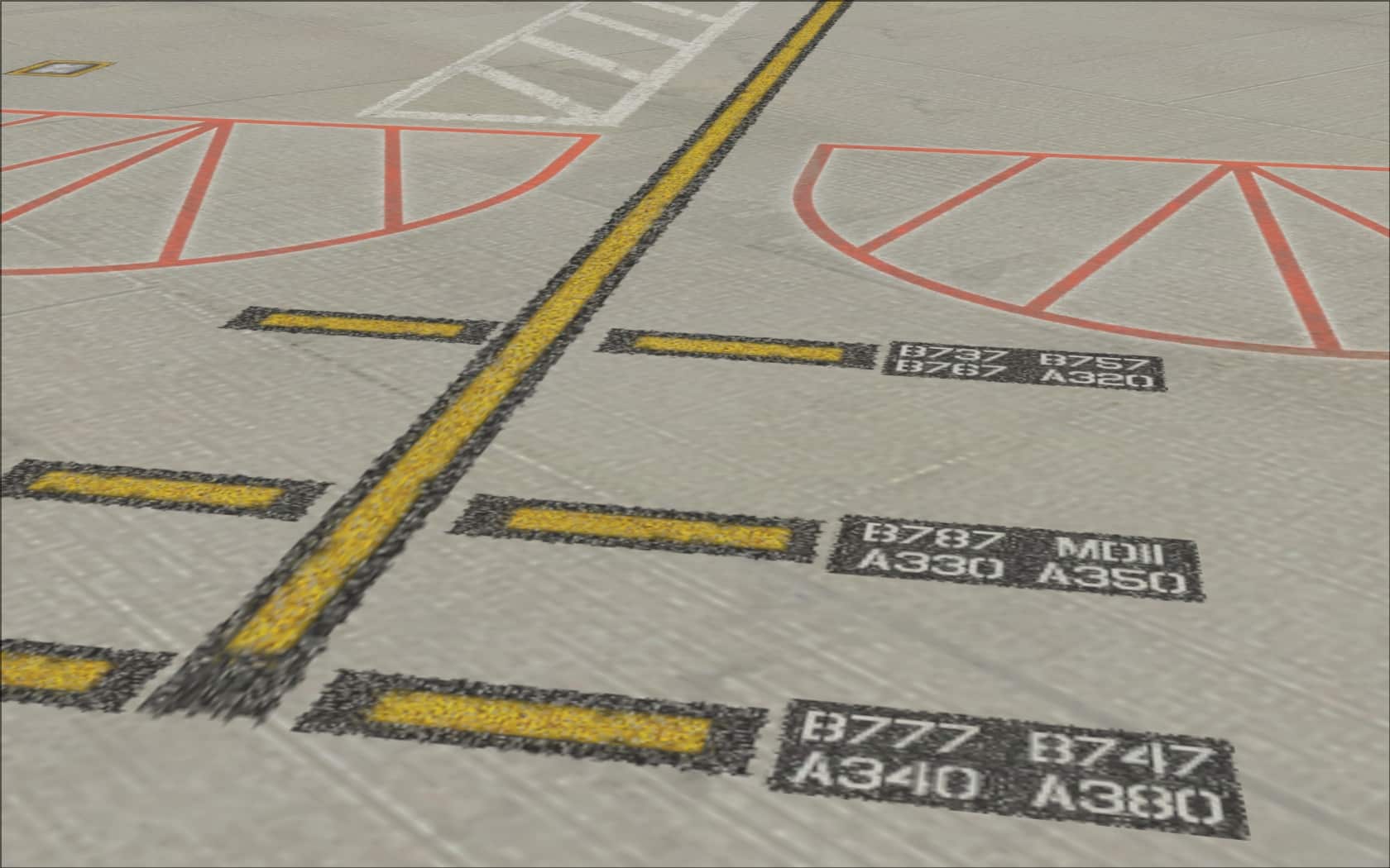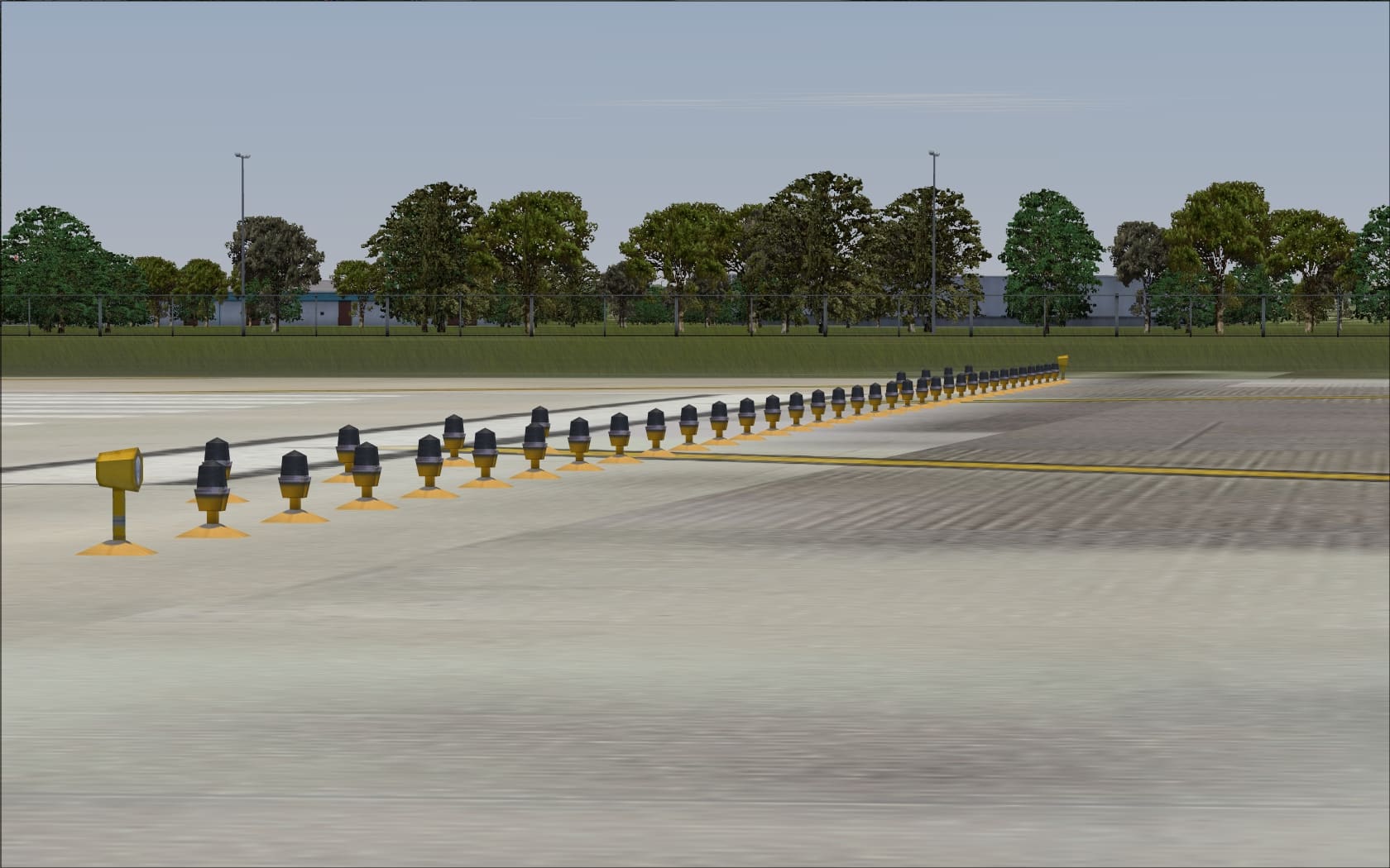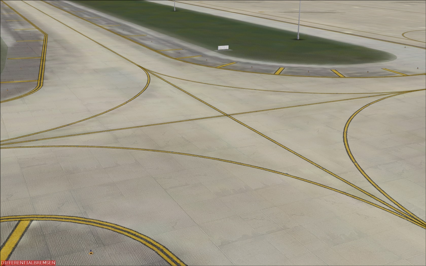 Gleiches trifft auf den Bereich der National Guard im Süd-Westen des Flughafens zu. Zwar sind die Rasenflächen mit 3D-Gras ausgestattet, doch auch hier kann Imagine Sim nicht überzeugen. Das frische Grün wirkt größtenteils leblos und statisch. An einigen Stellen sind Übergänge zwischen verschiedenen Texturen unsauber und verschwommen. Das Terminalvorfeld ist mit Verschmutzungen und Gebrauchsspuren wiederrum gut dargestellt. Hier überzeugen die scharfen Markierungen der Stop-Points für verschiedene Flugzeugtypen. Auch die Taxilines sind präzise und sauber gezeichnet. Alle Kreuzungen sind rund und kantenlos dargestellt. An vielen Stellen fehlt aber auch dort der Sinn für Details, zum Beispiel Reifenspuren auf den Taxiways.