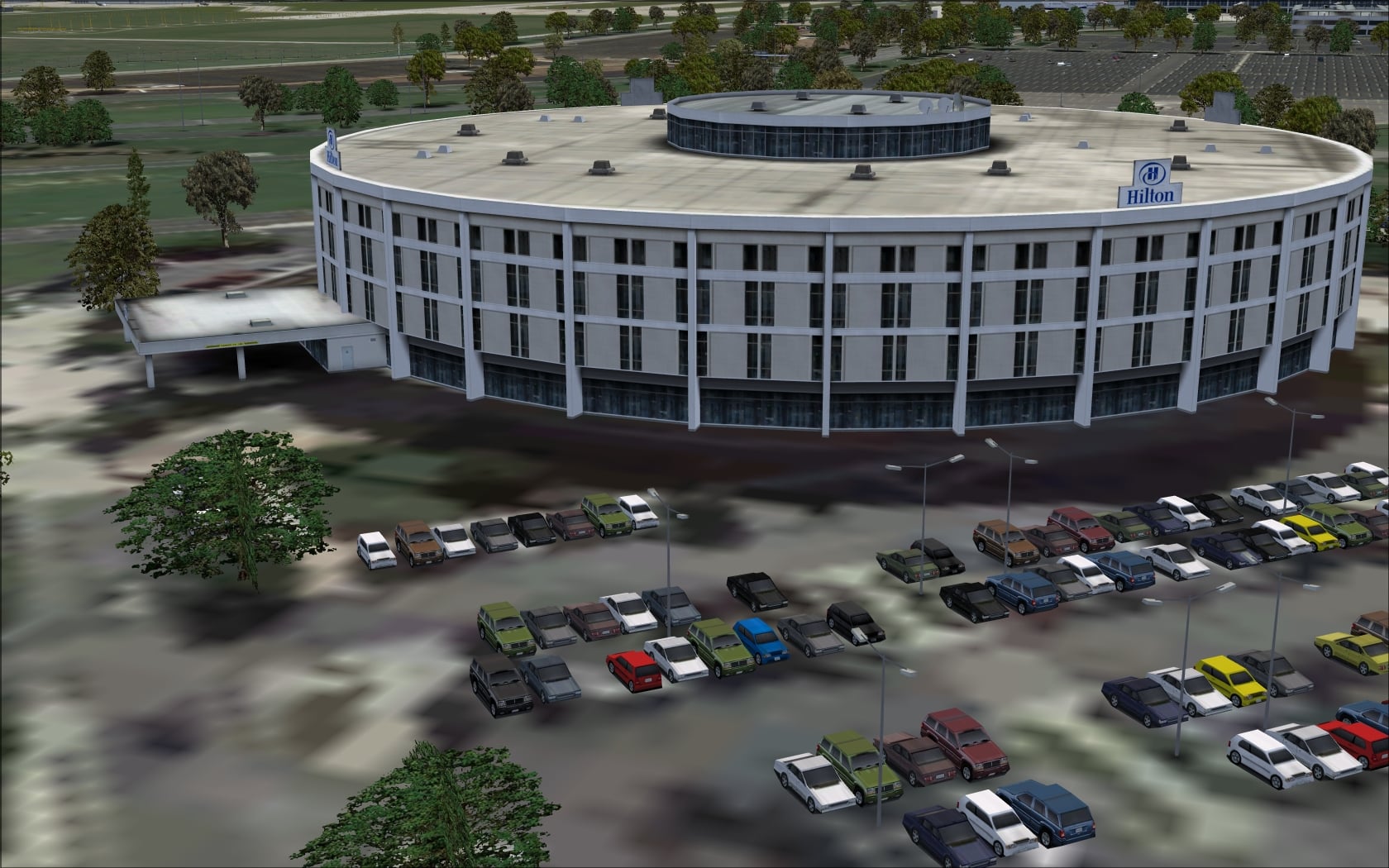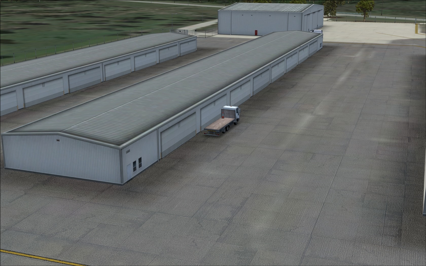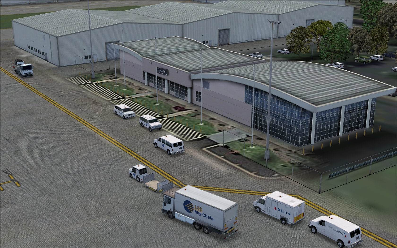 Obwohl die zahllosen Wagen sauber aufgereiht stehen, wurden sie nicht exakt gleich ausgerichtet, was einen sehr realistischen Eindruck hinterlässt. Leider fehlen den Parkpositionen ein paar Abnutzungsspuren. Verschmutzungen auf dem Boden, ähnlich wie im Terminalbereich, wären hier wünschenswert und würden den Gesamteindruck abrunden. Neben vier Lagerhallen, die sich in direkter Nähe zum Cargobereich befinden, existieren auch noch Hallen einzelner Fluggesellschaften ein wenig weiter südlich. Auch hier wurde mit detaillierten Fahrzeugen und scharfen Beschilderungen schön modelliert.