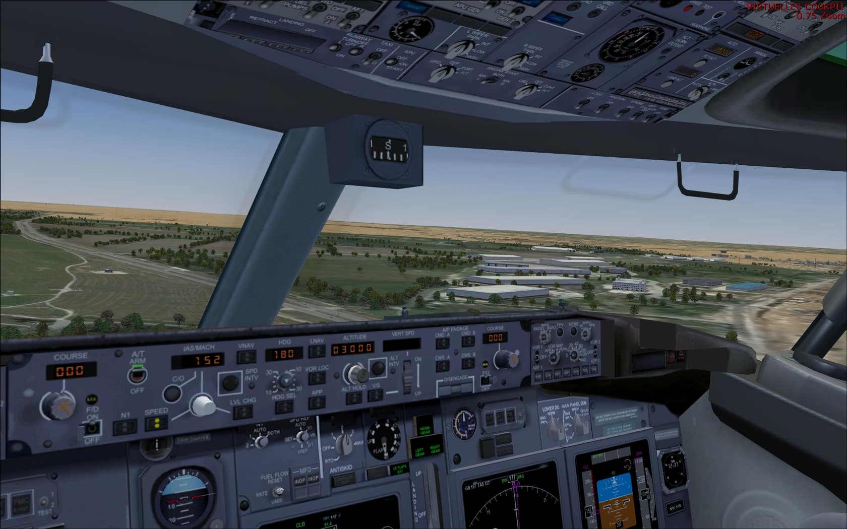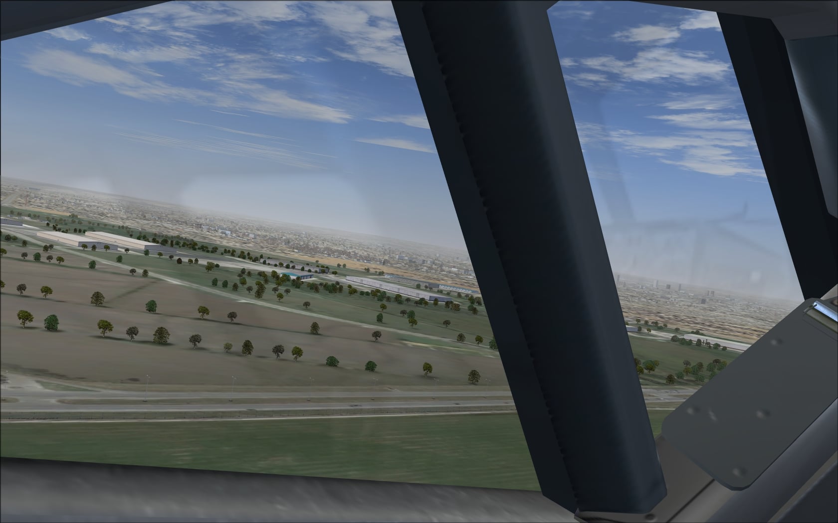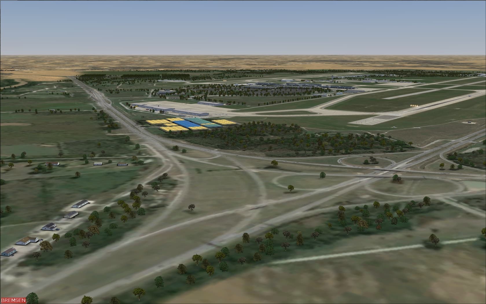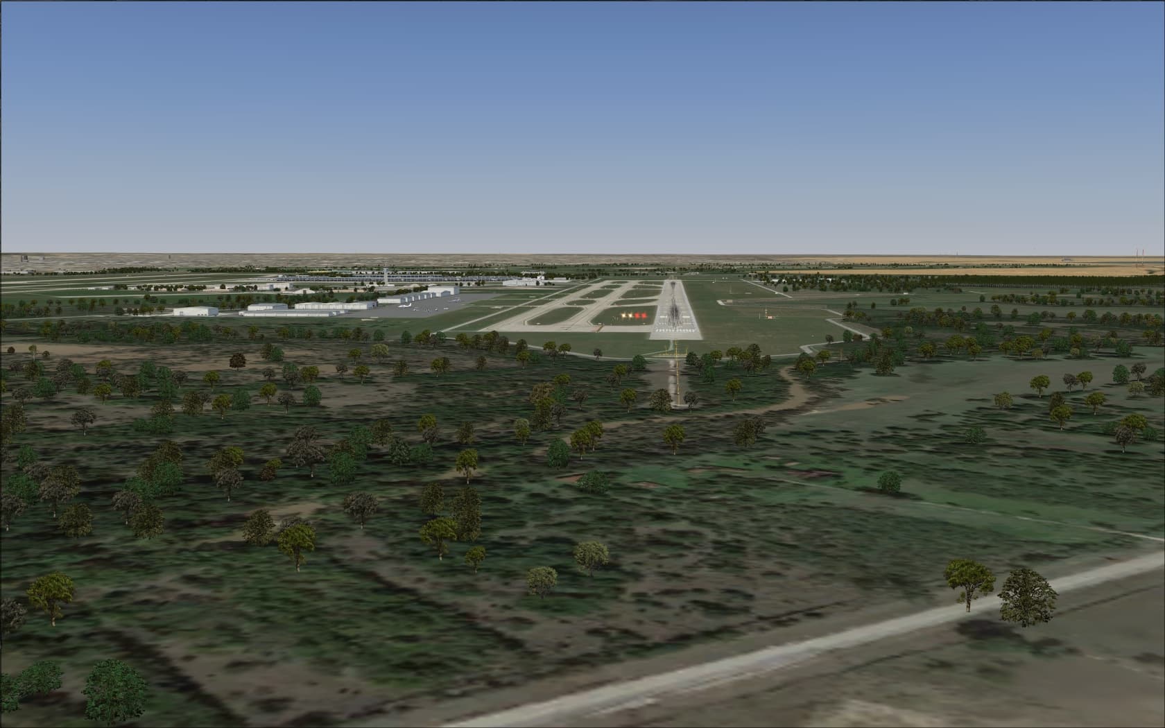 Verlässt man den Flughafen in Richtung Norden überfliegt man das Kreuz der US-Routes 71 und 183. Beide Schnellstraßen sind inklusive Laternen abgebildet. Leider ist der Süden des Flughafens weniger umfangreich gestaltet und die Szenerie weicht relativ früh einer beige-braunen Default-Einöde. Hinsichtlich der Schärfe der Bodentexturen kann man dem Entwickler wohl nur bedingt einen Vorwurf machen. An dieser Stelle zeigt der FS9 einmal mehr seine technischen Grenzen auf, die auch mit modernster Programmiertechnik nicht überschritten werden können. Die komplette Szenerie ist in frischem Grün gehalten, was deutlich realistischer ist, als das braun-beige Standardterrain in Texas. Leider fügen sich die knalligen Farben nicht sonderlich gut in das Default-Umfeld des Flugsimulators ein und es entstehen Bruchstellen. Vom Boden aus ist diese Schnittstelle zwar nicht zu sehen, im An- und Abflug macht sich der der brüchige Übergang allerdings bemerkbar.