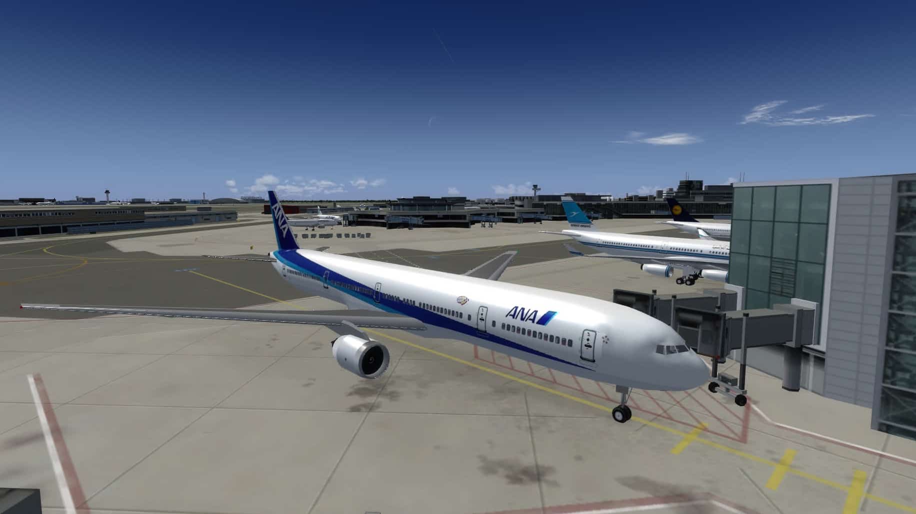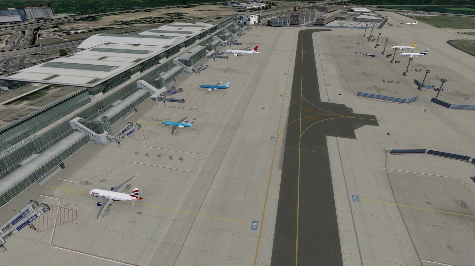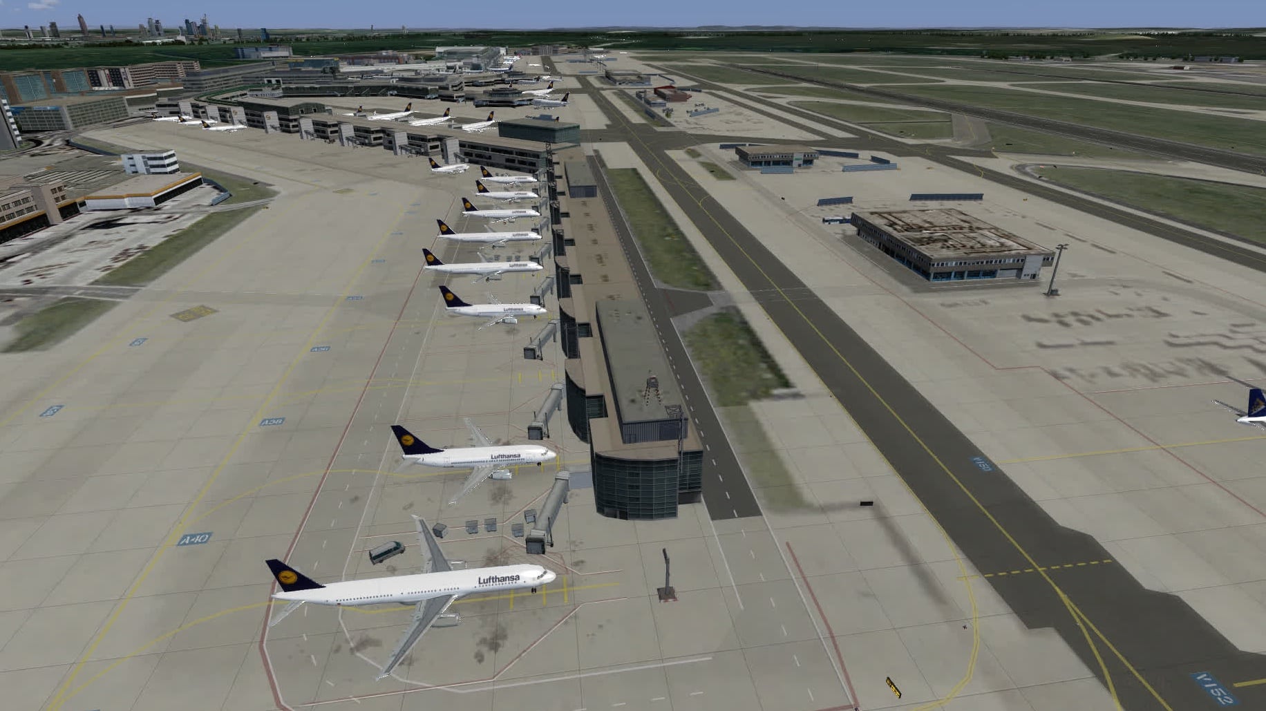 In Frankfurt sind die Parkpositionen insgesamt gut gefüllt. Was mir fehlt sind ein paar Frachtmaschinen neben der FedEx-MD-11, aber Terminal 1 und Terminal 2 sehen ganz gut aus. Die Platzierung stimmt grundsätzlich auch, aber das ist eher das Werk von Aerosoft.
