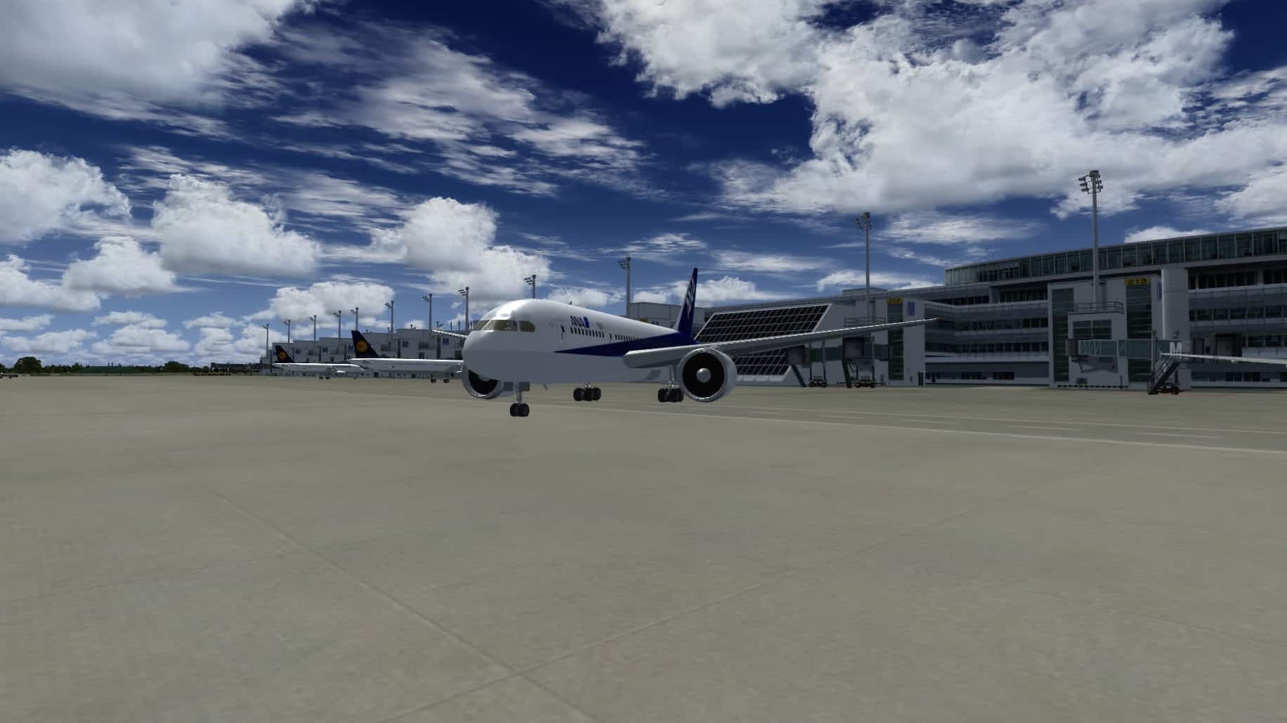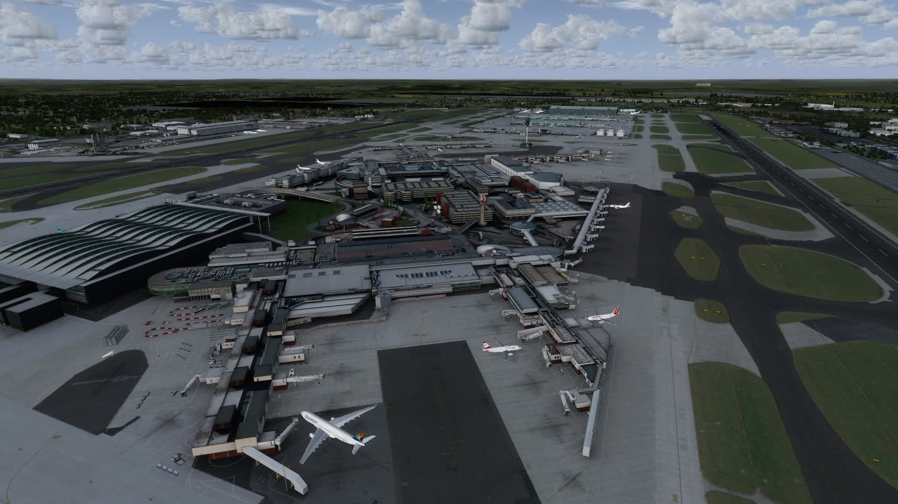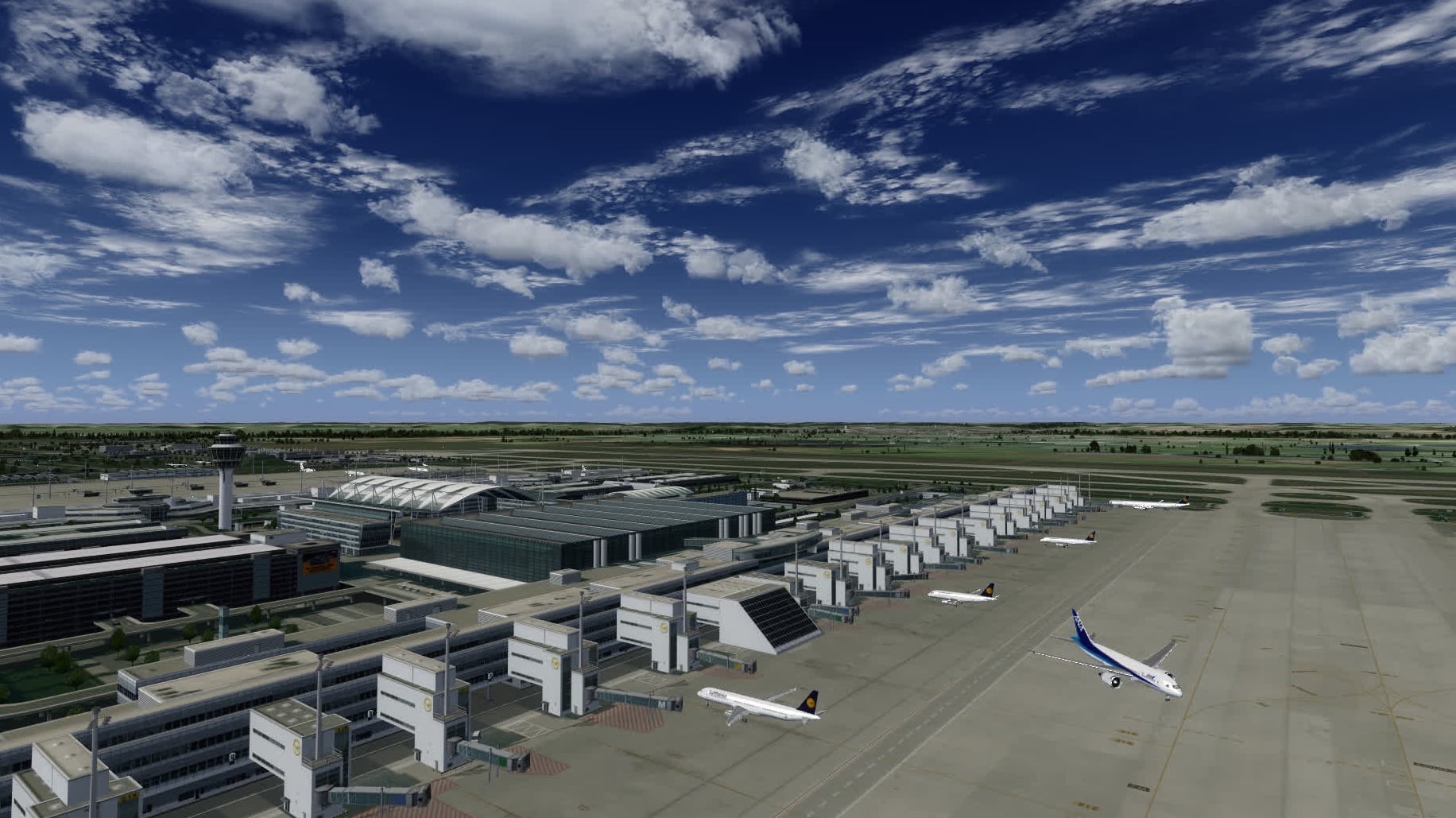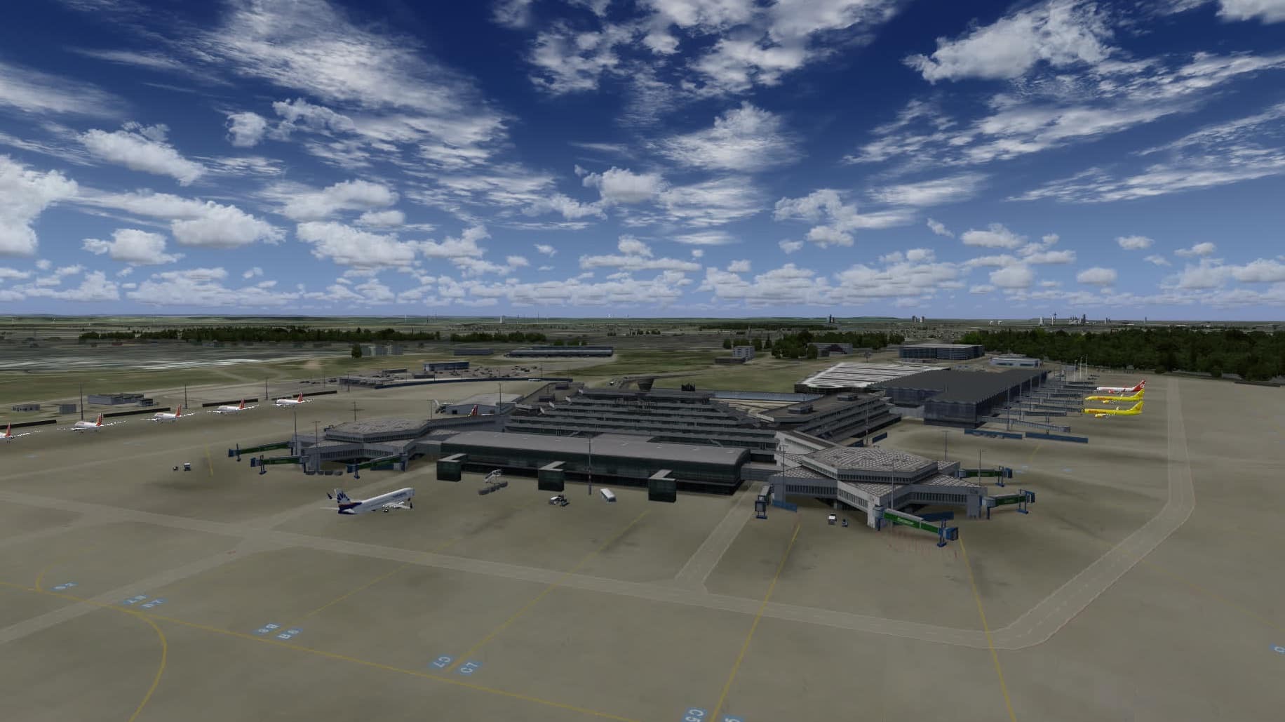 In Frankfurt sind die Parkpositionen insgesamt gut gefüllt. Was mir fehlt sind ein paar Frachtmaschinen neben der FedEx-MD-11, aber Terminal 1 und Terminal 2 sehen ganz gut aus. Die Platzierung stimmt grundsätzlich auch, aber das ist eher das Werk von Aerosoft.