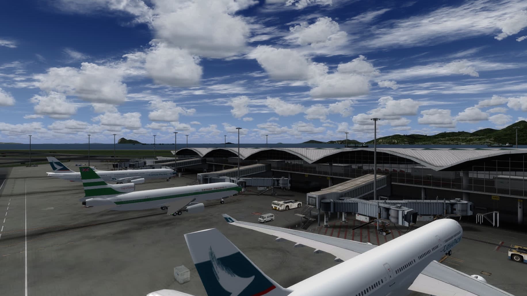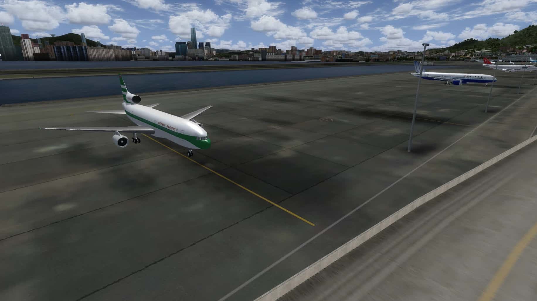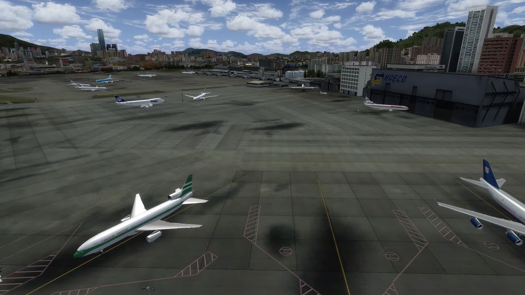 Oben hatte ich schon erwähnt, dass MyTraffic historische Flugpläne anbietet. Der Flugplan von 1995 sollte eigentlich AI-Flugzeuge auf den alten, legendären und seit 1998 stillgelegten Flughafen Hong Kong Kai Tak zaubern, das klappt aber nicht auf Anhieb: die paar Flugzeuge verlieren sich stattdessen auf dem riesigen Gelände von Chek Lap Kok.
