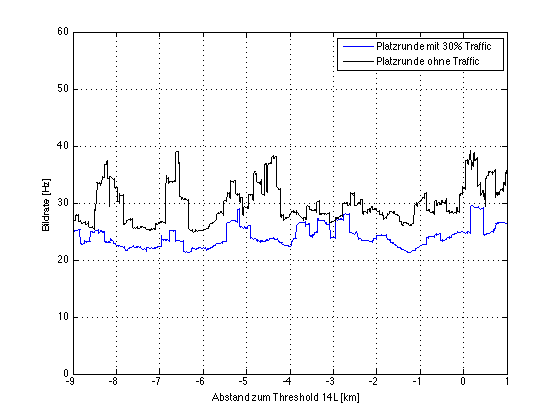 Der direkte Vergleich zeigt das auch nochmal: ja, die Framerate ist mit 30% Traffic geringer, aber noch akzeptabel. So sieht es beim Flug von Köln nach Frankfurt aus: