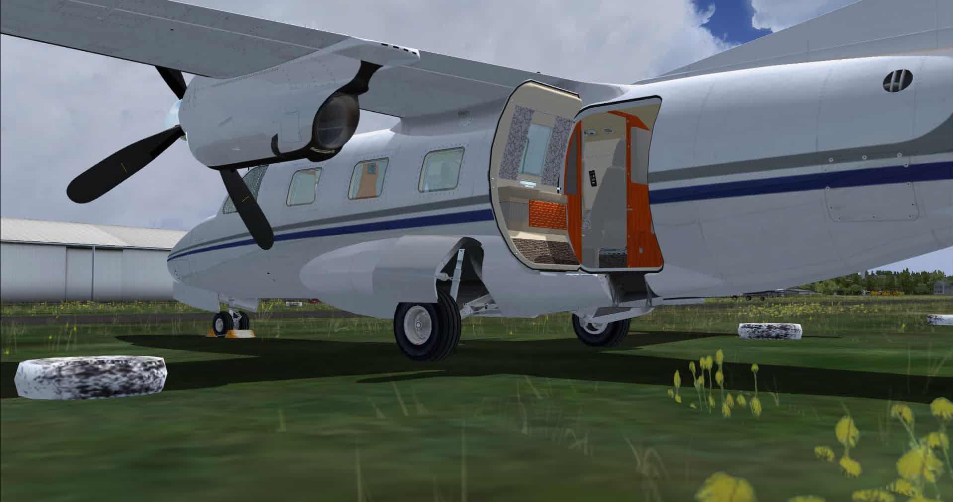 Angetrieben wird sie von der bekannten Garret TPE331-Turbine, hier mit 715 PS pro Seite. Die TPE331 besitzt eine einzige Welle, auf der dreistufiger Verdichter und zweistufige Turbine sitzen. Der Antrieb des konstant laufenden Propellers erfolgt über ein Untersetzungsgetriebe. In der FS-Welt könnte man diesen Antrieb zum Beispiel aus der OV-10B Bronco oder der Jetstream 41 (hier mit etwa der doppelten Leistung) kennen.
