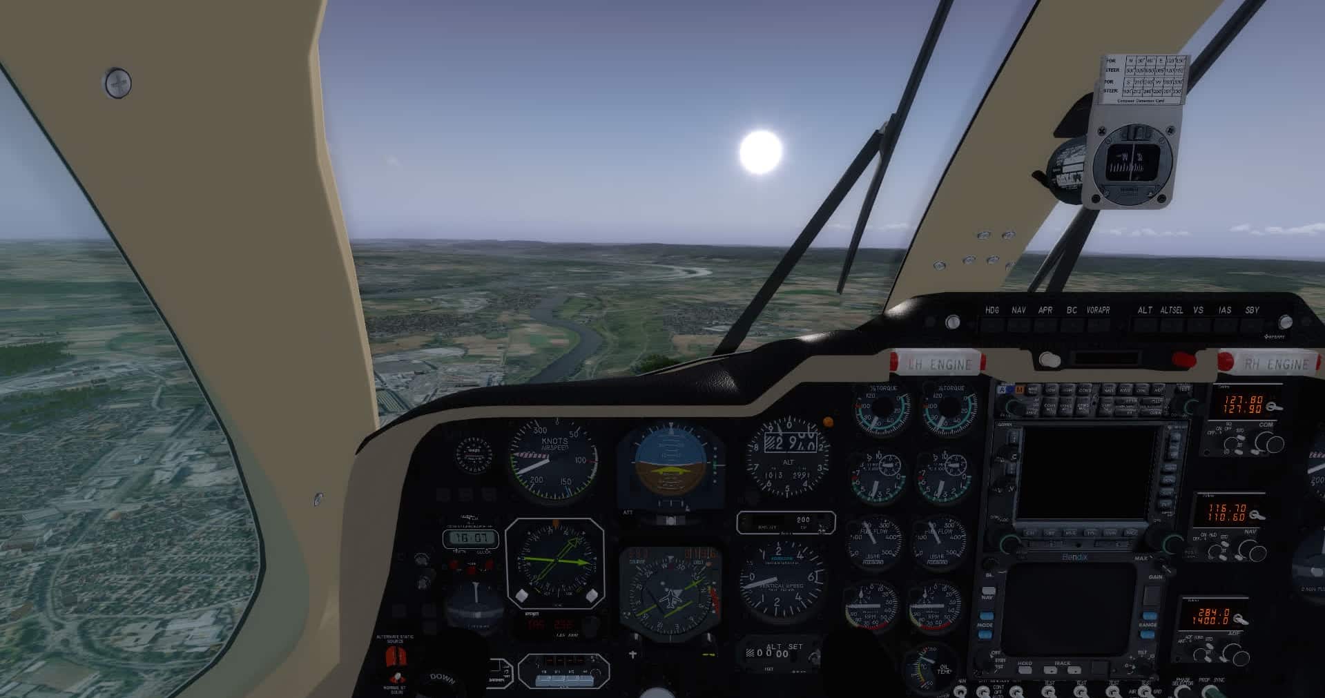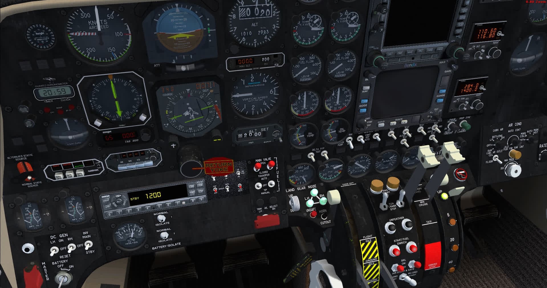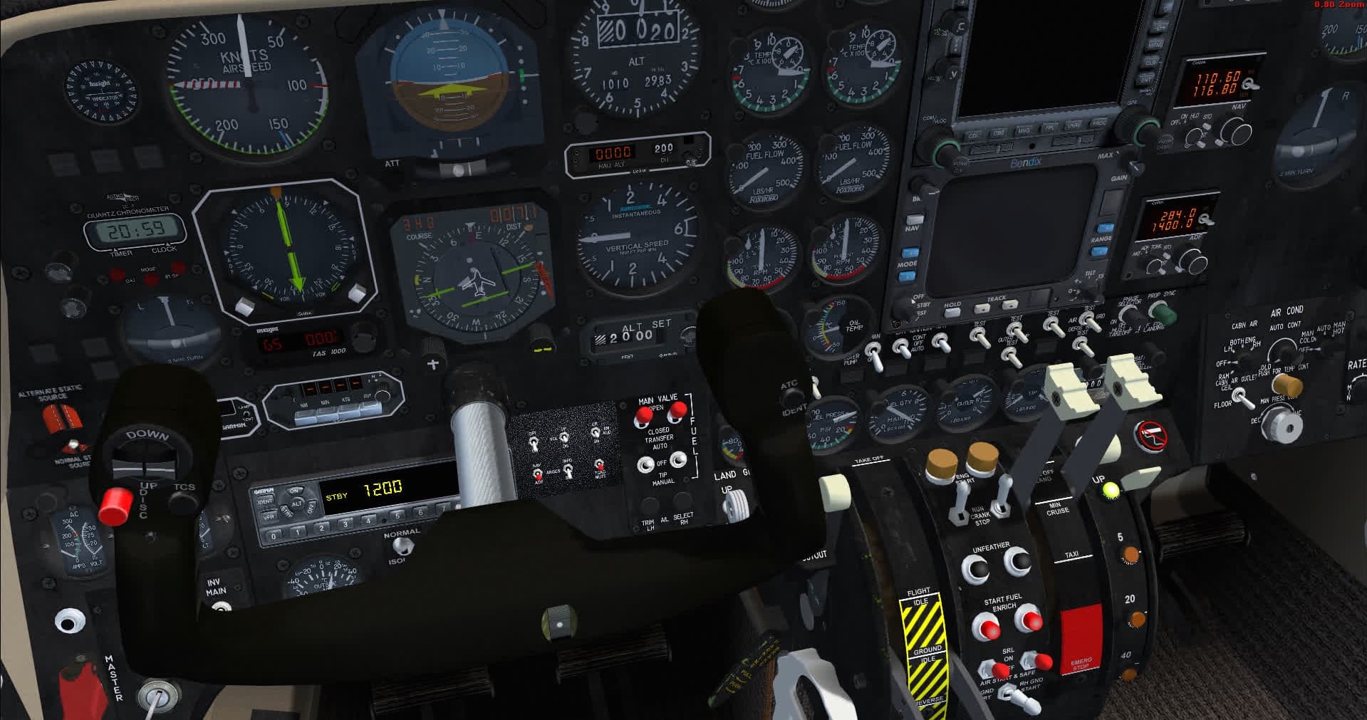 Weiterhin gibt es Konfigurationen, mit denen Reality’s XP 500 Wetterradar oder ein GTN 750 GPS verwendet werden kann – ansonsten ist das Standard-FSX-GPS montiert (und dient auch zum Einstellen von COM1 und NAV1).
