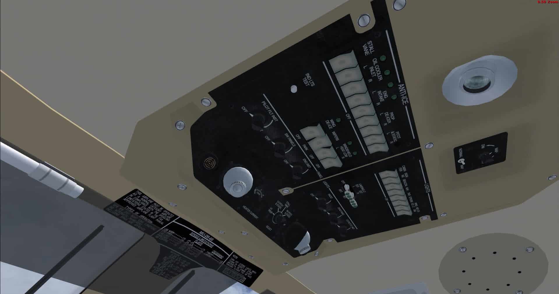 Die Nachtbeleuchtung des Cockpits verwendet nur andere Texturen und lässt sich damit nicht in der Helligkeit regeln. Es gibt drei verschiedene Schalter im Overhead und einen an den Sicherungen, die alle parallel geschaltet sind – klickt man zum Beispiel auf den Lichtschalter an den Sicherungen, dann gehen gleichzeitig auch alle anderen Beleuchtungen an.
