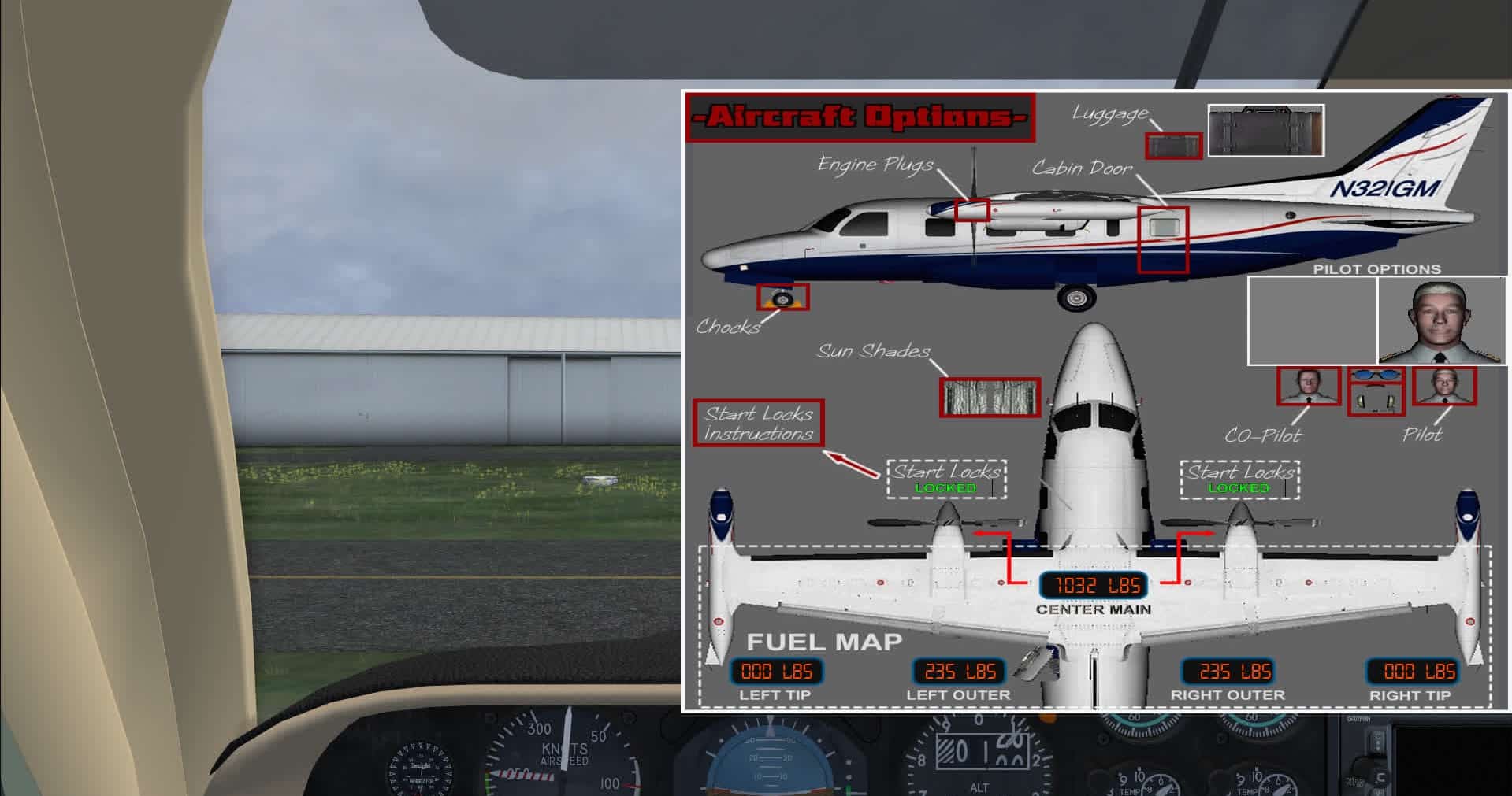 Es gibt eine den A2A-Flugzeugen ähnliche Konfigurationsmöglichkeit über Shift+2, mit der sich einzelne optische Gimmicks einstellen lassen, und man kann von diesem Konfigurator den Zustand der Start-Locks und des Tanks prüfen. Einstellen aber nicht – Betanken und Beladen klappt nur über den FSX-Dialog.