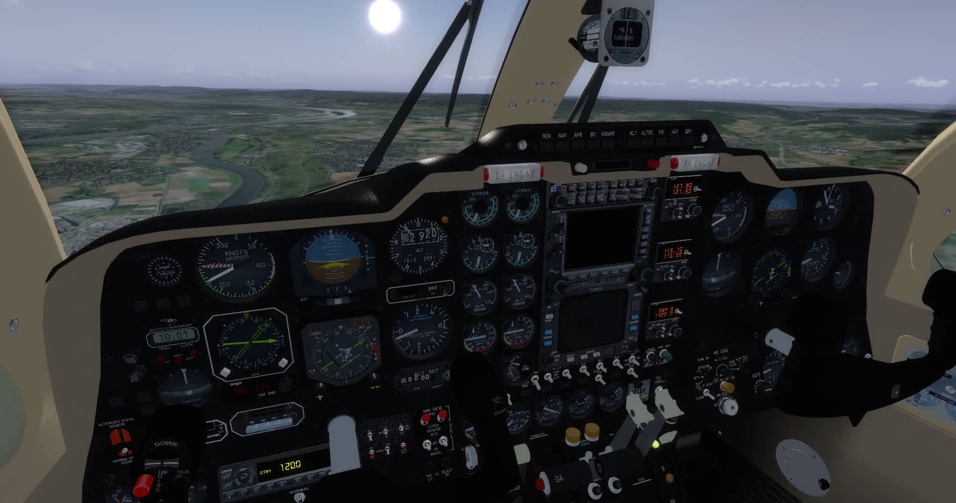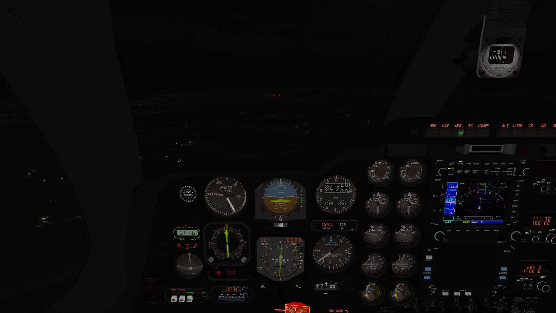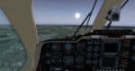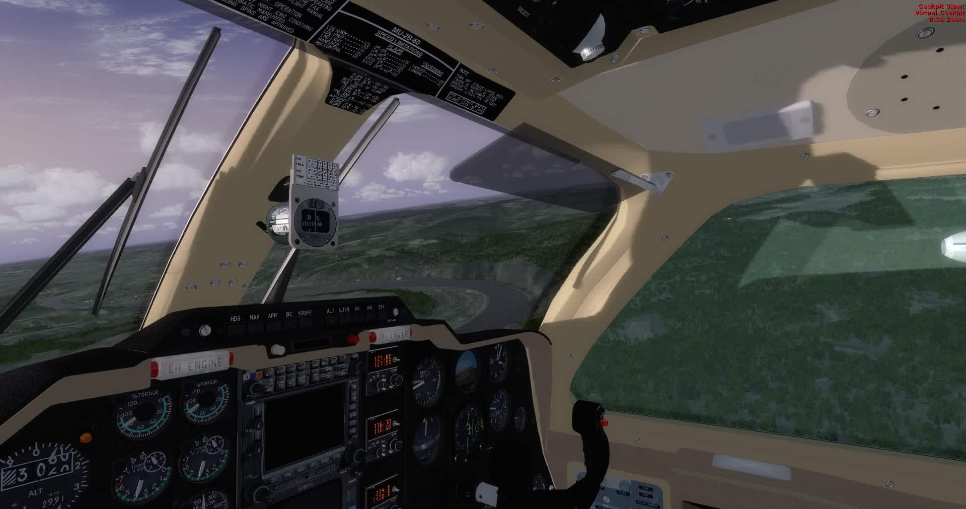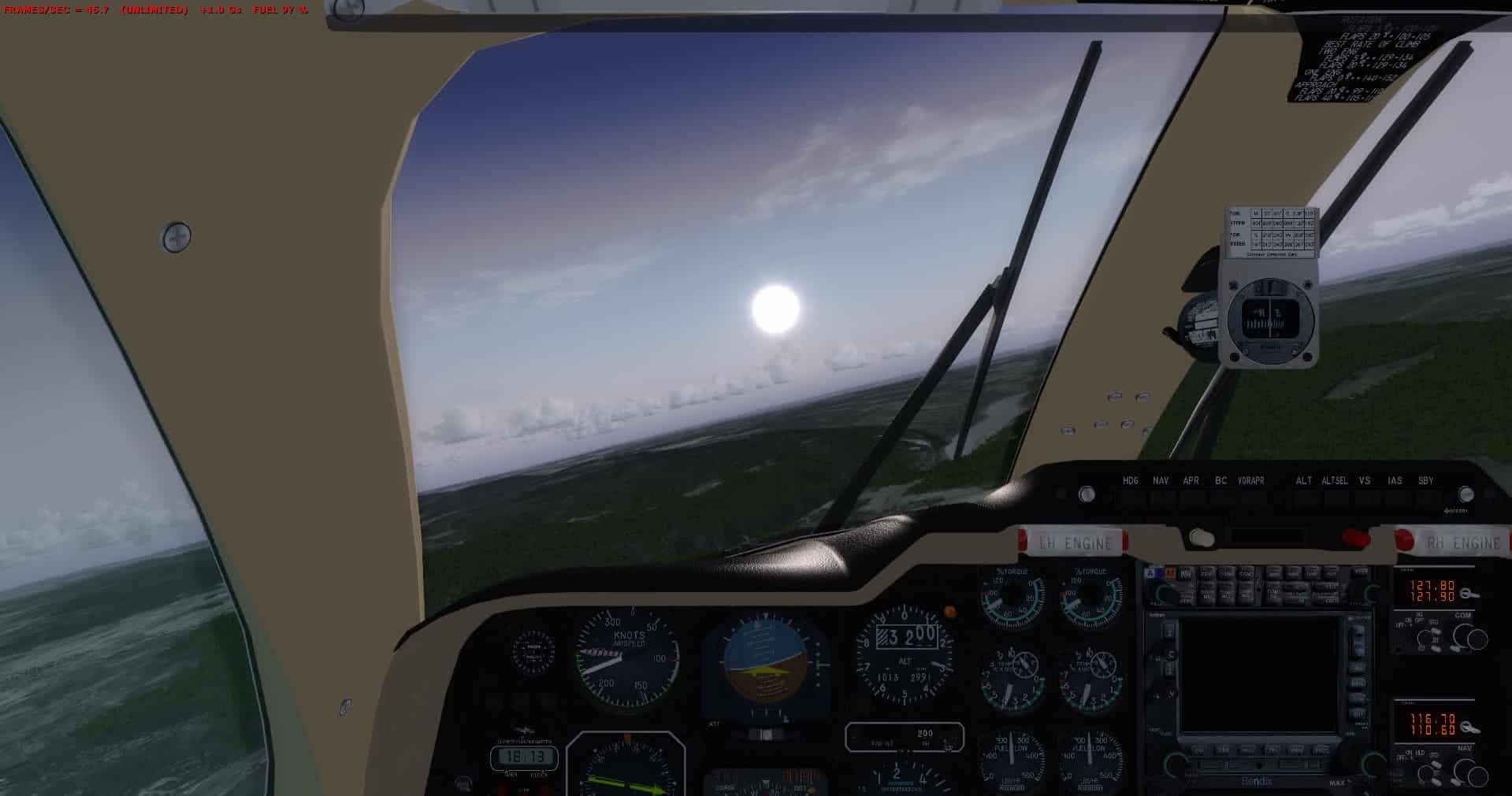 Im Flug ist die Bedienung des Turboprops sehr einfach – Schwierigkeiten mit zu hoher Turbinentemperatur (wie zum Beispiel bei der JS41 oder der Twin Otter) hatte ich nicht. Ein Turboprop erfordert ja nicht nur das Steuern des Schubs, sondern auch der Propellergeschwindigkeit. Das geschieht über die sogenannten Condition Levers. Das funktioniert leider nicht wie erwartet, denn ein Bewegen des Hebels im Bereich Cruise ändert nichts an der Drehzahl. Ein Bewegen des Hebels hin zum Bereich Taxi ändert die Drehzahl, aber es scheint keine direkten Auswirkungen auf die Turbinentemperatur zu geben. Zum Vergleich: PMDG’s Jetstream hätte schon beim Versuch mit einem Triebwerksbrand reagiert.
