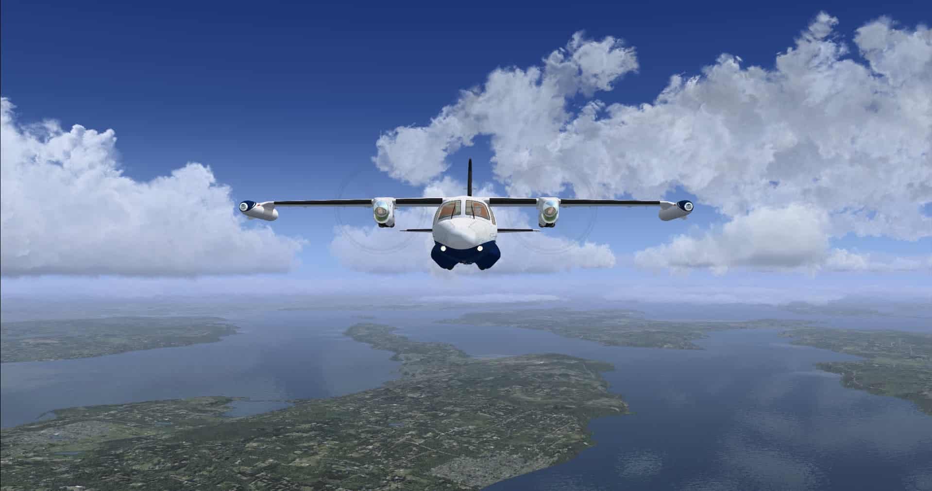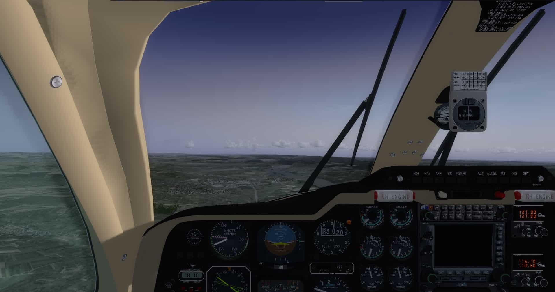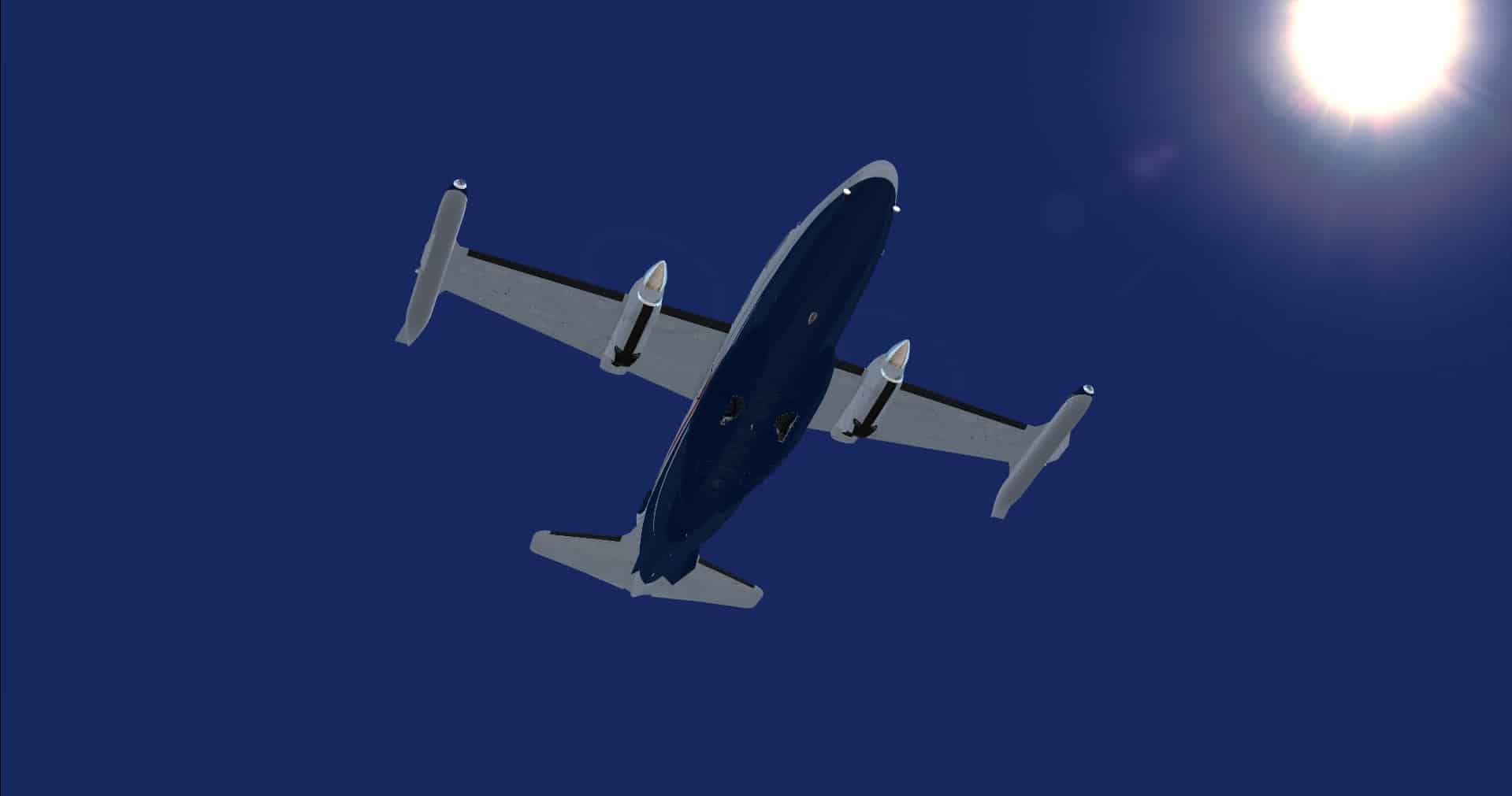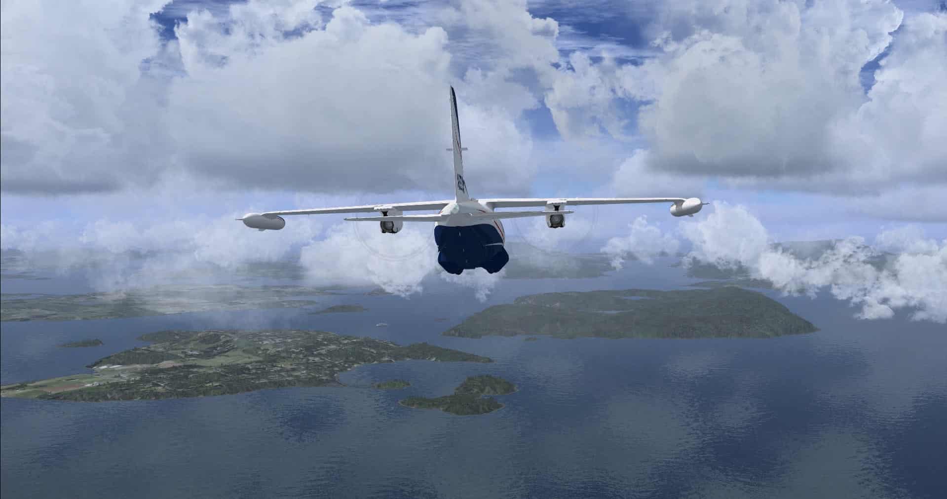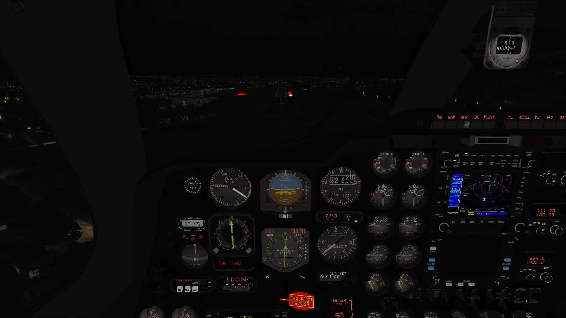 Im Flug ist die Bedienung des Turboprops sehr einfach – Schwierigkeiten mit zu hoher Turbinentemperatur (wie zum Beispiel bei der JS41 oder der Twin Otter) hatte ich nicht. Ein Turboprop erfordert ja nicht nur das Steuern des Schubs, sondern auch der Propellergeschwindigkeit. Das geschieht über die sogenannten Condition Levers. Das funktioniert leider nicht wie erwartet, denn ein Bewegen des Hebels im Bereich Cruise ändert nichts an der Drehzahl. Ein Bewegen des Hebels hin zum Bereich Taxi ändert die Drehzahl, aber es scheint keine direkten Auswirkungen auf die Turbinentemperatur zu geben. Zum Vergleich: PMDG’s Jetstream hätte schon beim Versuch mit einem Triebwerksbrand reagiert.