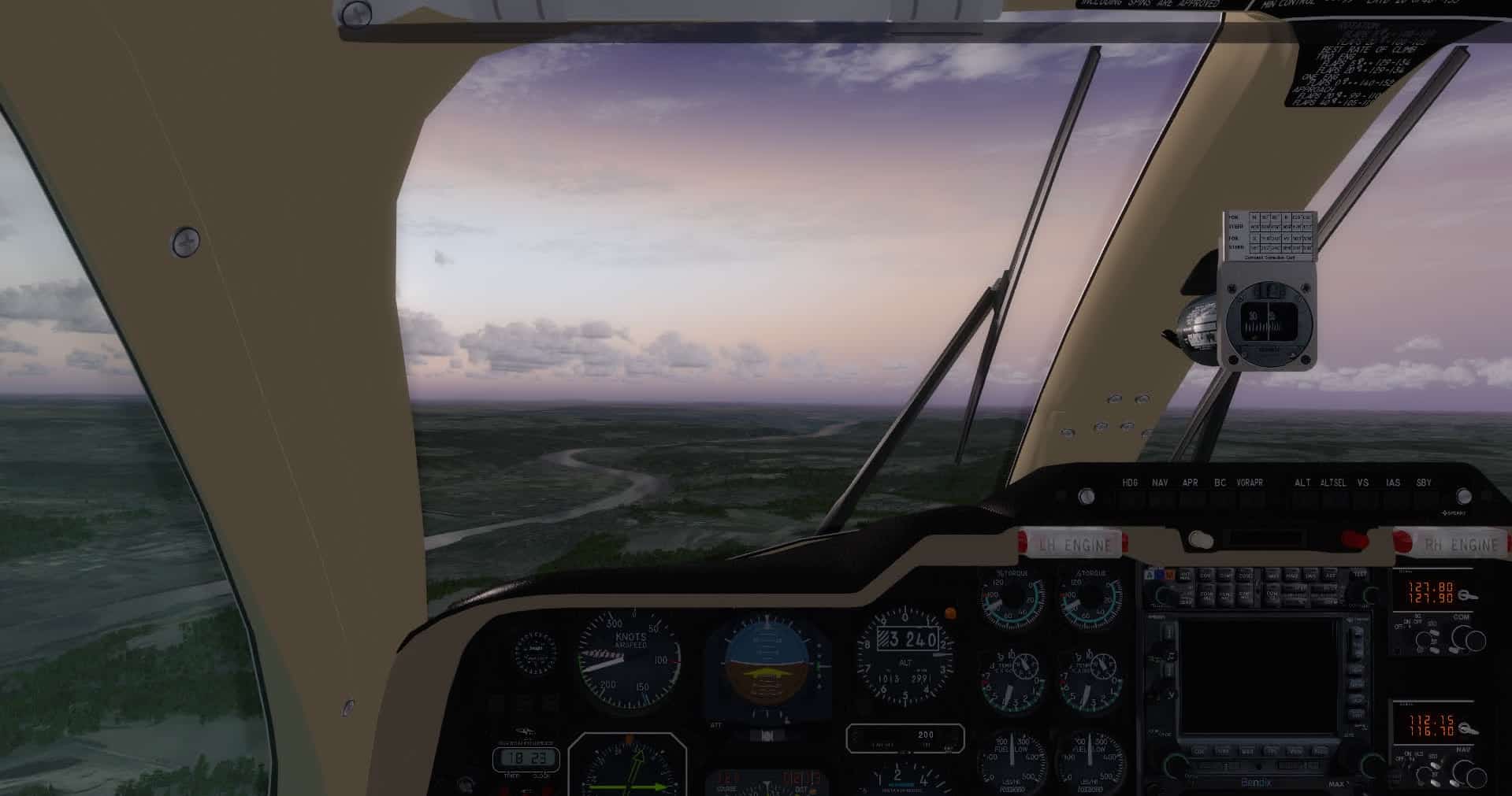 In der Realität hat die Mitsubishi übrigens Rastungen der Schubhebel unter anderem bei Flight Idle. Das hat mein Joystick nicht, und deshalb lande ich im Flug auch oft unterhalb des Minimalschubs. PMDG’s JS41 verhindert das – Flysimware aber nicht. Man sollte daher, wenn man realistisch fliegen möchte, aufpassen, die Schubhebel nicht zu weit zurückzuziehen. Flysimware’s MU-2B gibt dann lediglich Propellergeräusche von sich, die so klingeln, als würde die Drehzahl sinken, das ist aber laut der Instrumente nicht so.